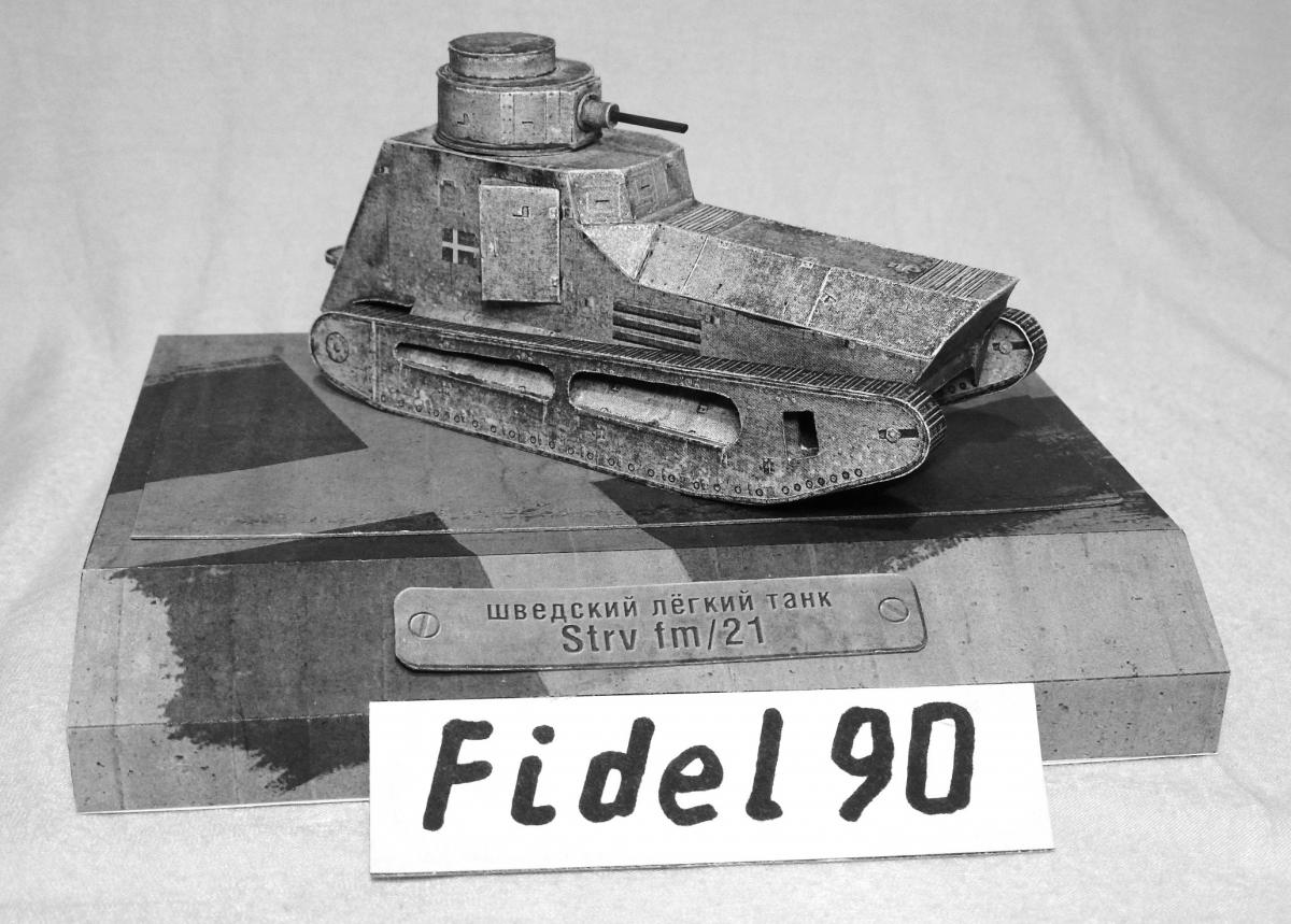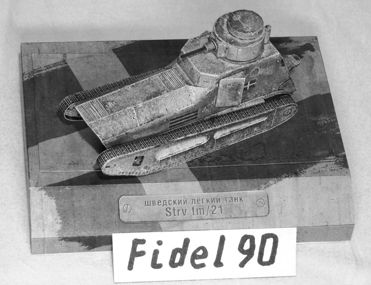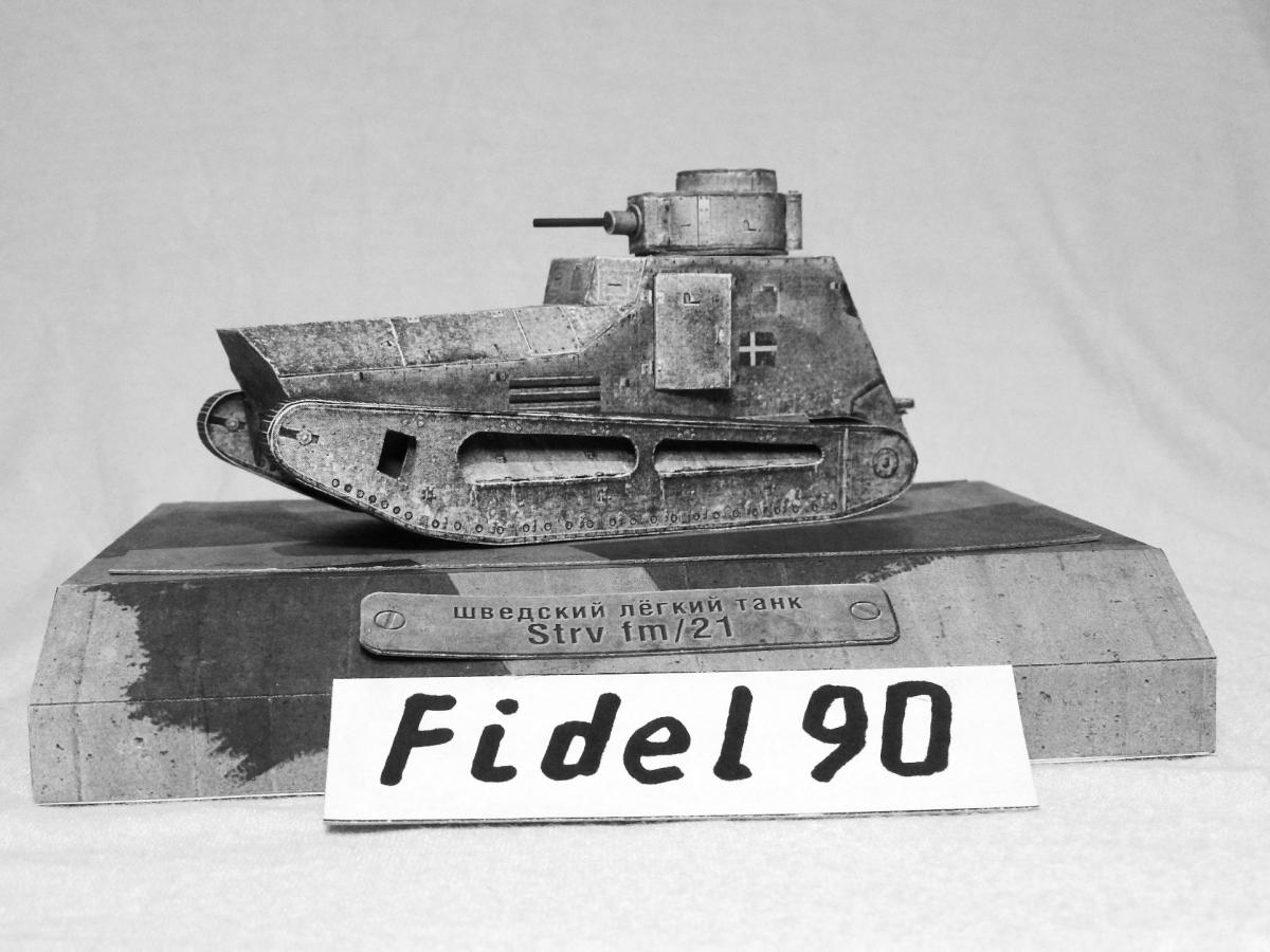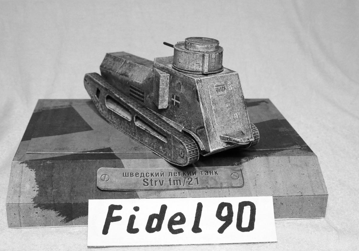 Опоздал на конкурс БК. Так что выкладываю здесь. модели "Strv fm 21 http://cdn-frm-eu.wargaming.net/wot/ru/uploads/monthly_04_2018/post-20700721-0-37054400-1522697986_thumb.jpg Ещё фото Почему ч/б фото? Потому что делал из листов напечатанных на лазерном принтере ч/б. Поэтому уже на компе убрал цветность. Захотелось посмотреть как получится из тонкой бумаги. И как сам процесс постройки из неё. Некоторые иногда пытаются и выкладывают. Оказалось гораздо труднее. Бумага тонкая, форму не держит, краска сыпется... Картону пришлось много вклеить. Из плюсов только одно - краску для торцев подбирать не надо, всё карандашом простым рисуется )) Так что если есть 100р. то лучше сходить и распечатать в ближайшую фото-контору на нормальной бумаге. ))