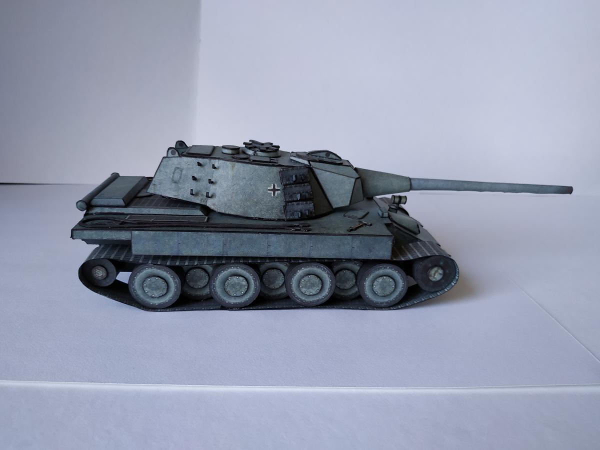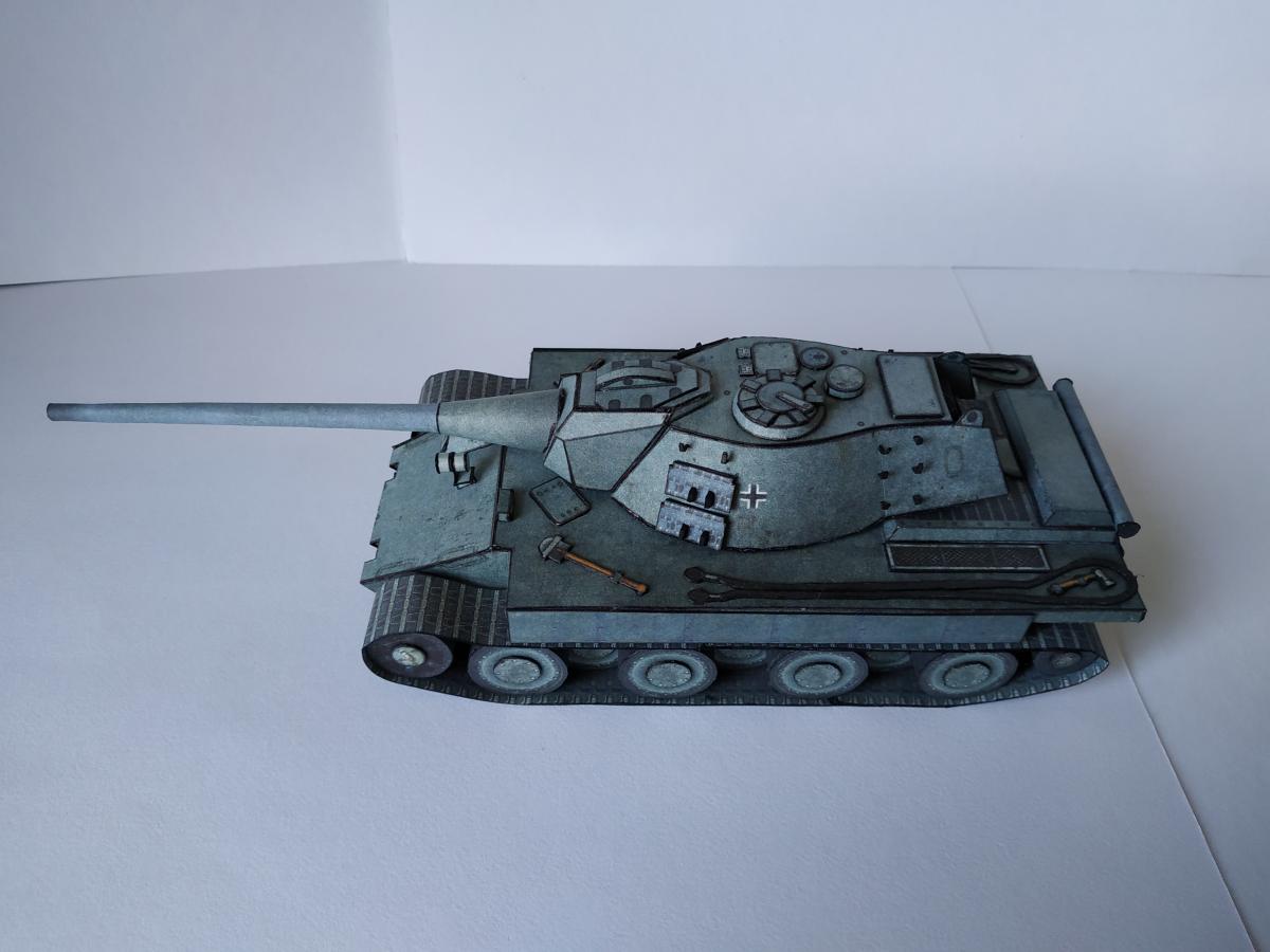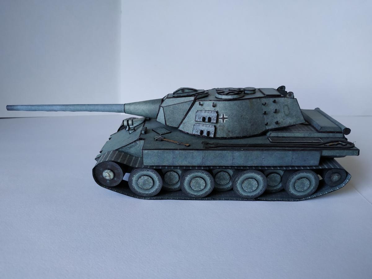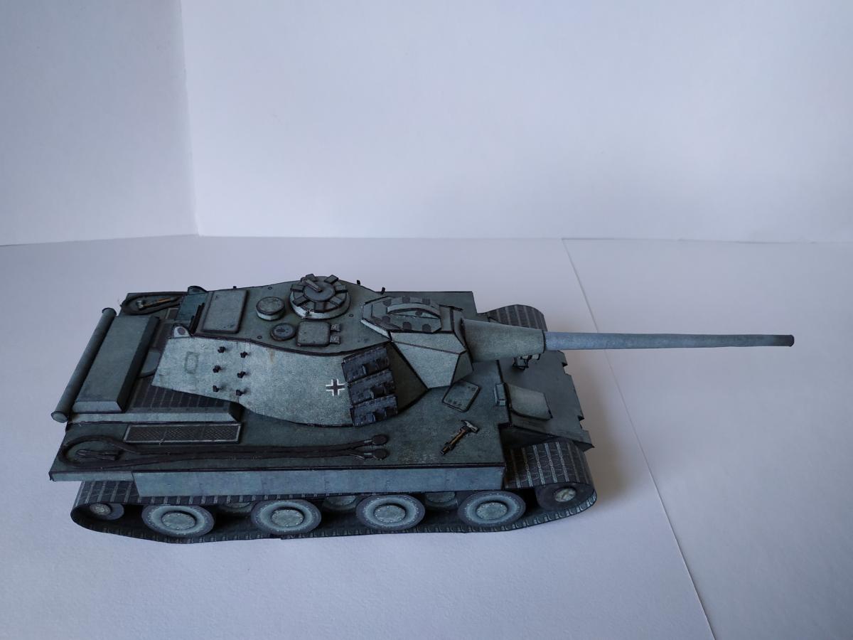 Ну позвольте представить E-79 ausf B. Почему В? Потому, что в конструкцию внесены некоторые изменения, так например упрощенная маска (добавлены клапана упрощающие склейку) и немного уменьшена длинна орудия (собрать такую удочку, которая была в оригинале, даже из офиски мне не удалось). Немного упростил конструкцию бортов (наклонная фаска на большой длине это нечто). Бортовые экраны пришлось использовать, так как ухитрился взять модель не очень сухой рукой-краска поплыла, но мне кажется вписалось неплохо. Ну и в целом немного переделал корпус-мне кажется изначально конструкция была переусложнена. Добавлена фара от КТ от WoT, траки на башне от него жеЗ.Ы. Корпус дважды переделывал с нуля З.Ы. 1. Написано масштаб 1:50, но мне кажется машина немного крупнее. Вот тут краткая история и ТТХ http://cdn-frm-eu.wargaming.net/wot/ru/uploads/monthly_09_2019/post-1087-0-62316900-1567449737_thumb.jpg http://cdn-frm-eu.wargaming.net/wot/ru/uploads/monthly_09_2019/post-1087-0-78585700-1567449923_thumb.jpg http://cdn-frm-eu.wargaming.net/wot/ru/uploads/monthly_09_2019/post-1087-0-65462600-1567449938_thumb.jpg http://cdn-frm-eu.wargaming.net/wot/ru/uploads/monthly_09_2019/post-1087-0-17786200-1567449957_thumb.jpg http://cdn-frm-eu.wargaming.net/wot/ru/uploads/monthly_09_2019/post-1087-0-07982300-1567449971_thumb.jpg http://cdn-frm-eu.wargaming.net/wot/ru/uploads/monthly_09_2019/post-1087-0-54403500-1567449985_thumb.jpg http://cdn-frm-eu.wargaming.net/wot/ru/uploads/monthly_09_2019/post-1087-0-90518100-1567449998_thumb.jpg http://cdn-frm-eu.wargaming.net/wot/ru/uploads/monthly_09_2019/post-1087-0-67478500-1567450017_thumb.jpg http://cdn-frm-eu.wargaming.net/wot/ru/uploads/monthly_09_2019/post-1087-0-65971200-1567450031_thumb.jpg http://cdn-frm-eu.wargaming.net/wot/ru/uploads/monthly_09_2019/post-1087-0-25657000-1567450060_thumb.jpg http://cdn-frm-eu.wargaming.net/wot/ru/uploads/monthly_09_2019/post-1087-0-83493600-1567450076_thumb.jpg http://cdn-frm-eu.wargaming.net/wot/ru/uploads/monthly_09_2019/post-1087-0-99230000-1567450093_thumb.jpg http://cdn-frm-eu.wargaming.net/wot/ru/uploads/monthly_09_2019/post-1087-0-45909200-1567450107_thumb.jpg