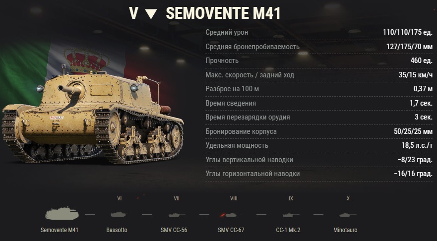 Semovente M41 Итальянская ПТ-САУ 5 уровня Исследование новой ветки итальянских самоходок начинается со среднего танка IV уровня P26/40. Вам понадобится около 12 650 опыта, чтобы исследовать Semovente M41— стартовую машину ветки. Благодаря сохранившимся чертежам и архивным материалам мы смогли дать этим концептам вторую жизнь и воссоздать шесть игровых машин такими, какими они могли бы существовать в реальности. Semovente M41 — переходная машина V уровня. Вместо башни у неё неподвижная рубка с 75‑мм орудием. Обладая дальностью обзора в 350 метров и отличными показателями маскировки (26, 22% - для неподвижной машины),Semovente M41 просто создана для засадного стиля игры. Самоходка довольно медленная, а отличные показатели маскировки диктуют скрытный стиль игры. ТТХ техники Важно: Тема является стартовой. Любой пользователь может подготовить гайд и получить в качестве награды статус на форуме и золото, информация для игроков по созанию гайдов, находится тут. Если гайд будет хорошо написан, то его выберут основной темой по танку, а данная тема будет закрыта.