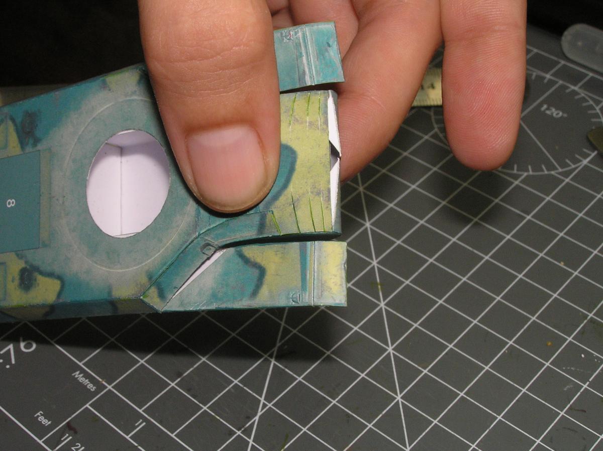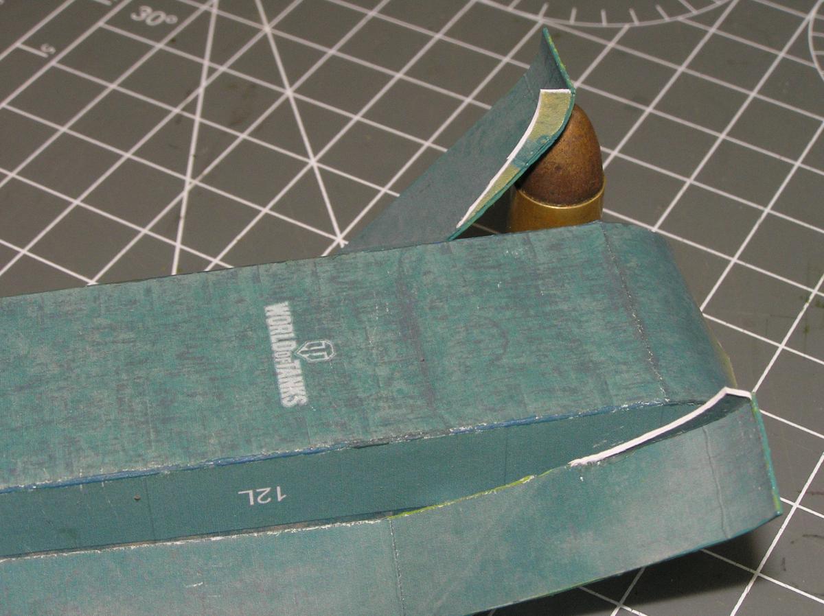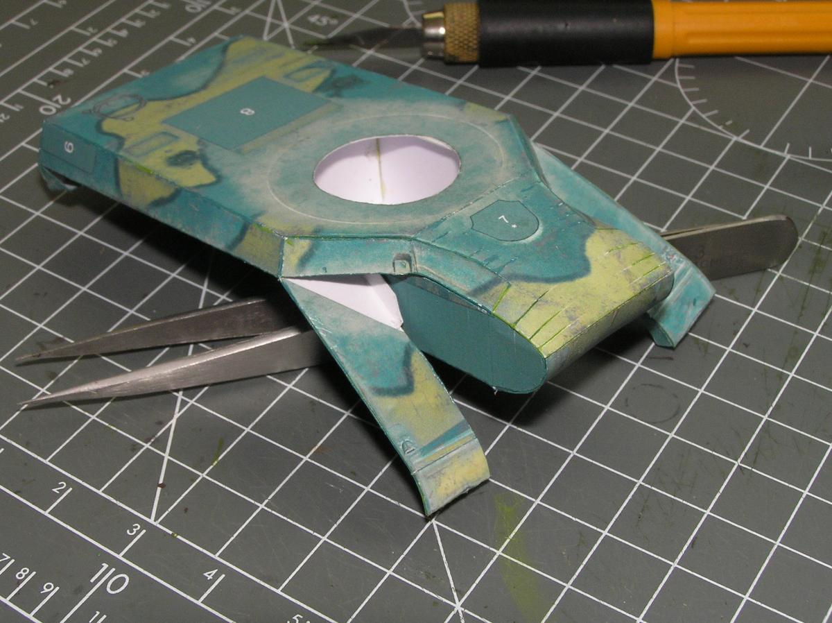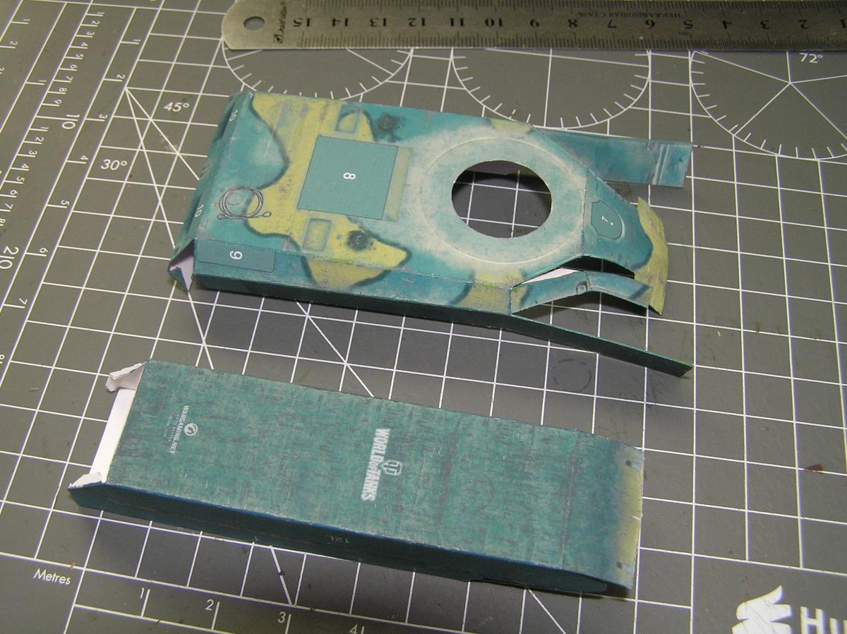 http://cdn-frm-eu.wargaming.net/wot/ru/uploads/monthly_10_2015/post-4861458-0-94382300-1445345369.jpg Всем привет! Собираем вместе модель танка "AMX 50 B. Бронекоробочка" (автор Targo_Kain, стиль изложения сохранен). Рекомендуем перед началом сборки ознакомиться с статьей о инструментах и материалах для бумажного моделизма. Автор и его полезные советы уже известны по статьям по сборке моделей: "Японский Тигр", танка Т-54, ИС-2 и ПТ-САУ: Charioteer, но есть и новые полезные нюансы: 1 http://cdn-frm-eu.wargaming.net/wot/ru/uploads/monthly_10_2015/post-4861458-0-84110200-1445348311_thumb.jpg Начнём, как обычно, с "чистого листа". А точнее, возьмём несколько листов плотной бумаги 180 г/м и распечатаем развёртки модели. 2 http://cdn-frm-eu.wargaming.net/wot/ru/uploads/monthly_10_2015/post-4861458-0-18485100-1445348314_thumb.jpg Первым делом - корпус. У этого танка он не совсем простой. Ванна корпуса на фото уже почти собрана, тут всё как обычно – на ровной поверхности вклеим силовые элементы. И приступим к верхней части – это деталь 1. Сделаем все надрезы, линии сгиба и подкрасим торцы. На фото видна крышечка с краской – это я смешивал краски, ярко синюю и ярко зелёную дабы добиться нужного оттенка – в нашей игре у французов весьма занятный зелёный цвет с бирюзовым отливом. 3 http://cdn-frm-eu.wargaming.net/wot/ru/uploads/monthly_10_2015/post-4861458-0-17802400-1445348315_thumb.jpg На этом фото видно что ВЛД детали 1 придана слегка округлая форма – прокатываем стальным шариком или чем то похожим для придания формы и что бы сошлись боковые надрезы на ВЛД. 4 http://cdn-frm-eu.wargaming.net/wot/ru/uploads/monthly_10_2015/post-4861458-0-16578900-1445348316_thumb.jpg Всё та же деталь 1, показана боковая внутренняя подклейка под ВЛД для того чтобы ровно приклеить «щёку» ВЛД – на фото справа, между левым крылом и левой стороной ВЛД. 5 http://cdn-frm-eu.wargaming.net/wot/ru/uploads/monthly_10_2015/post-4861458-0-30936700-1445348317_thumb.jpg Деталь 1, вид изнутри на ВЛД, одна «щека» (по фото - слева) ВЛД подклеена на внутреннюю склейку. 6 http://cdn-frm-eu.wargaming.net/wot/ru/uploads/monthly_10_2015/post-4861458-0-79514000-1445348319_thumb.jpg Подклейка изнутри детали 1 задней части «щеки» ВЛД. 7 http://cdn-frm-eu.wargaming.net/wot/ru/uploads/monthly_10_2015/post-4861458-0-65384400-1445348320_thumb.jpg Обе «щёки» ВЛД приклеены. Получаем характерную "округлость" передней части. 8 http://cdn-frm-eu.wargaming.net/wot/ru/uploads/monthly_10_2015/post-4861458-0-85865500-1445348321_thumb.jpg Деталь 1, приклеиваем заднюю часть надгусеничных полок к заднему листу МТО. Это задаст нам ровное направление полок, чтобы избегжать «винтов». 9 http://cdn-frm-eu.wargaming.net/wot/ru/uploads/monthly_10_2015/post-4861458-0-18304000-1445348323_thumb.jpg Тоже, что и на фото 08, вид сбоку. 10 http://cdn-frm-eu.wargaming.net/wot/ru/uploads/monthly_10_2015/post-4861458-0-15971900-1445348324_thumb.jpg Прикладываем ВЛД к нижней части корпуса, прикидываем, как будем приклеивать. 11 http://cdn-frm-eu.wargaming.net/wot/ru/uploads/monthly_10_2015/post-4861458-0-16648100-1445348325_thumb.jpg Тоже, что на фото 09, вид с другого борта – проверяем, ровно ли всё село. Видно подклейки «щёк» ВЛД и уже склеенные между собой разрезы на ВЛД. 12 http://cdn-frm-eu.wargaming.net/wot/ru/uploads/monthly_10_2015/post-4861458-0-32821600-1445348326_thumb.jpg Ну вроде всё ровно, можно клеить дальше 13 http://cdn-frm-eu.wargaming.net/wot/ru/uploads/monthly_10_2015/post-4861458-0-65607400-1445348327_thumb.jpg ВЛД детали 1 приклеено к детали 2, боковыми сторонами, спереди шов-стык ВЛД и НЛД приклеим в последний момент. 14 http://cdn-frm-eu.wargaming.net/wot/ru/uploads/monthly_10_2015/post-4861458-0-90999400-1445348328_thumb.jpg Под крылья (дет 1, продолжение низа надгусеничных полок) приклеили детали 5R и 5L. 15 http://cdn-frm-eu.wargaming.net/wot/ru/uploads/monthly_10_2015/post-4861458-0-18724500-1445348330_thumb.jpg А теперь склеиваем стык ВЛД и НЛД спереди. 16 http://cdn-frm-eu.wargaming.net/wot/ru/uploads/monthly_10_2015/post-4861458-0-20039000-1445348331_thumb.jpg После стыка ВЛД и НЛД приклеим крылья к корпусу. Всё, корпус готов! Склейку в таком порядке, как на цеп