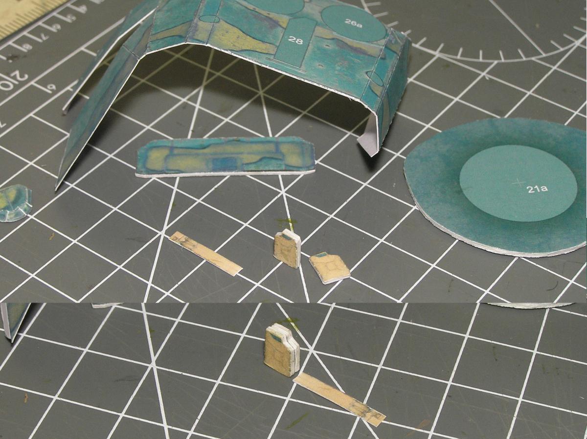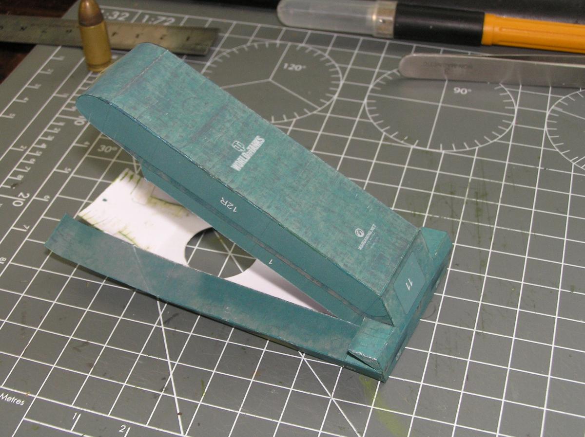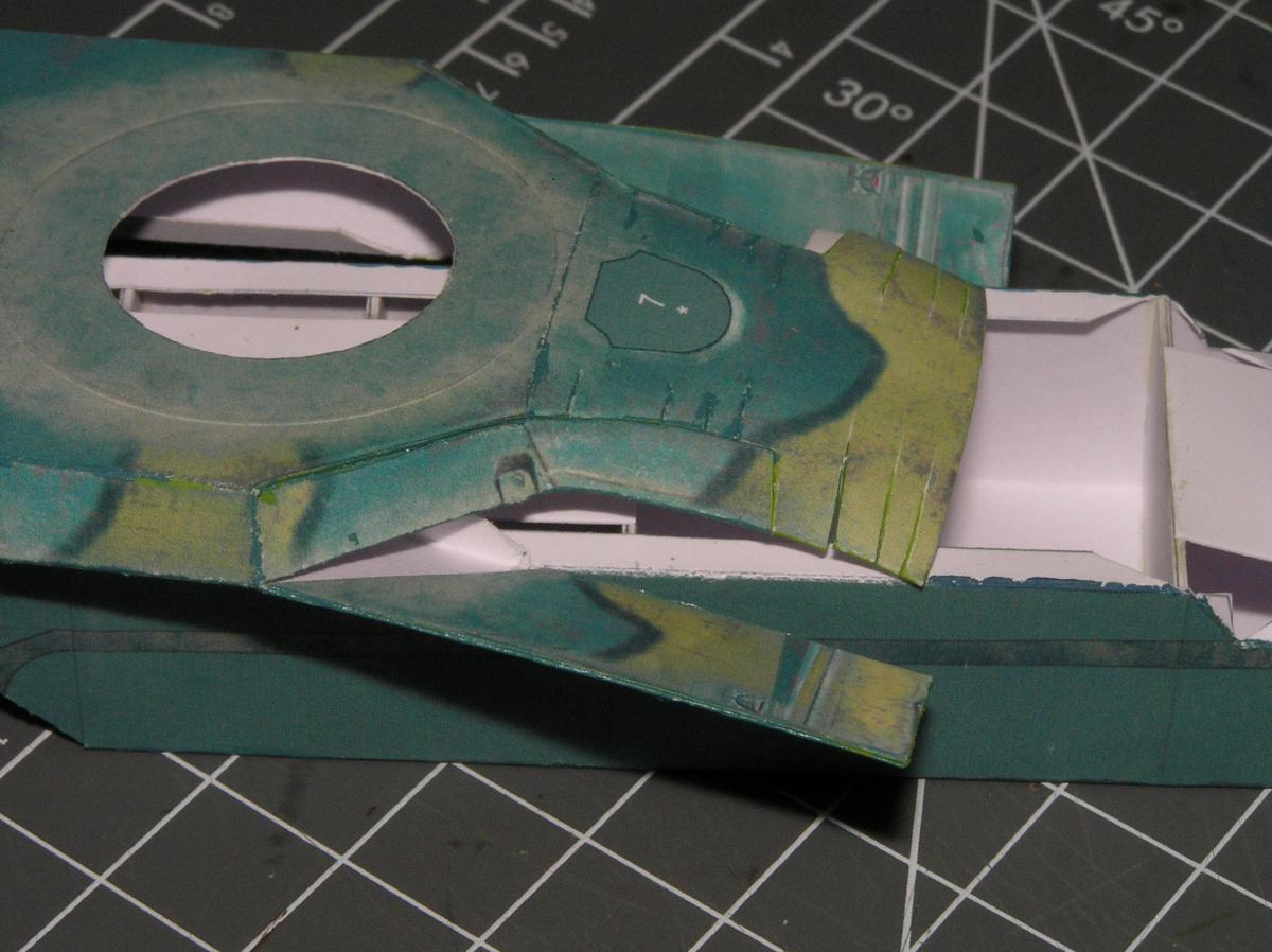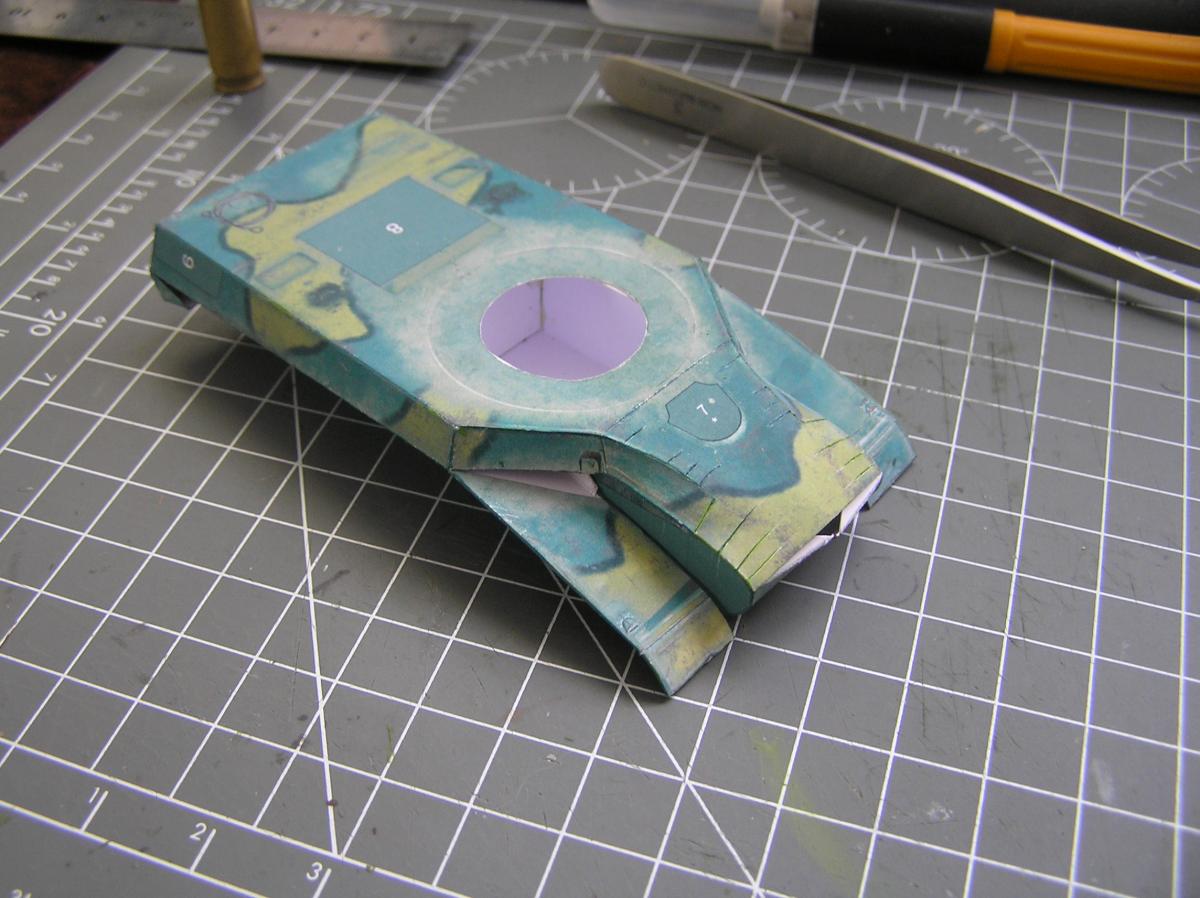 http://cdn-frm-eu.wargaming.net/wot/ru/uploads/monthly_10_2015/post-4861458-0-94382300-1445345369.jpg Всем привет! Собираем вместе модель танка "AMX 50 B. Бронекоробочка" (автор Targo_Kain, стиль изложения сохранен). Рекомендуем перед началом сборки ознакомиться с статьей о инструментах и материалах для бумажного моделизма. Автор и его полезные советы уже известны по статьям по сборке моделей: "Японский Тигр", танка Т-54, ИС-2 и ПТ-САУ: Charioteer, но есть и новые полезные нюансы: 1 http://cdn-frm-eu.wargaming.net/wot/ru/uploads/monthly_10_2015/post-4861458-0-84110200-1445348311_thumb.jpg Начнём, как обычно, с "чистого листа". А точнее, возьмём несколько листов плотной бумаги 180 г/м и распечатаем развёртки модели. 2 http://cdn-frm-eu.wargaming.net/wot/ru/uploads/monthly_10_2015/post-4861458-0-18485100-1445348314_thumb.jpg Первым делом - корпус. У этого танка он не совсем простой. Ванна корпуса на фото уже почти собрана, тут всё как обычно – на ровной поверхности вклеим силовые элементы. И приступим к верхней части – это деталь 1. Сделаем все надрезы, линии сгиба и подкрасим торцы. На фото видна крышечка с краской – это я смешивал краски, ярко синюю и ярко зелёную дабы добиться нужного оттенка – в нашей игре у французов весьма занятный зелёный цвет с бирюзовым отливом. 3 http://cdn-frm-eu.wargaming.net/wot/ru/uploads/monthly_10_2015/post-4861458-0-17802400-1445348315_thumb.jpg На этом фото видно что ВЛД детали 1 придана слегка округлая форма – прокатываем стальным шариком или чем то похожим для придания формы и что бы сошлись боковые надрезы на ВЛД. 4 http://cdn-frm-eu.wargaming.net/wot/ru/uploads/monthly_10_2015/post-4861458-0-16578900-1445348316_thumb.jpg Всё та же деталь 1, показана боковая внутренняя подклейка под ВЛД для того чтобы ровно приклеить «щёку» ВЛД – на фото справа, между левым крылом и левой стороной ВЛД. 5 http://cdn-frm-eu.wargaming.net/wot/ru/uploads/monthly_10_2015/post-4861458-0-30936700-1445348317_thumb.jpg Деталь 1, вид изнутри на ВЛД, одна «щека» (по фото - слева) ВЛД подклеена на внутреннюю склейку. 6 http://cdn-frm-eu.wargaming.net/wot/ru/uploads/monthly_10_2015/post-4861458-0-79514000-1445348319_thumb.jpg Подклейка изнутри детали 1 задней части «щеки» ВЛД. 7 http://cdn-frm-eu.wargaming.net/wot/ru/uploads/monthly_10_2015/post-4861458-0-65384400-1445348320_thumb.jpg Обе «щёки» ВЛД приклеены. Получаем характерную "округлость" передней части. 8 http://cdn-frm-eu.wargaming.net/wot/ru/uploads/monthly_10_2015/post-4861458-0-85865500-1445348321_thumb.jpg Деталь 1, приклеиваем заднюю часть надгусеничных полок к заднему листу МТО. Это задаст нам ровное направление полок, чтобы избегжать «винтов». 9 http://cdn-frm-eu.wargaming.net/wot/ru/uploads/monthly_10_2015/post-4861458-0-18304000-1445348323_thumb.jpg Тоже, что и на фото 08, вид сбоку. 10 http://cdn-frm-eu.wargaming.net/wot/ru/uploads/monthly_10_2015/post-4861458-0-15971900-1445348324_thumb.jpg Прикладываем ВЛД к нижней части корпуса, прикидываем, как будем приклеивать. 11 http://cdn-frm-eu.wargaming.net/wot/ru/uploads/monthly_10_2015/post-4861458-0-16648100-1445348325_thumb.jpg Тоже, что на фото 09, вид с другого борта – проверяем, ровно ли всё село. Видно подклейки «щёк» ВЛД и уже склеенные между собой разрезы на ВЛД. 12 http://cdn-frm-eu.wargaming.net/wot/ru/uploads/monthly_10_2015/post-4861458-0-32821600-1445348326_thumb.jpg Ну вроде всё ровно, можно клеить дальше 13 http://cdn-frm-eu.wargaming.net/wot/ru/uploads/monthly_10_2015/post-4861458-0-65607400-1445348327_thumb.jpg ВЛД детали 1 приклеено к детали 2, боковыми сторонами, спереди шов-стык ВЛД и НЛД приклеим в последний момент. 14 http://cdn-frm-eu.wargaming.net/wot/ru/uploads/monthly_10_2015/post-4861458-0-90999400-1445348328_thumb.jpg Под крылья (дет 1, продолжение низа надгусеничных полок) приклеили детали 5R и 5L. 15 http://cdn-frm-eu.wargaming.net/wot/ru/uploads/monthly_10_2015/post-4861458-0-18724500-1445348330_thumb.jpg А теперь склеиваем стык ВЛД и НЛД спереди. 16 http://cdn-frm-eu.wargaming.net/wot/ru/uploads/monthly_10_2015/post-4861458-0-20039000-1445348331_thumb.jpg После стыка ВЛД и НЛД приклеим крылья к корпусу. Всё, корпус готов! Склейку в таком порядке, как на цеп