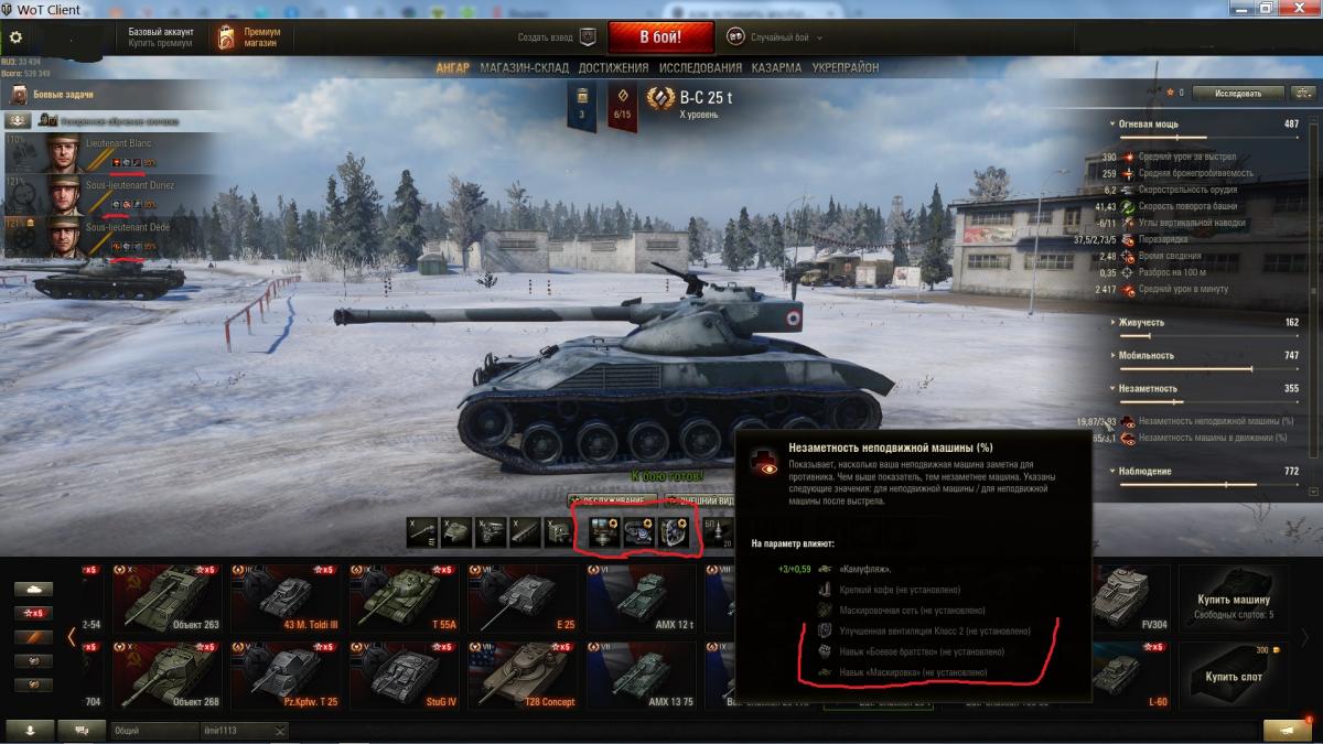 Вопрос в следующем. Bat.-Châtillon 25 t работает ли маскировка и перки? На клиенте у экипажа прокачано - ББ, установлена вентиляция, присутствует маскировка. В правом окне, где показаны параметры, все эти параметры отмечены как не работающие. Это баг отражения информации или всё таки они действительно не работают? На Bat.-Châtillon 25 AP всё это работает (подсвечено). Клиент чистый без модов. Скрин прилагается.