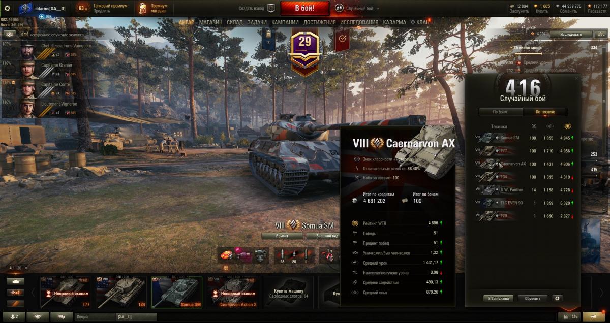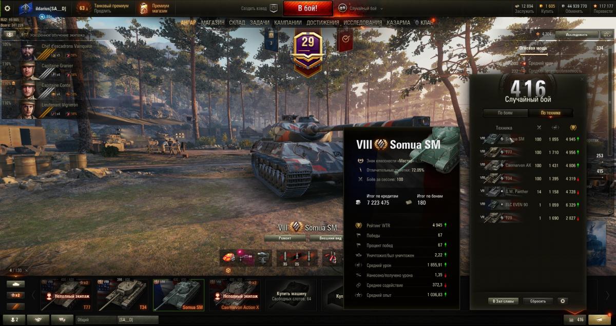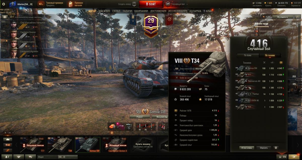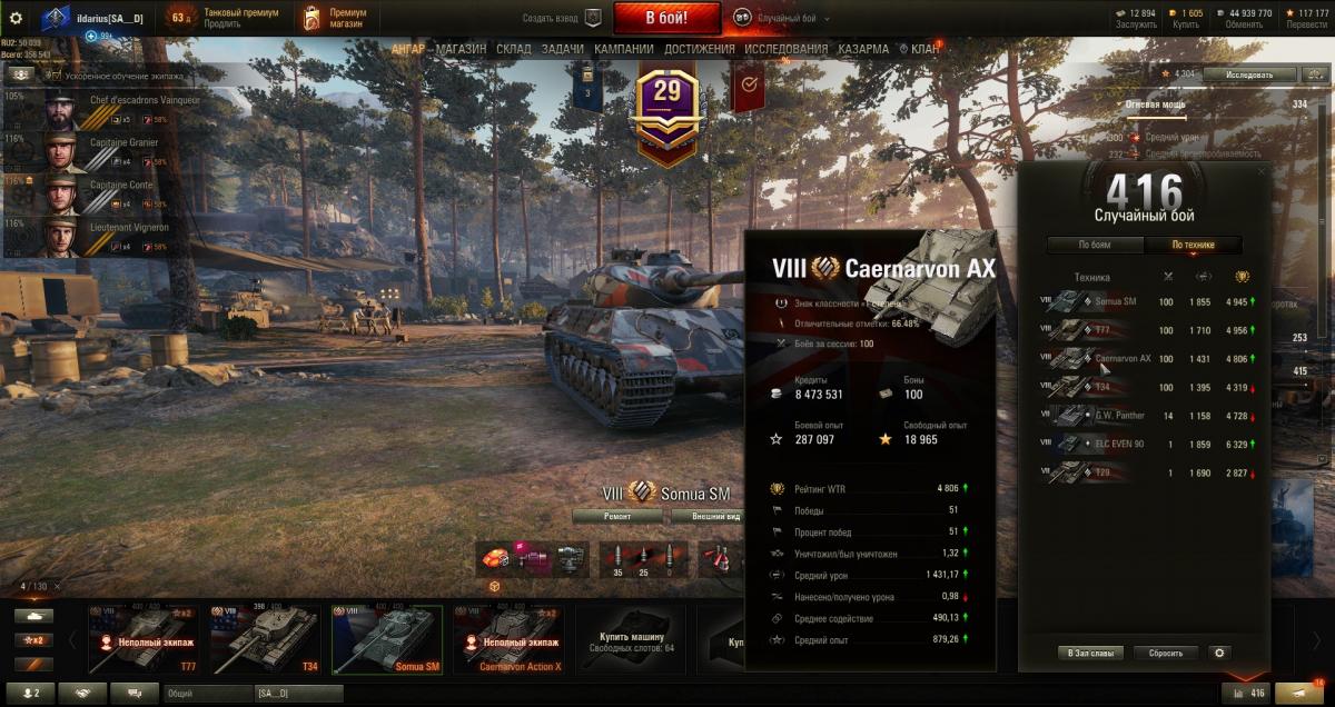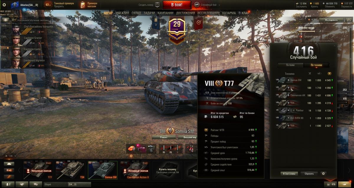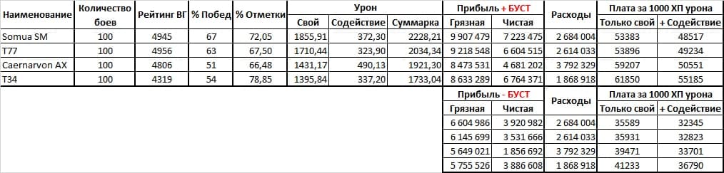 В общем, докупил я недавно в марафоне себе танчик Т77 и решил поиграть на нем, посмотреть, что да как. Попутно решил сравнить его с другим танчиком с марафона, а именно Caernarvon AX. На обоих было 0 боев. Решил сделать на них по 100 боев, чтобы был полный цикл отметки, заодно так и считать заработок удобнее и влияние закона малых чисел меньше. Потом решил, а почему бы не сравнить и танки, которые у меня уже до этого были, а именно Т34 (полученный еще когда, при переводе его в ПРЕМ) и Сомика, купленного, относительно, недавно. На них, для чистоты эксперимента тоже делал по 100 боев. Бои старался делать по максимуму на одном-двух танках, чтобы был эффект привыкания к технике, а не переключаться каждый раз. Единственно, надо было сгруппировать Барабаны отдельно, циклы отдельно, но как получилось, так получилось. Играл на фарм, то из голдовых расходок только огнетушитель + некоторое количество голдовых снарядов, если попал в ситуацию, что надо, все-таки, пробивать, а обычными, не возможно или крайне сложно. Пояснения к полученной таблице: Spoiler1. % Побед Чтобы показать, насколько танк в состоянии тащить (В МОИХ РУКАХ) в режиме фарма. 2. % Отметки танка. Чтобы знать, на сколько адекватна была игра относительно среднестатистического игрока. Т.е. статистика игры на отметку в 95% явно была бы не для основной категории игроков. 3. Прибыль + БУСТ Экономика боев, которые я сыграл по факту. 4. Прибыль - БУСТ Экономика боев, составленная уже чисто математически. Из грязной прибыли вычел треть, т.е. убрал +50% БУСТа, и, при тех же расходах, получена чистая прибыль. 5. Плата за 1000ХП + Содействие Считал с учетом, что за содействие мы получаем только половину опыта и кредитов. Итоговая таблица: Spoiler Скриншоты с результатами 100 боев Spoiler Итоги сравнения SpoilerСомик - Очень хорош, как для фарма, так и для ногиба, если умеете играть на барабанной технике. Голда слабая и на неё рассчитывать особо не приходится. Зато обычный пробой вполне не плох, потому расходы за бой вышли средние. Т77 - Оказался весьма не плох, может и фармить, и побеждать. Голда лучшая из четверых. Танк, в целом, подвиждый, но очень косой. Все модули ставил на сведение и стабилизацию.Т34 - В нынешнем рандом, тащить уже не может, т.к. очень медленный, большой, картонный (даже башня, особенно против плазмоганов новых 9ок и 10ок) и очень долго сводится + нет ДПМ. Зато, очень хорошо фармит, за счет самого высокого пробоя из представленных, т.е. расходы на голду минимальные, при этом голда имеет также отличный пробой. Каерн - оказался худшим танком из всех, вышеперечисленных. Очень медленный и довольно картонный, что не позволяет реализовывать его очень высокий ДПМ. особенно, учитывая, что у него худшее пробитие основным снарядом и посредственное голдой. В результате, имеем крайне высоки расход голды при скромном общем уроне, т.е. грязной прибыли. В целом, оплата кредитами за каждые 1000 нанесенного урона, у всех танков примерно одинакова, плюс-минус погрешности. В общем, всем спасибо за просмотр. ПыСы Думаю, сделаю еще такое же сравнение по ЛТ, их у меня много ... все, кроме ХВК30 и ГСОР