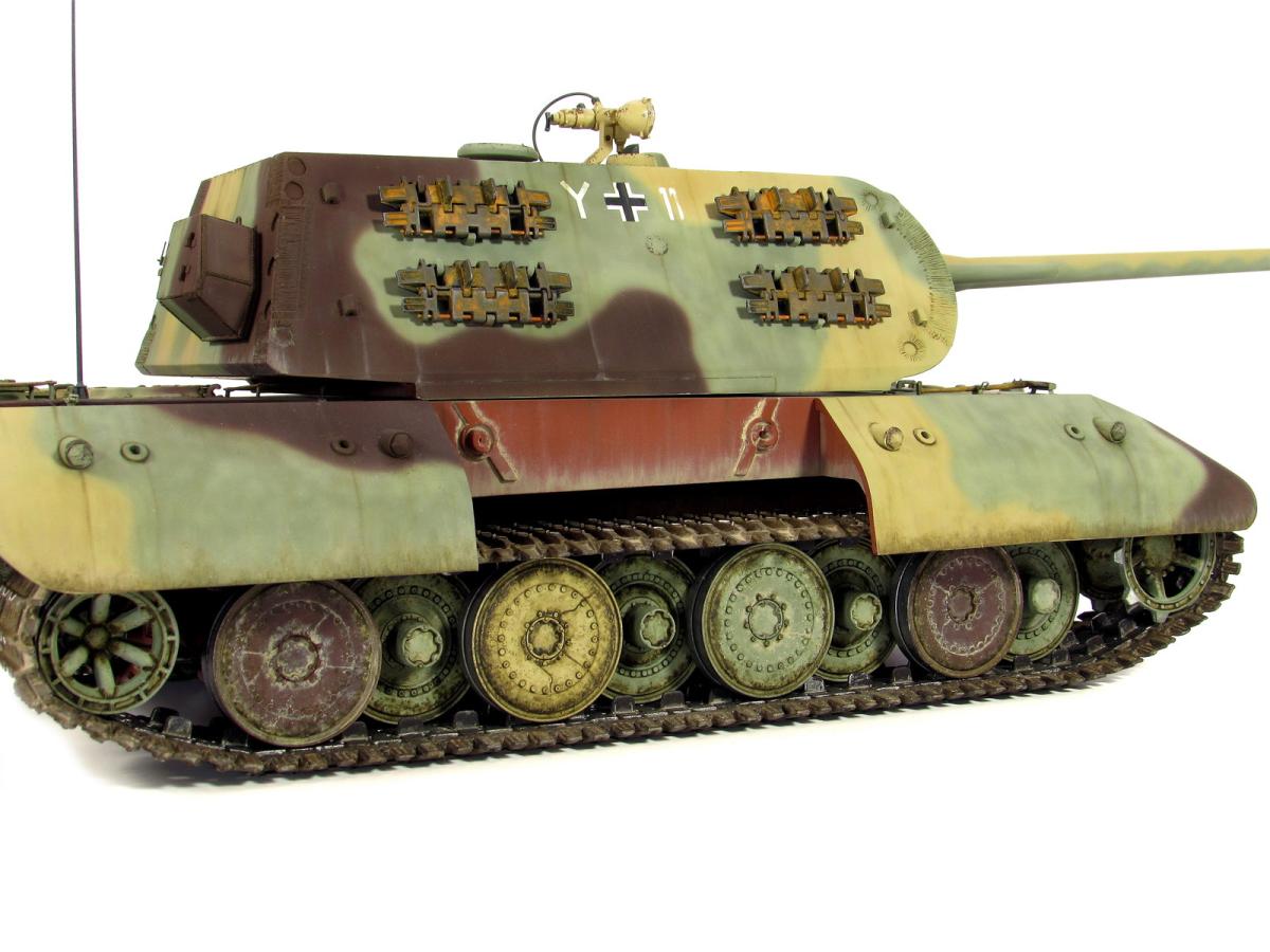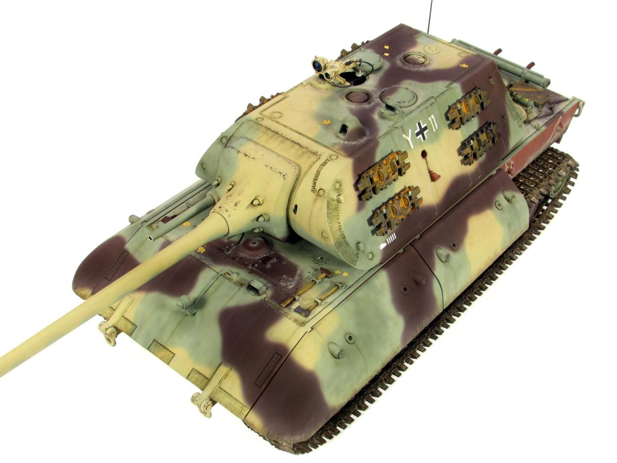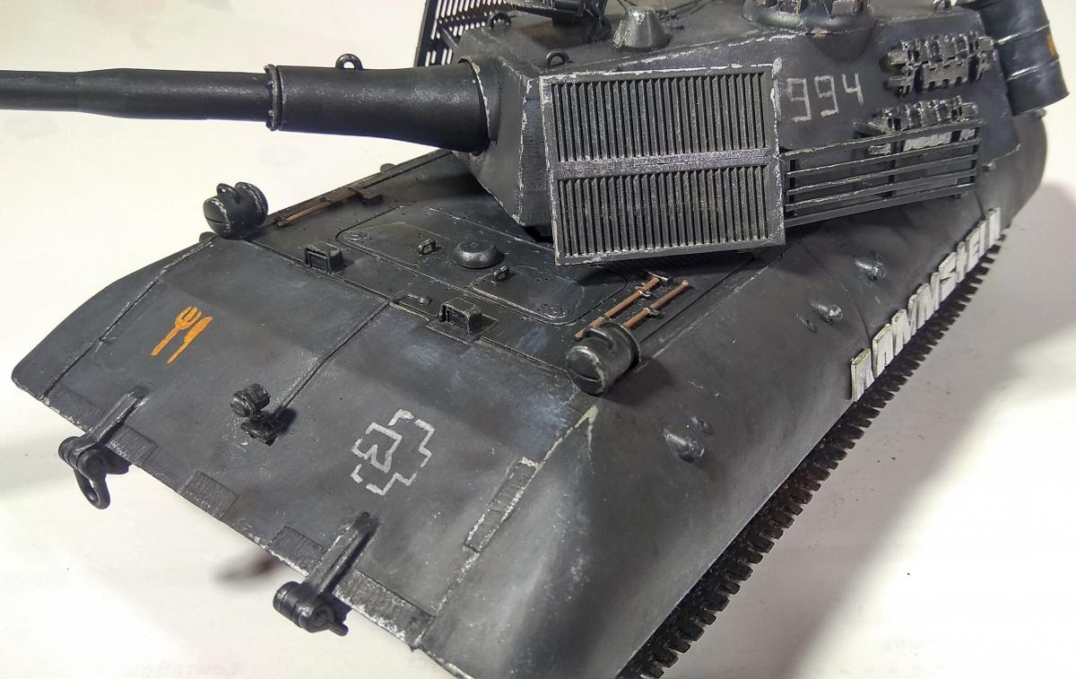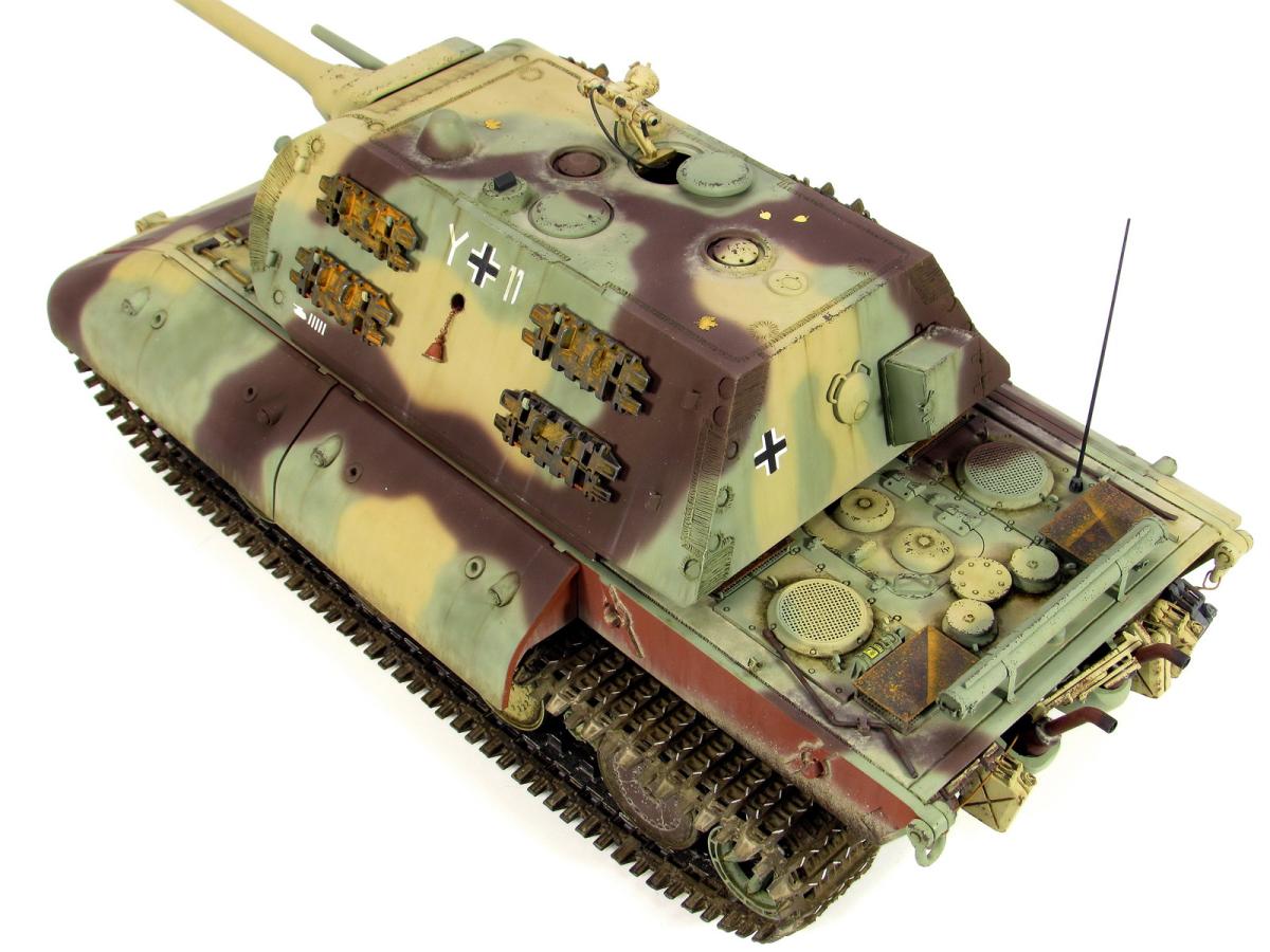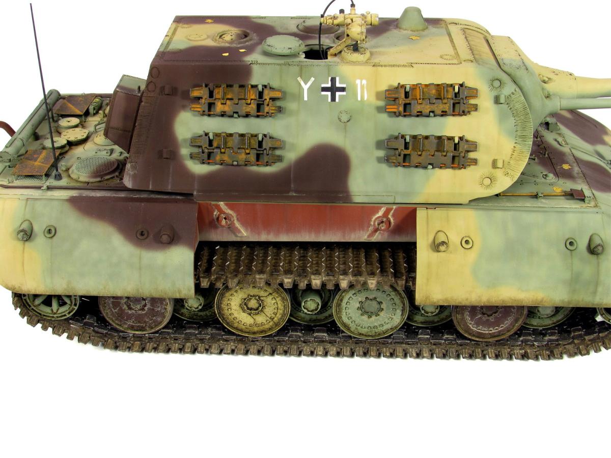 Всем привет. Итак, реинкарнация Е-100. В 2019 году я уже строил данную модель, собственно это она и есть, к сожалению, так вышло, модель пришлось отмыть т.к. была несовместимость модельной химии. На акриловую спиртовую краску Тамия под декали был нанесён глянцевый лак серии LP Тамия и им же закрывались деки. В результате через какое то время после завершения стройки, везде, где был нанесён глянцевый лак LP очень сильно потрескалось покрытие.По доработкам: мет. ствол орудия и пулемёта, точеная антенна и антенный ввод от RB Models, точёная заглушка пистолетного, множество элементов КТ от Менг, тубус под антенну, рабочие травленые замки, нарастил плиту ВЛД, переместил крепления экранов спереди, заделал пулемётные гнёзда на башне, добавил бронировку вент. решёток, изготовил ящик для ПНВ, доработал бортовые экраны.Маркировку взял из 512 батальона, именно там были Ягдтигры маркировавшиеся X и Y и мне захотелось засунуть Е-100 почему то туда под вымышленным номером. Спасибо за внимание.