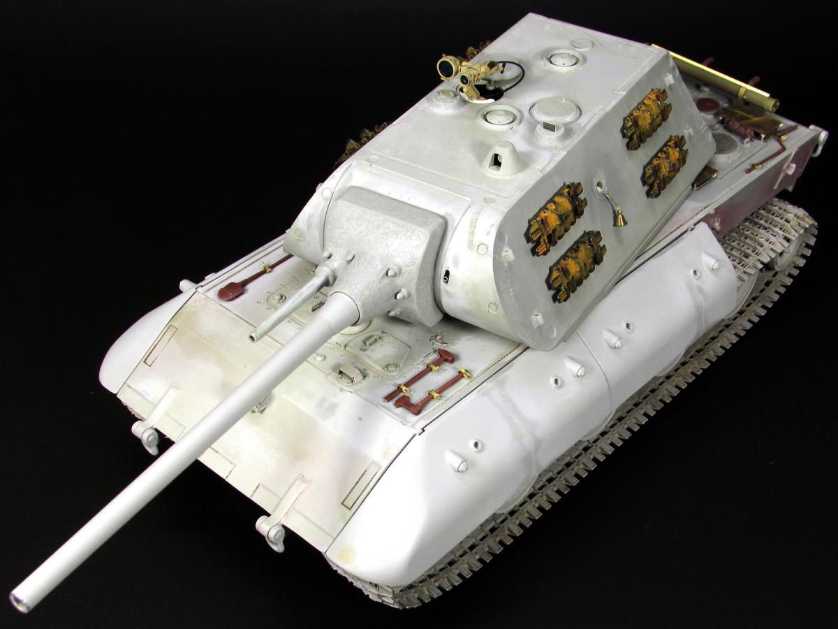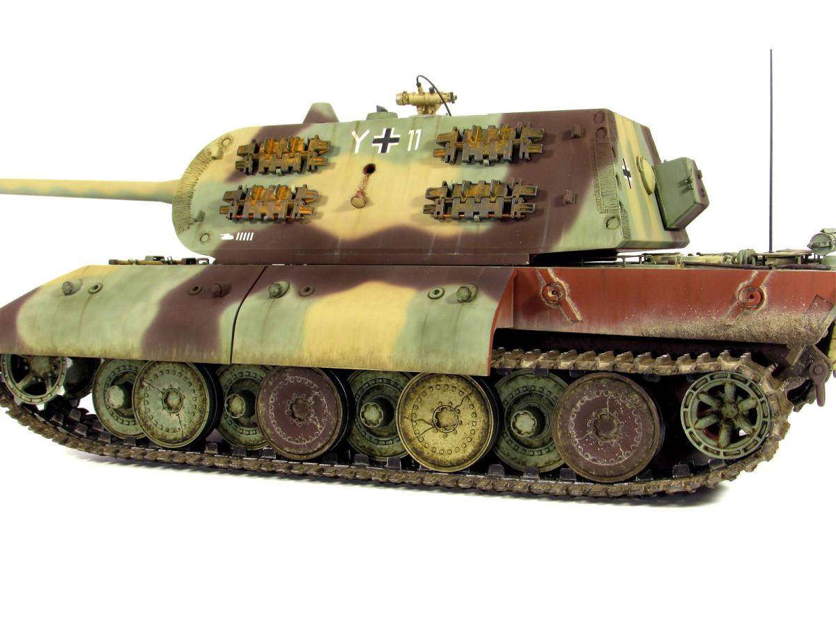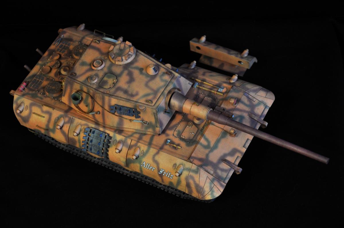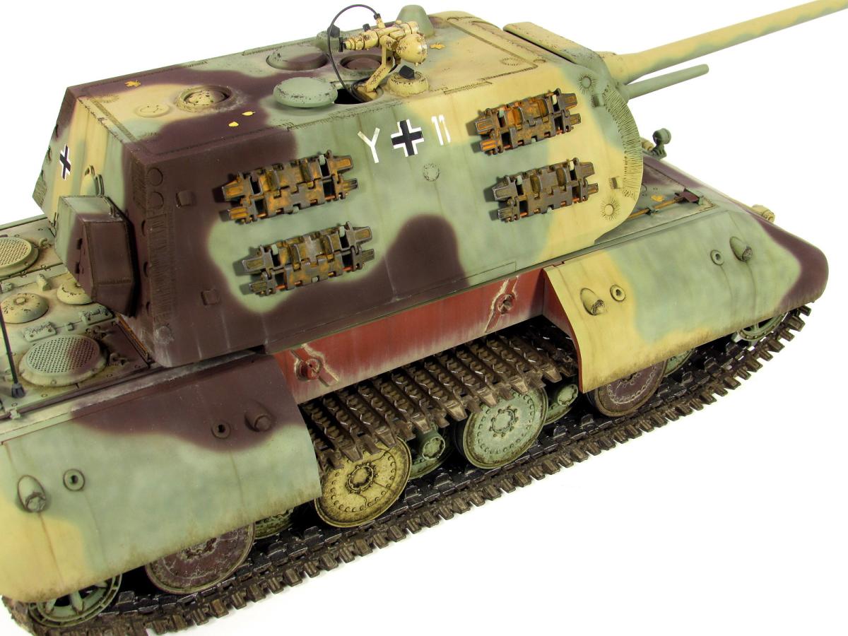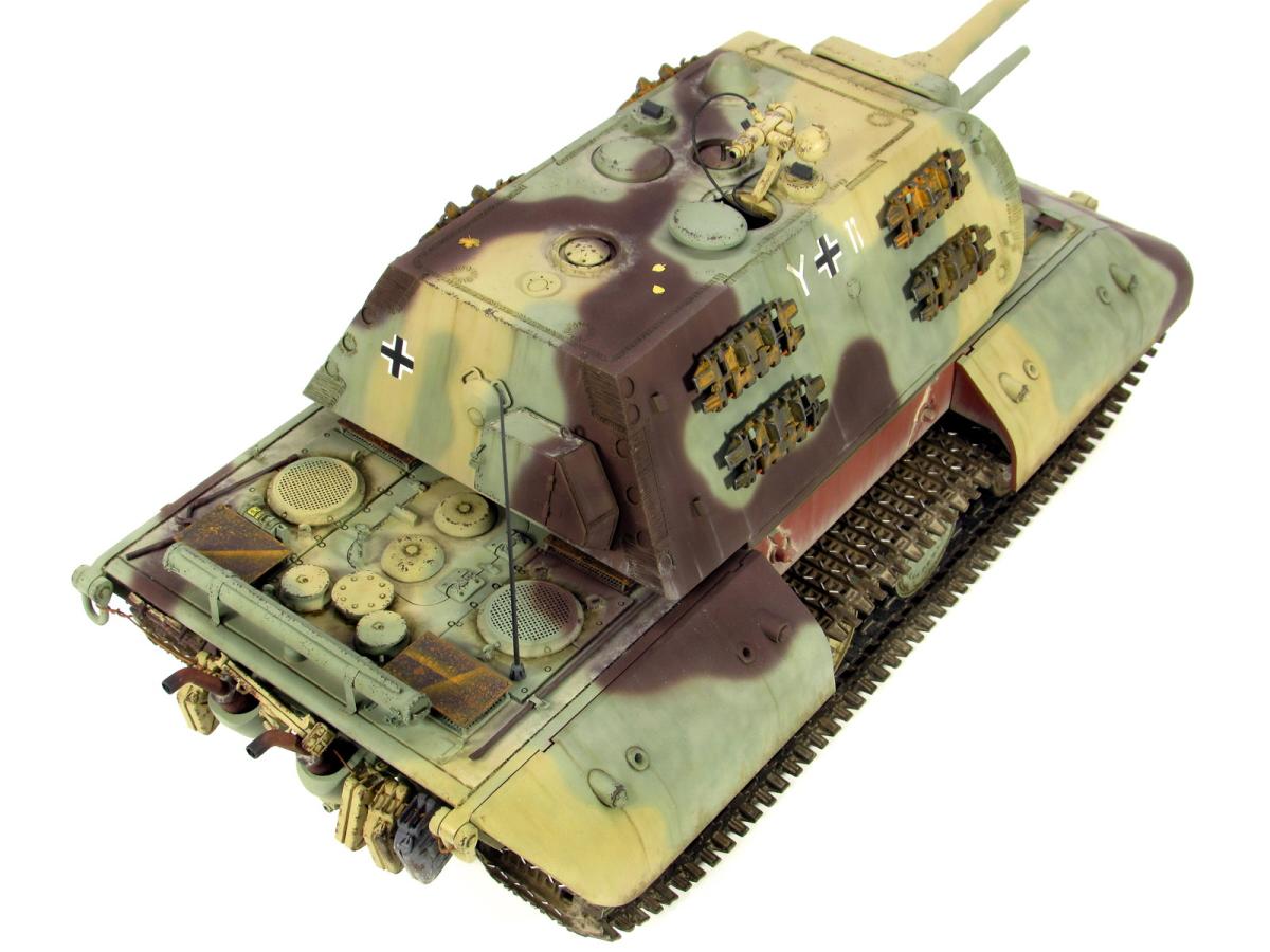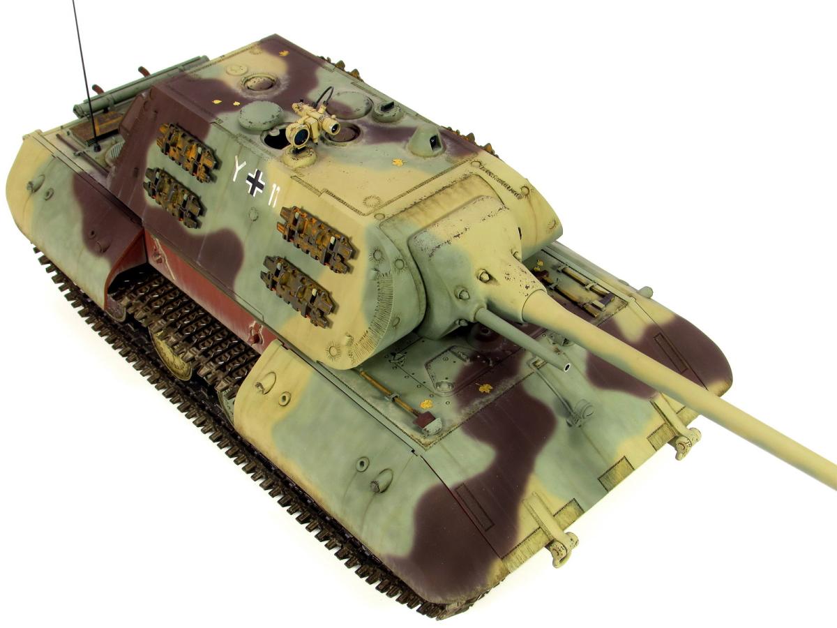 Всем привет. Итак, реинкарнация Е-100. В 2019 году я уже строил данную модель, собственно это она и есть, к сожалению, так вышло, модель пришлось отмыть т.к. была несовместимость модельной химии. На акриловую спиртовую краску Тамия под декали был нанесён глянцевый лак серии LP Тамия и им же закрывались деки. В результате через какое то время после завершения стройки, везде, где был нанесён глянцевый лак LP очень сильно потрескалось покрытие.По доработкам: мет. ствол орудия и пулемёта, точеная антенна и антенный ввод от RB Models, точёная заглушка пистолетного, множество элементов КТ от Менг, тубус под антенну, рабочие травленые замки, нарастил плиту ВЛД, переместил крепления экранов спереди, заделал пулемётные гнёзда на башне, добавил бронировку вент. решёток, изготовил ящик для ПНВ, доработал бортовые экраны.Маркировку взял из 512 батальона, именно там были Ягдтигры маркировавшиеся X и Y и мне захотелось засунуть Е-100 почему то туда под вымышленным номером. Спасибо за внимание.