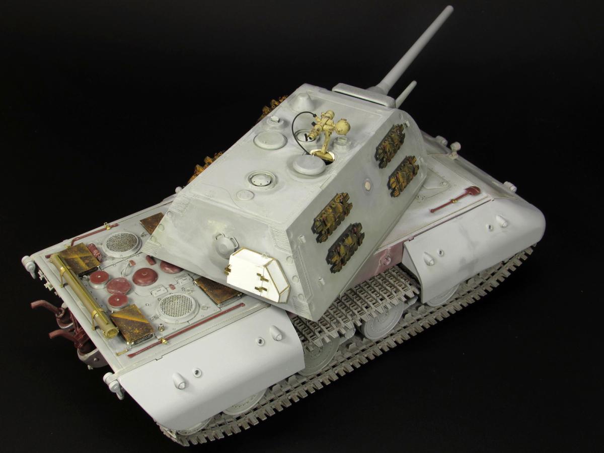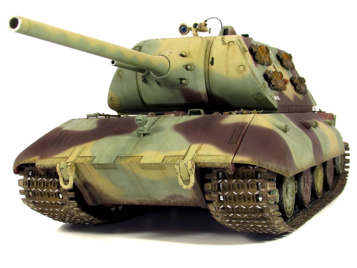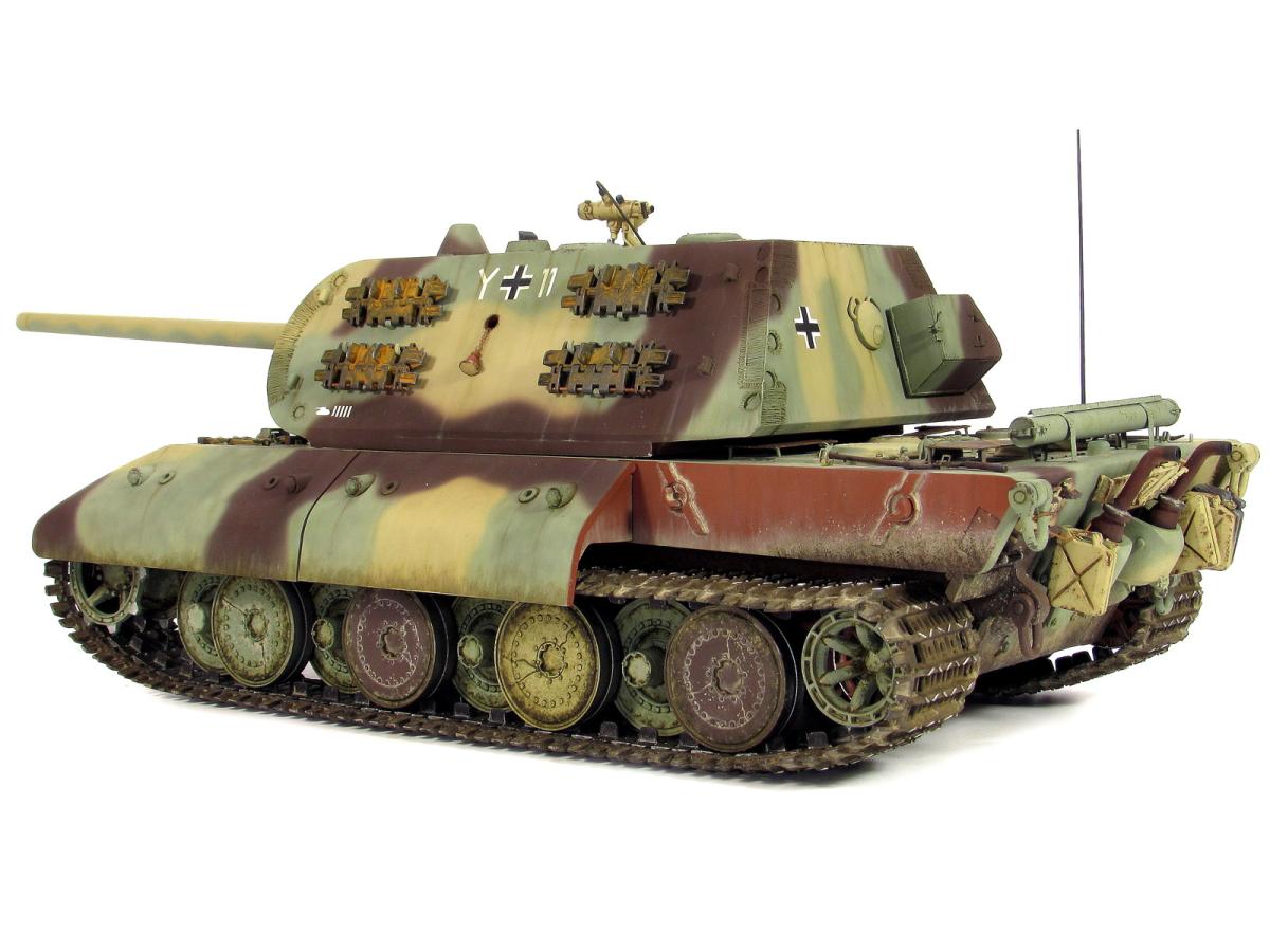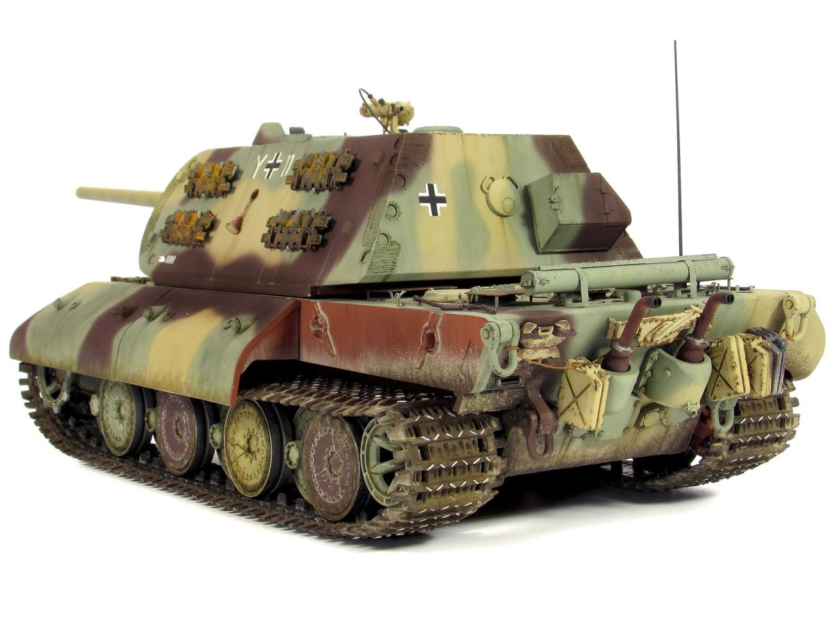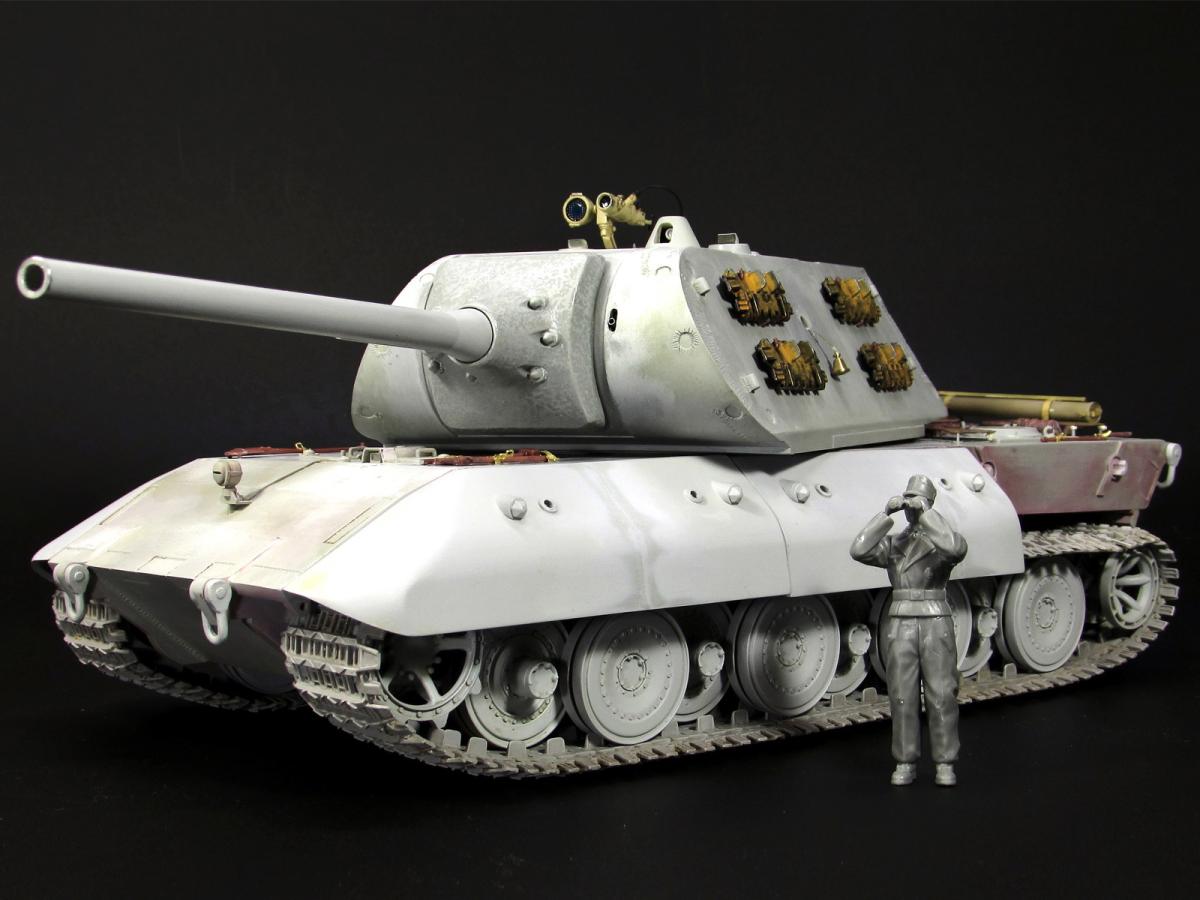 Всем привет. Итак, реинкарнация Е-100. В 2019 году я уже строил данную модель, собственно это она и есть, к сожалению, так вышло, модель пришлось отмыть т.к. была несовместимость модельной химии. На акриловую спиртовую краску Тамия под декали был нанесён глянцевый лак серии LP Тамия и им же закрывались деки. В результате через какое то время после завершения стройки, везде, где был нанесён глянцевый лак LP очень сильно потрескалось покрытие.По доработкам: мет. ствол орудия и пулемёта, точеная антенна и антенный ввод от RB Models, точёная заглушка пистолетного, множество элементов КТ от Менг, тубус под антенну, рабочие травленые замки, нарастил плиту ВЛД, переместил крепления экранов спереди, заделал пулемётные гнёзда на башне, добавил бронировку вент. решёток, изготовил ящик для ПНВ, доработал бортовые экраны.Маркировку взял из 512 батальона, именно там были Ягдтигры маркировавшиеся X и Y и мне захотелось засунуть Е-100 почему то туда под вымышленным номером. Спасибо за внимание.