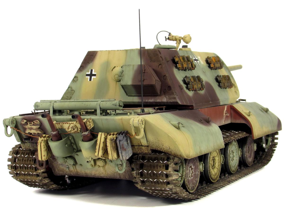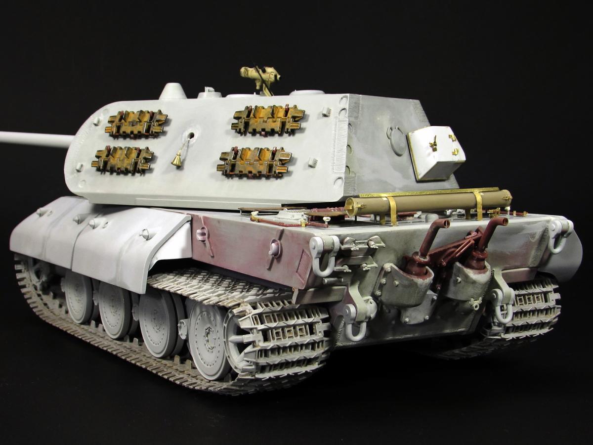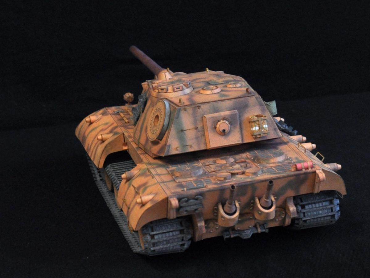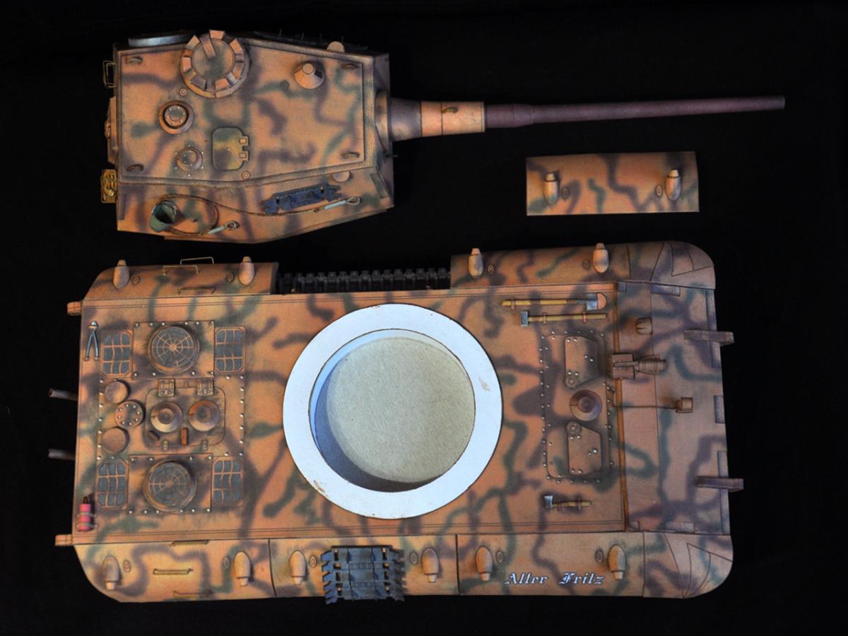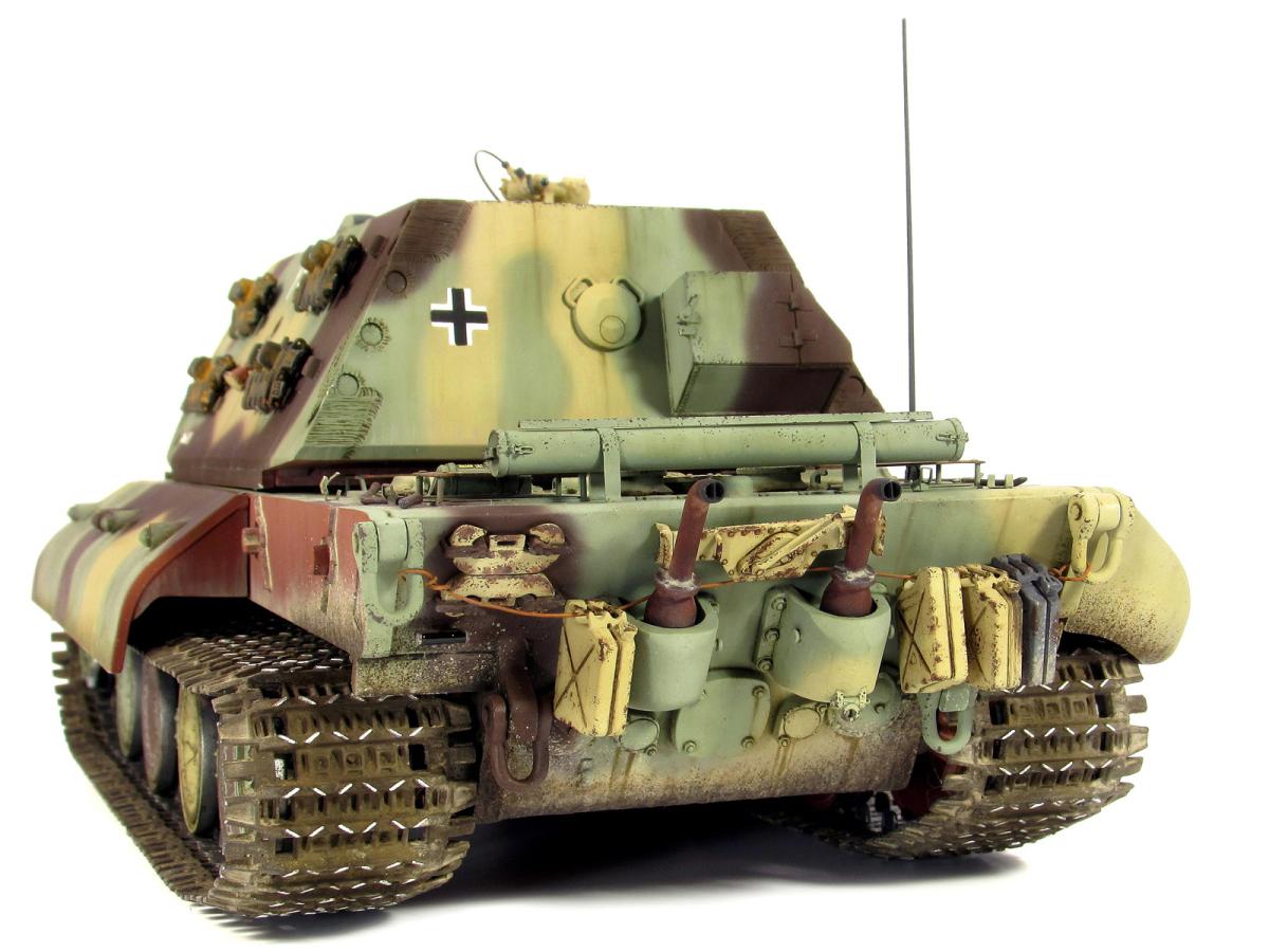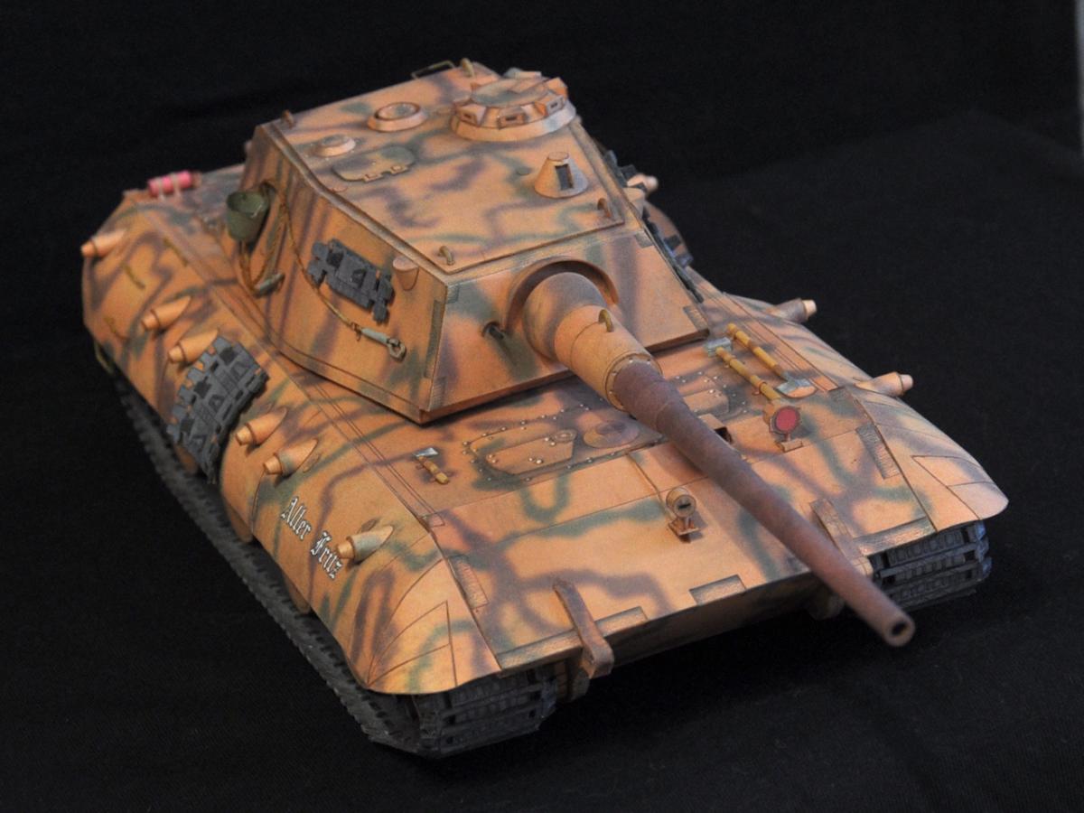 Всем привет. Итак, реинкарнация Е-100. В 2019 году я уже строил данную модель, собственно это она и есть, к сожалению, так вышло, модель пришлось отмыть т.к. была несовместимость модельной химии. На акриловую спиртовую краску Тамия под декали был нанесён глянцевый лак серии LP Тамия и им же закрывались деки. В результате через какое то время после завершения стройки, везде, где был нанесён глянцевый лак LP очень сильно потрескалось покрытие.По доработкам: мет. ствол орудия и пулемёта, точеная антенна и антенный ввод от RB Models, точёная заглушка пистолетного, множество элементов КТ от Менг, тубус под антенну, рабочие травленые замки, нарастил плиту ВЛД, переместил крепления экранов спереди, заделал пулемётные гнёзда на башне, добавил бронировку вент. решёток, изготовил ящик для ПНВ, доработал бортовые экраны.Маркировку взял из 512 батальона, именно там были Ягдтигры маркировавшиеся X и Y и мне захотелось засунуть Е-100 почему то туда под вымышленным номером. Спасибо за внимание.
