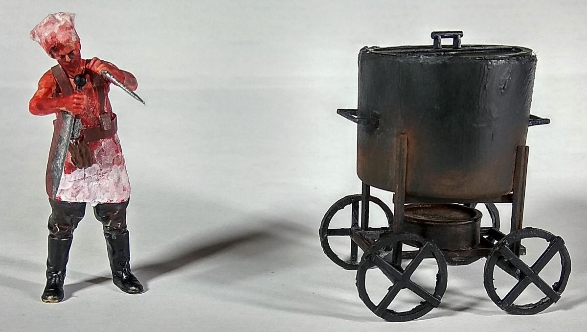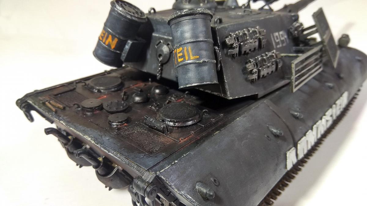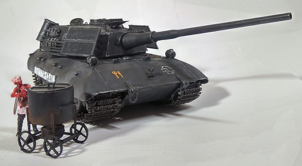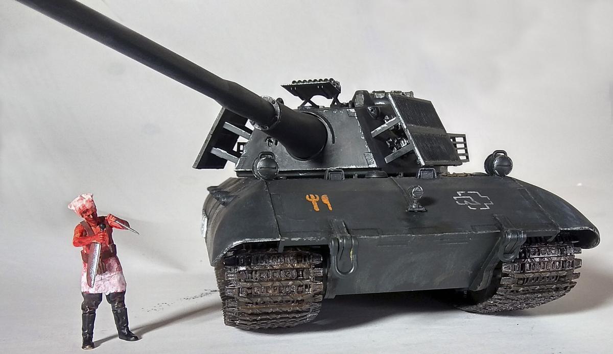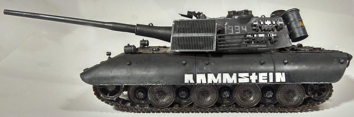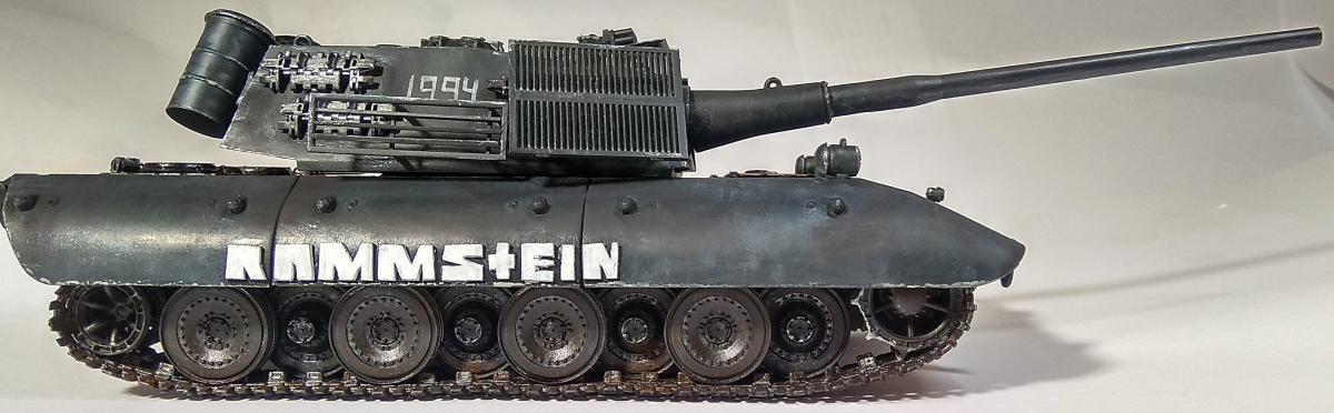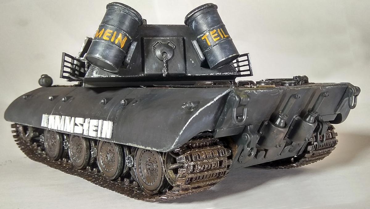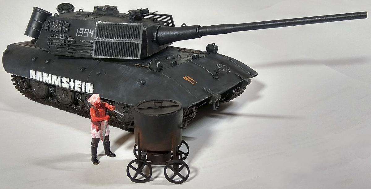 Думаю, не нужно объяснять, откуда и как появилась идея такой модели. С одной из диорам, требующих переделки, снял Е-100 от трубача. Сильно выделялся искривлённый при сборке ствол, поэтому оригинальный изкоробочный был отпилен и установлен ствол от ягдтигра. После этой манипуляции орудие стало больше походить на L66, нежели L55. Затем начал думать над тем, как можно стилизовать танк под песню Mein Teil. Посему добавил установку пуска дымов на крышу башни, сделав к ней проводку от командирской башни (в триплексы которой были установлены кусочки прозрачного пластика, которого, почему-то, в коробке нет). Затем сделал экраны на переднюю часть башни, в форме старался приблизить к элементам конструкции сцены. Затем установил 2 прожектора на крышу корпуса. В результате Сотый стал выглядеть хоть и стилизовано, но чувствовался визуальный перекос деталей на морду. Поэтому по бокам от люка загрузки боеприпасов установил 2 бочки. Буквы на экранах сначала думал нанести через трафарет, но после неудачи решил вырезать из пластика и сделать объёмными. Ходовую загрязнил, сделал подтёки ГСМ и потёртости в большом количестве. http://cdn-frm-eu.wargaming.net/wot/ru/uploads/monthly_09_2017/post-5715890-0-45070700-1504632416_thumb.jpghttp://cdn-frm-eu.wargaming.net/wot/ru/uploads/monthly_09_2017/post-5715890-0-80402600-1504632423_thumb.jpghttp://cdn-frm-eu.wargaming.net/wot/ru/uploads/monthly_09_2017/post-5715890-0-92775500-1504632440_thumb.jpghttp://cdn-frm-eu.wargaming.net/wot/ru/uploads/monthly_09_2017/post-5715890-0-25951300-1504632450_thumb.jpg Но просто модель смотрится не очень без фигурок. Вот и решил сделать самый узнаваемый образ этой песни - солиста Тилля Линдеманна, одетого в фартук мясника и с ножом-микрофоном. За основу взял механика от звездинского L4500A. Из обычной бумаги сделал фартук, поварский колпак и пояс с ремнями. http://cdn-frm-eu.wargaming.net/wot/ru/uploads/monthly_09_2017/post-5715890-0-76757200-1504632606_thumb.jpg А потом, что называется, Остапа понесло - из баночки от пигмента, кусков оконных рам от миниарта и бочки был сделан котёл, который Тилль обычно выкатывает на сцену при каждом исполнении "Mein Teil": http://cdn-frm-eu.wargaming.net/wot/ru/uploads/monthly_09_2017/post-5715890-0-04654700-1504632692_thumb.jpghttp://cdn-frm-eu.wargaming.net/wot/ru/uploads/monthly_09_2017/post-5715890-0-11161500-1504632700_thumb.jpg Вот что получилось в итоге: http://cdn-frm-eu.wargaming.net/wot/ru/uploads/monthly_09_2017/post-5715890-0-62327000-1504632387_thumb.jpghttp://cdn-frm-eu.wargaming.net/wot/ru/uploads/monthly_09_2017/post-5715890-0-62927200-1504632396_thumb.jpghttp://cdn-frm-eu.wargaming.net/wot/ru/uploads/monthly_09_2017/post-5715890-0-13068000-1504632825_thumb.jpg PS: Хотелось бы увидеть подобный танк в игре, с интересом бы покатался