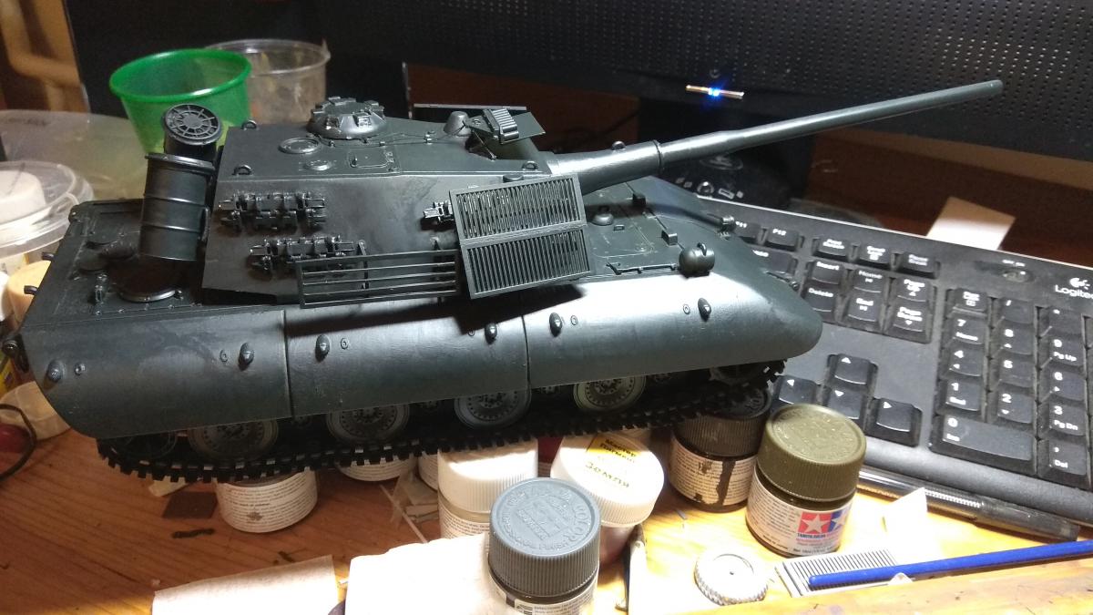 Приветствую всех любителей WoT и моделизма! Решил создать тему со стройкой там, где она собственно и должна быть, так как я строю модель тяжелой немецкой ПТ-САУ 10 уровня из игры в масштабе 1/35. =) Сама стройка началась еще год назад с того, что я предложил другу переделать его старую модель Jagdpanzer E-100 от Trumpeter в заднерубочный вариант, на что тот ответил предложением купить её по заманчивой цене (так как по различным причинам отсутствовали некоторые детали). Иначе бы я не решился это делать из-за дороговизны самой модели, поэтому его вклад в стройку неоспорим, за что ему отдельная благодарность. Осенью создал тему на Каропке, но было бы несправедливо забыть об игровом форуме. Итак, мною был закуплен афтермаркет, который я на то время считал вполне достаточным, а именно: - два точеных ствола калибра 17 и 2 см от RBmodel; - травленые решетки на Е-100 для Trumpeter (позже выяснилось, что на Jagdpanzer E-100 они не подходят по размерам); - болты от MasterClub; Spoiler Поначалу думал делать некоторые детали самостоятельно (люки из пластика, крючья для траков из металлической заколки), но в итоге оказалось проще попросить помощи у других моделистов, которые поделились лишними деталями. Cпасибо товарищам, дали фару и люки мехвода с радистом, крючья для запасных траков.Крупные детали со сложной формой решил заказать в фирме 3D печати. Так как имеются базовые навыки в КОМПАСе, то не возникло даже вопроса заказывать ли сами 3D модели. Однако чтобы сделать точную модель пришлось пошевелить мозгами, так как формат оригинальных файлов модели непросто открыть в Компасе, а базовые навыки 3D-моделирования у меня только в нём =). После танцев с бубнами, в автокаде я измерил маску пушки, для удобства распечатал её проекции, по размерам уже в Компасе сделал свою модель, однако в Компас кое-как удалось конвертировать и модель корпуса в масштабе 1 к 1 в непригодном для редактирования виде. Размеры я делил на 35 и таким образом делал свою модель в Компасе. Общий объем деталей составил около 32 кубических сантиметров и отдав за это удовольствие чуть более 900 рублей, мне пришлось довольствоваться совсем не модельным качеством деталей, но приемлимым для дальнейшей обработки. Распечатанный механизм поворота пушки оказался на удивление тугим, поэтому не потребовалось мастерить противовесы к пушке (её я просверлил и прикрепил к механизму 2мм штырьком). Spoiler Вот такие детали получились после 3D печати. Отпилил рубку, крышку мто, последнюю приклеил в переднюю часть на распорки. (при стройке использовал листовой пластик из запасов + пластик от EverGreen черный 1мм и белый 2мм) Spoiler После приклеивания рубки оказалось, что игровая модель длиннее где-то на 5мм чем в оригинале у Трумпетера, это привело к наезду большой маски пушки на воздухозаборники и расширило список отклонений от оригинала. Но для меня это не критично так как я позволил себе отойти от сборки модели 1 к 1 как в игре и поэтому внес в неё изменения для большего реализма, а именно: - более мощная вентиляция, как на маусе или на оригинальной модели ягдпанзера от Trumpeter; - нормальные крючья под запасные траки, ибо в игре нереальное расположение крючьев, на которые траки от Е-100 просто не лезут; - масштабное отражение толщины бронелистов по углам рубки; - вынужденно принял решение поставить защитные экраны на воздухозаборники, так как травлёные решетки не подошли по 