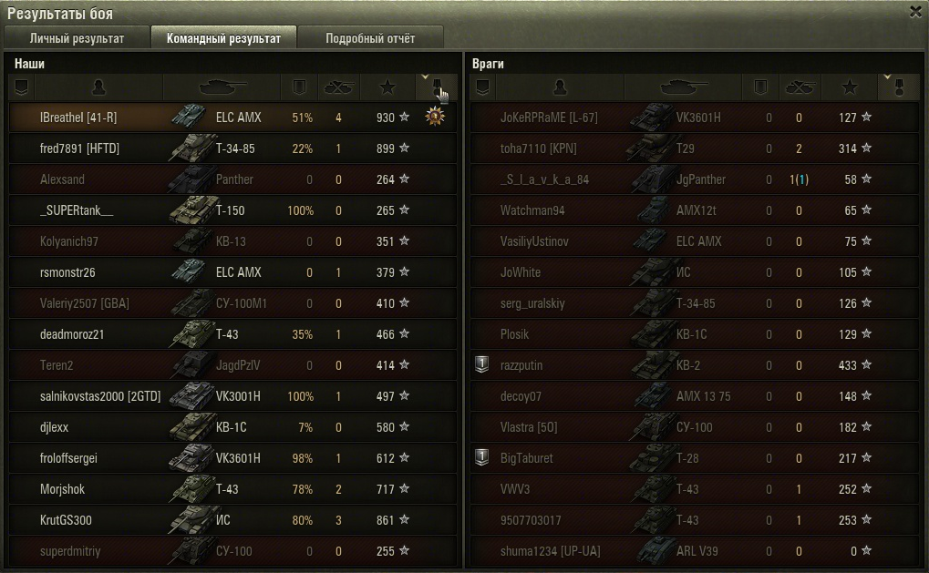 Большое сравнение ЛТ [0.8.1] Сравнение топ комплектаций http://wotzone.ru/images/inside/lt_081.gif Небольшое F.A.Q по таблице 0. Все танки отсортированы по общему баллу техники, так же каждый танк имеет различные баллы по бою, манёвренности, броне. 1. Описание баллов Идея баллов такая, есть некий идеальный танк, по каждому параметру у него балл 100%. Остальные танки сравниваются с ним по каждому параметру и получают своё значение балла 34% или 112% и т.п. Все баллы объединены в группы «Боевой балл», «Мобильность», «Бронирование», в которых вычисляется среднее значение — это и будет баллом группы. Общий балл — среднее значение «Боевого балла», «Мобильности», «Бронирования». Боевой балл — Пробитие всеми видами снарядов, урон в минуту. Мобильность — Радио связь. Скорость. Скорость поворота. Скорость поворота башни. Бронирование — Бронирование корпуса(мм) лоб, борт, корма. Бронирование башни(мм) лоб, борт, корма. Прочность.2. Учитывались простые снаряды (за серебро) 3. От автора Изначально все данные взяты с оф. танковедения. Прошу прощения за возможные ошибки. УВН и скорость сведения не учтены из-за сложности получения информации. Цифры опубликованы, так как по ним видны сильные и слабые стороны танчиков (хоть они и не учитывают крит. точек, углов наклона брони и УВН и т.п.) По баллам можно сравнивать разнотипную технику (ТТ, СТ, ПТ-САУ) разных уровней. Вся информация представлена для фана игроков, радуйтесь жизни и получайте от неё удовольствие 4. Статистические данные собраны сайтом вотзон и не являются официальными, детальние тут5. Таблица приведена на основе данных c wotzone.ru Подробнее о танчиках AMX 13 90 http://wotzone.ru/im...2443600dfad.png Ветка в форуме http://forum.worldof...41695-amx-1390/ Оф. танковедение http://worldoftanks....ance/amx_13_90/ Описание Без сомнения - венец французской ветки ЛТ, мой любимый танк из всех, на которых катался. 900-1000 опыта на нем в случае победы - это нормально, причема на этом танке ты влияешь на бой как никто другой, я на е75 не чувствую на себе такую ответственность как на нем. Поставил на нем личный рекорд полученного опыта - 1927. Главная проблема тех кто катается на французских лт 5-7 лвл - это то, что они не знают, что такое пассивный свет. От этого эти "вырезано цензурой" думают, что либо они на т-50(-2) либо на ст с барабаном. Мой совет тем, кто взял этот танк. Представьте, что вы кот. И ваша задача - гадить в тапки. Долго, с упорством и упоением. Шлите подальше всех кто пишет "амх в гору!" или "амх вместе". Толпой на этом танке ездят бараны. На картах где есть хорошие позиции для пассивного света (Малиновка, Прохоровка, Утес и т.п.) ваша задача эти позиции занять и светить до упора (пока противник не приблизился на 50-60 метров). После чего (если на вашем направлении противник по вашему засвету изничтожен полностью) можете навестить арту. Не надо гнаться за фрагами, серебро и опыт вам набьют союзники, вы как раз серебро на снарядах сэкономите (и на ремонте, так как помните - один выстрел и вы засветились, 15 метров, двойные кусты и свет, к сожалению, несовместимы). На городских картах посложнее, так как, во-первых негде спрятаться, во-вторых застройка часто препятствует тому, чтобы подобраться к сладкой попке противника. Поэтому мы должны использовать ошибки противника. Чтобы противник ошибся не надо выдавать свое присутствие заранее. Я держусь с тяжами, но немножко в отдалении, чтоб если что и поспеть к цели, но и не не