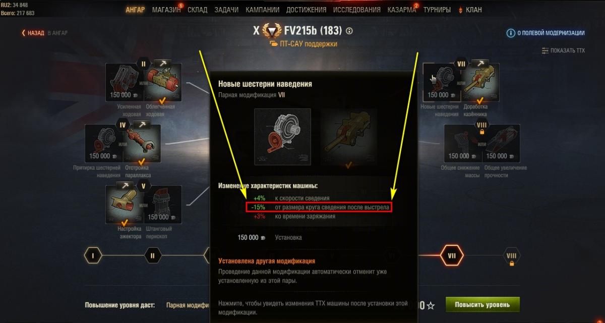 Приветствую! Есть 2 вопроса: 1) FV215b(183) - полевая модернизация ПТ поддержки имеет показатель усиления (выделен красным) так вот, какой смысл от этого "усиления" на ПТ с перезарядкой 20+сек.? P.S - Для однорольников фошей, да, это полезно, но речь именно о FV215b(183). 2) Товары за жетоны - почему нет ни где описания, предупреждения в окне перед покупкой трофейного оборудования о том, что нужно ещё вложить 3000000 ладно знающие старожилы, а как же новичкам быть не зная данных? P.S - если я вдруг не нашел где кликнуть или навести и удержать мышь, то "тыкните носом" меня в сие место.