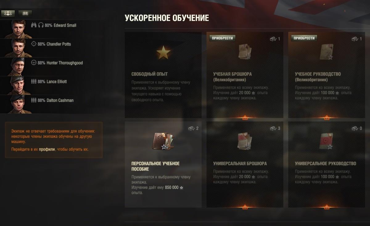 Купил САУ FV304 без экипажа, думал посажу тех, что есть в ангаре (выданных за разные задания). Понял, что экипаж данной САУ состоит из 5 человек, столько в ангаре свободных не было. Решил купить экипаж на данную машину 75% за 20000 серебра за каждого. Купил, решил применить к ним ускоренное обучение, купил книжку для всего экипажа по 100000 опыта, но применить не смог. Игра пишет: Экипаж не отвечает требованиям для обучения: некоторые члены экипажа обучены на другую машину. Кроме того, пишется что данная артиллерия является прем машиной! Подскажите, что я делаю не так и что мне сделать, чтобы применить книжки к данному экипажу? Кстати, предлагается переобучить экипаж на данную машину за голду в количестве 500 шт.