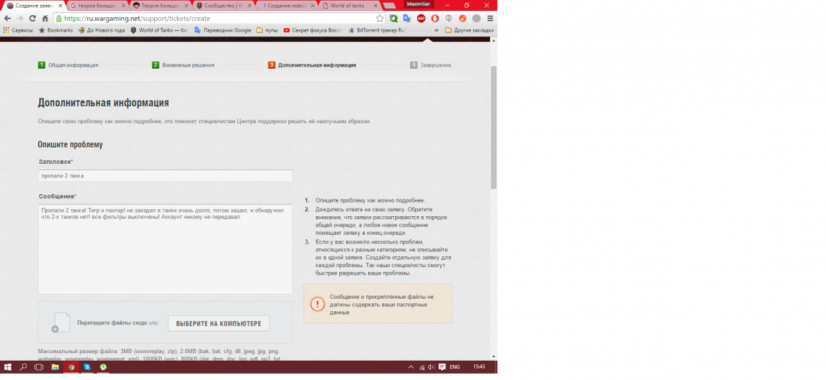 У меня возникла проблема, я хотел написать заявку в ЦПП, но заявка просто не хочет создаваться!! Я создаю, но просто обновляется страница!!http://cdn-frm-eu.wargaming.net/wot/ru/uploads/monthly_04_2016/post-5819733-0-99054100-1461501890_thumb.pnghttp://cdn-frm-eu.wargaming.net/wot/ru/uploads/monthly_04_2016/post-5819733-0-74311800-1461501914_thumb.png