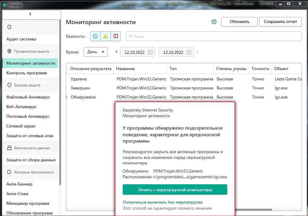 Всем бодрого вечера! Не нашёл подобной информации, решил запилить тему по вопросу. Если это уже обсуждалось - ткните носом, буду благодарен. Кратко суть проблемы: на РУ перешёл давно, сегодня установил LGC, импортировал танки и корабли, выползли обновления для обеих игр, танки обновились, корабли заканчивали обновляться и тут мой KIS выругался, снёс LGC и выдал мне пару таких банеров, в которых утверждает что точно обнаружил троян: Хотелось бы узнать (желательно у разработчиков) - чем вызвано такое буйное поведение почти всегда тихо дремлющего антивируса и как быть дальше? Заранее благодарен за любые конструктивные ответы.