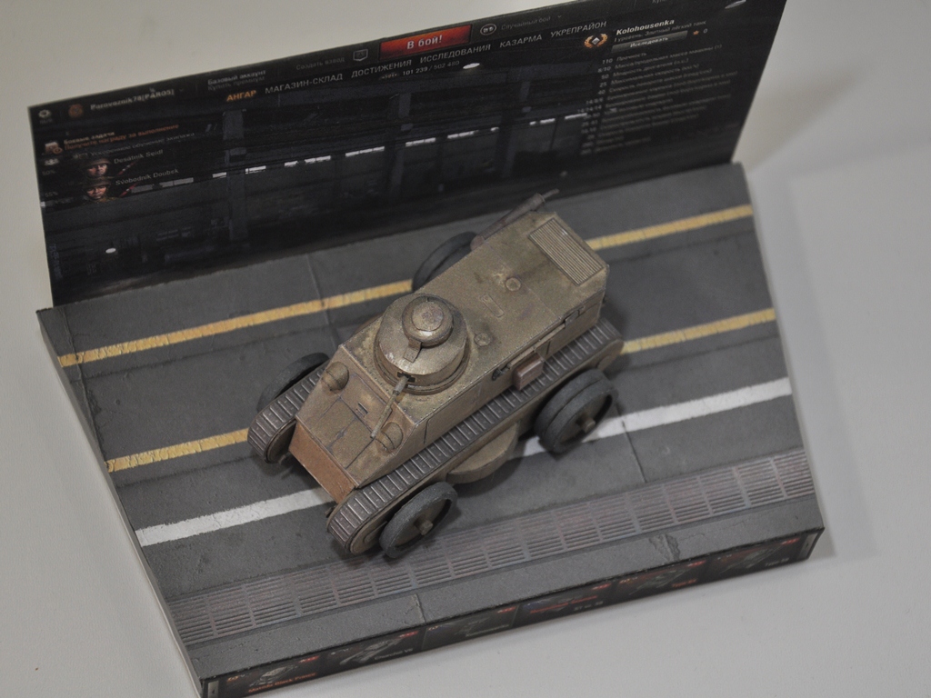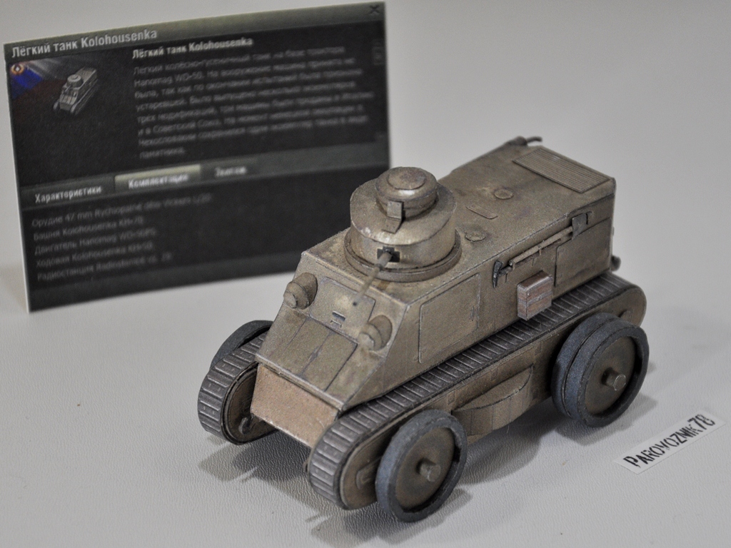 Доброго всем настроения. Вот позвольте похвастаться представить свою новую модель экспериментального чехословацкого легкого танка конца 1920-х — начала 1930-х годов: KH.50 (чеш. Kolohousenka 50, Колёсно-гусеничная 50). В игре мне он очень понравился, экипаж прокачал "на ура". Начал собирать еще на конкурс, но закончил только вот. (читай - лето, дача...) http://cdn-frm-eu.wargaming.net/wot/ru/uploads/monthly_06_2016/post-34977863-0-75427700-1467232482_thumb.jpg http://cdn-frm-eu.wargaming.net/wot/ru/uploads/monthly_06_2016/post-34977863-0-21871600-1467232500_thumb.jpg http://cdn-frm-eu.wargaming.net/wot/ru/uploads/monthly_06_2016/post-34977863-0-14005200-1467232514_thumb.jpg Несколько крупных планов: http://cdn-frm-eu.wargaming.net/wot/ru/uploads/monthly_06_2016/post-34977863-0-49001100-1467232547_thumb.jpg http://cdn-frm-eu.wargaming.net/wot/ru/uploads/monthly_06_2016/post-34977863-0-83556200-1467232558_thumb.jpg http://cdn-frm-eu.wargaming.net/wot/ru/uploads/monthly_06_2016/post-34977863-0-97186900-1467232569_thumb.jpg http://cdn-frm-eu.wargaming.net/wot/ru/uploads/monthly_06_2016/post-34977863-0-70930800-1467232580_thumb.jpg Отдельно на белом: http://cdn-frm-eu.wargaming.net/wot/ru/uploads/monthly_06_2016/post-34977863-0-27989300-1467232615_thumb.jpg http://cdn-frm-eu.wargaming.net/wot/ru/uploads/monthly_06_2016/post-34977863-0-36508500-1467232640_thumb.jpg http://cdn-frm-eu.wargaming.net/wot/ru/uploads/monthly_06_2016/post-34977863-0-52153200-1467232651_thumb.jpg http://cdn-frm-eu.wargaming.net/wot/ru/uploads/monthly_06_2016/post-34977863-0-19150700-1467232662_thumb.jpg http://cdn-frm-eu.wargaming.net/wot/ru/uploads/monthly_06_2016/post-34977863-0-87509700-1467232677_thumb.jpg Почему-то фотографий с процессом сборки не нашел (наверно стер по ошибке или на другую флешку снимал) На сегодня все, спасибо за внимание.