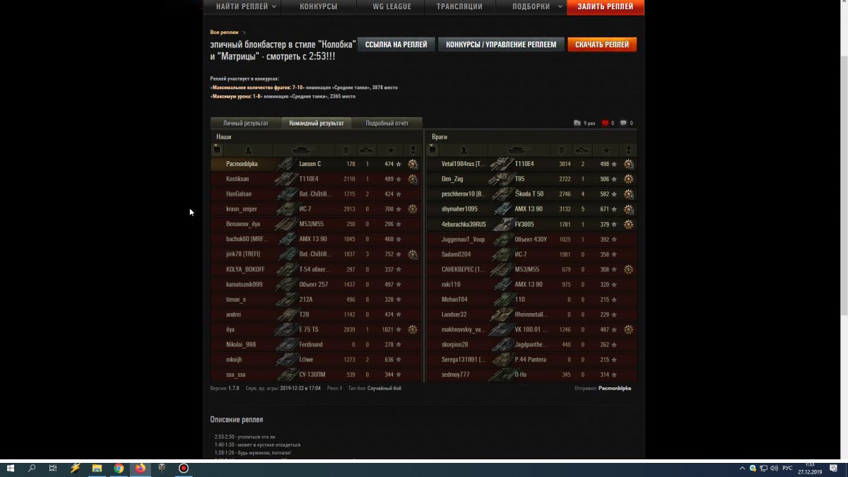 Осилил форматирование реплея в видео, разместил на ютуб самое - концовку: В первый раз, в первый класс, обрабатывал впервые, старался выделить ключевые моменты драматической развязки боя. Прошу сильно не ругать, никакой другой обработки нет (голос, музыка, эффекты). http://cdn-frm-eu.wargaming.net/wot/ru/uploads/monthly_12_2019/post-30007275-0-42092900-1577403572_thumb.jpg Перематываем до 2:53. Берем попкорн и восторгаемся видео! С 1:00 рекомендуется смотреть в замедленном просмотре - так гораздо лучше видны все ньюансы боя и драматизм развязки. http://wotreplays.ru/site/12577950#l_zigfrida-pacmonblpka-lansen_c http://cdn-frm-eu.wargaming.net/4.5/style_extra/mime_types/win_player.gif 221219_replay_last_battle.wotreplay 1,44МБ2:53-2:50 - утопиться что ли?2:43-2:40 - соберись тряпка!2:15-2:00 - думаем...думаем...какие варианты, какой план???1:40-1:30 - может в кустике отсидеться?1:28-1:26 - будь мужиком, погнали!0:57-0:49 - где все?0:50-0:50 - ...началось!0:51-0:46 - как не пробил?! не сразу понял, что Т95 не на захвате...стоп, а кто тогда на захвате?!0:45-0:44 - вот оно как! Т95 то у нас в роли вышибалы, а приманка то арта0:43-0:43 - ...есть такая сказка "Колобок"!...1 выстрел - я от дедушки ушел....0:41-0:41 - ...2 выстрел...и от бабушки ушел...0:40-0:38 - ...2 сек. до захвата! времени на перезарядку нет - иду на таран!!!0:39-0:39 - ...сбил! 46 сек. - уже не успевают!0:38-0:38 - Вы "Матрицу" смотрели? сейчас вкратце за 38 сек. все покажу наглядно0:36-0:35 - ...ключевой момент, сбил захват Т95 - эти 5 сек. сыграют решающую роль...0:30-0:28 - ...3 выстрел...и от зайца я ушел...0:28-0:26 - ...4 выстрел...прощай дедушка, тебя удар наверное хватит...0:26-0:23 - где остальные? куда бежать?0:22-0:22 - ...встали в 3-м на захват!!! но...секунду не успевают!!! (Т95 бьется в конвульсиях)0:22-0:17 - а вот и медведь нашелся...где же волк?...0:15-0:13 - ..."поворот не туда", тупик...или все-таки туда поворот?0:12-0:11 - ...5 выстрел...вся жизнь пролетела перед глазами...чуть в штаны не наложил, но от медведя ушел тоже...0:11-0:11 - а вот и волк...засада...0:08-0:06 - видно арта съехала с захвата, чтобы меня "достать"0:06-0:01 - видит око, да зуб неймет!...поворот все-таки оказался "туда"0:01-0:00 - посмотри в глаза отчаянию и безысходности! И зовите меня просто - Нео, избранный! 221219_replay_last_battle.wotreplay