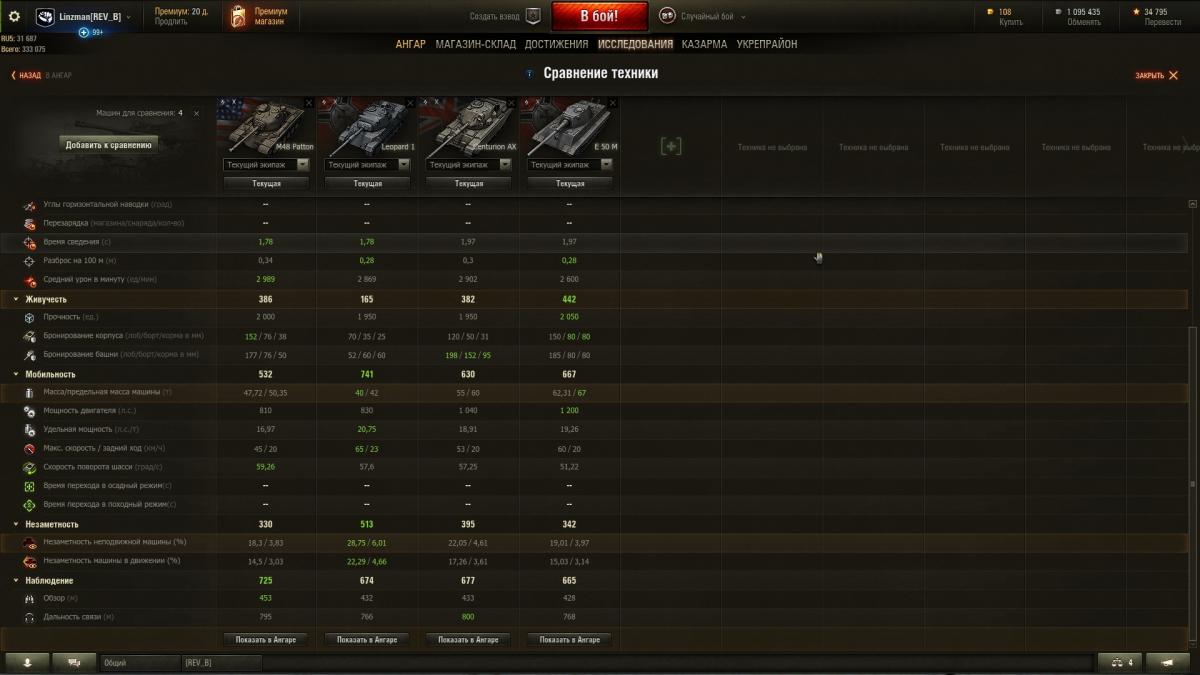 Доброго времени суток, играя в рандоме на Patton48 за последние 2-а патча ( проявилось больше всего) обратил внимание что очень сильно светится " как новогодняя елка" стоя в кустах не стреляя , это начало поткидывать , бесить, ты не понимаешь как, хотя обзор лучший и не знаешь кто , даже "ТУША" е50м светится меньше. Проведу статистику "незаметности " среди M48 Patton , E50M,Centurion AX, Leopard 1 так-как играю на этих танках и являются достаточно крупными ст. Сравнение (незаметности) танков с экипаж 100% без перков + камуфляж + вентилятор M48 Patton - неподвижен 11,27 % , в движении 9,21% Leopard 1 - неподвижен 17,08% , в движении 13,55% Centurion AX- неподвижен 15,03% , в движении 12,01% E50M - неподвижен 12,86%, в движении 10,48% ( эта туша даже в стоке менее заметен , но экипаж без перков) . Зная габариты этих танков уже хочется призадуматься в чем подвох ? Почему? Сравнение этих танков с перками , основные перки влияющие на незаметность это маскировка +боевое братство+камуфляж.( Ниже я прикреплю файлы с перками своих танков из ангара если кому интересно) M48 Patton - 5,39 перка , 400% незаметности по экипажу (братство и камуфляж на всех танках ) - 18,3% / 14,5% ( наблюдение 725, обзор 510) ( 2308 боев) Leopard 1- 4-е перка 388% незаметности по экипажу - 28,75% / 22,29% Centurion AX- 4,29 перка 260% незаметности по экипажу -22,05% / 17,29% E50M- 4,62 перка 362% незаметности по экипажу - 19,01 / 15,03% M48patton меньше по габаритам даже Centurion AX про E50M и не стоит говорить. ВОПРОС!!! В ЧЕМ Я ОШИБСЯ? ПОЧЕМУ ПОЛУЧАТСЯ ТАКАЯ ЕРУНДА? WG - ЗАБИЛО БОЛТ НА ЭТОТ ТАНК?( не нужно писать про его дпм и что ему кд подняли) . Centurion AX - в следующем патче АП по скорости , динамике и пушке , да он и так нормальный хоть успевает смыться при за свете и быстро перемещается по карте да и пушка у него точнее чем у M48 Patton. На M48 Patton уйти при за свете очень тяжело . В патче 17.0.3. бк вылетае при 2-м попадании, мехвод контужен постоянно, ствол начал ломаться, танк начал гореть чаще, как-то печально . ЧИТОВ В ИГРЕ УВЕЛИЧИЛОСЬ???? Не нужно писать про игру от красной линии это все таки ст , на Зигфрида, Энске, Сталинград, Париж, Химки и других картах такая вата не прокатит постоянно , урон вкидываешь а команда дохнет. Может пора его АПАТЬ ???