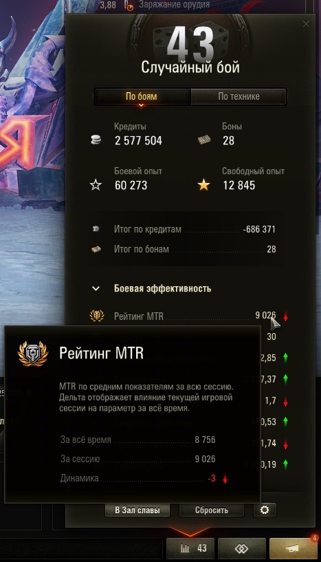 Всем привет в этой теме я хотел бы затронуть работу рейтинга MTR и показать своё недовольство в его работе! Начну с того что до серии боев мой рейтинг был 8759 за 33091 бой. После проведённых 43 боев с эффективностью 9026 (что является выше моего текущего рейтинга) по мнению Лесты мой рейтинг MTR должен уменьшиться на 3 очка (скриншот 1.png). Отсюда вопрос либо мой общий рейтинг занижен, либо рейтинг MTR сессионный статистики отображается неверно. Предположим мой рейтинг отображается верным, тогда нужно узнать с какой эффективностью (X) мне реально нужно было играть 43 боя что бы получить -3 очка. Формула будет такая: ((Общее число боев до серии боев * Рейтинг до серии боев) + (Кол-во боев в серии * X)) / (Итоговое число боев) = Рейтинг после серии боев ((33091 * 8759) + (43 * X)) / (33091 + 43) = 8756 (289844069 + 43X) / (33134) = 8756 (33134 * 8756) = 289844069 + 43X 290121304 = 289844069 + 43X 43X = 290121304 - 289844069 43X = 277235 X = 6447 MTR (Ответ может проверить любой кто знает математику 6 класса) Получается что только при игре в 6447 рейтинга MTR я должен уйти в -3 очка. И я не понимаю что разработчики намудрили с рейтингом что с улучшенной игрой ты уходишь в минус. Подолью еще масло в огонь и скажу что к 49 бою как только сессионный рейтинг MTR стал показывать 9452 я вышел в 0 (скриншот 2.png). Это как раз говорит о том что мой общий рейтинг отображается не правильно. Так как даже 6-класснику понятно что 0 может быть в том случае если общий рейтинг будет равен сессионному рейтингу. Хотелось бы услышать мнение разработчиков, особенно как не уходить в минус с игрой выше чем у тебя есть. Если это было "так задумано" тогда пусть сессионный рейтинг отображается корректно.
