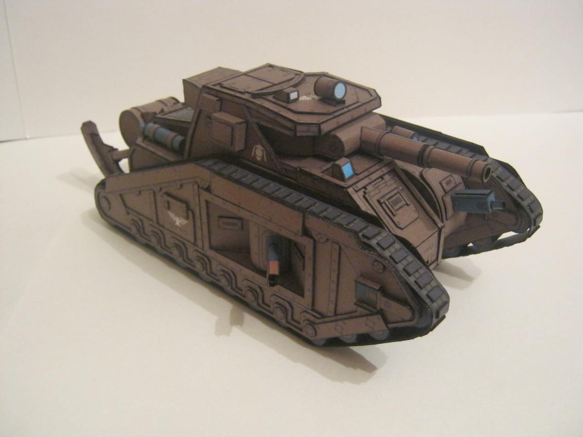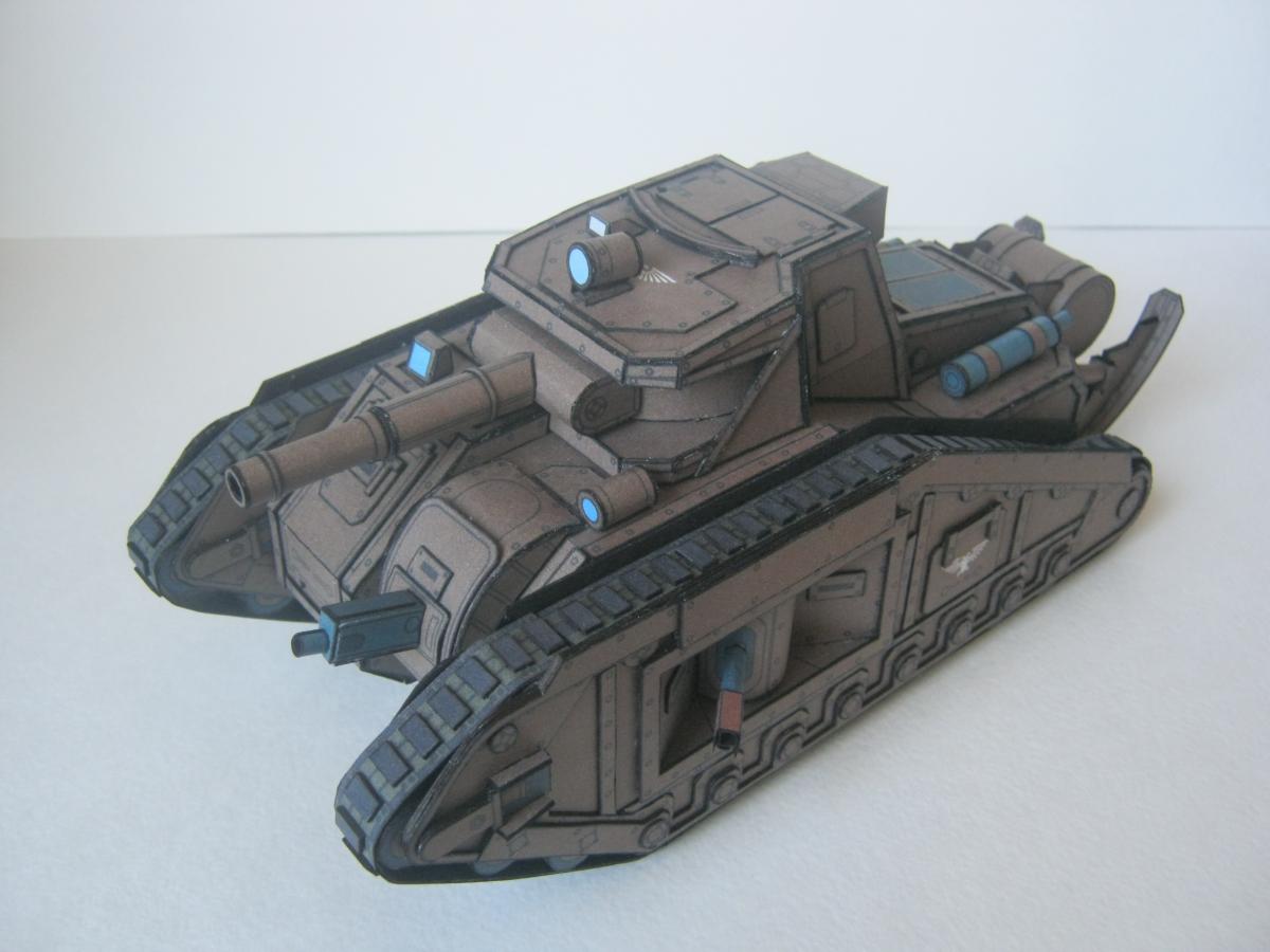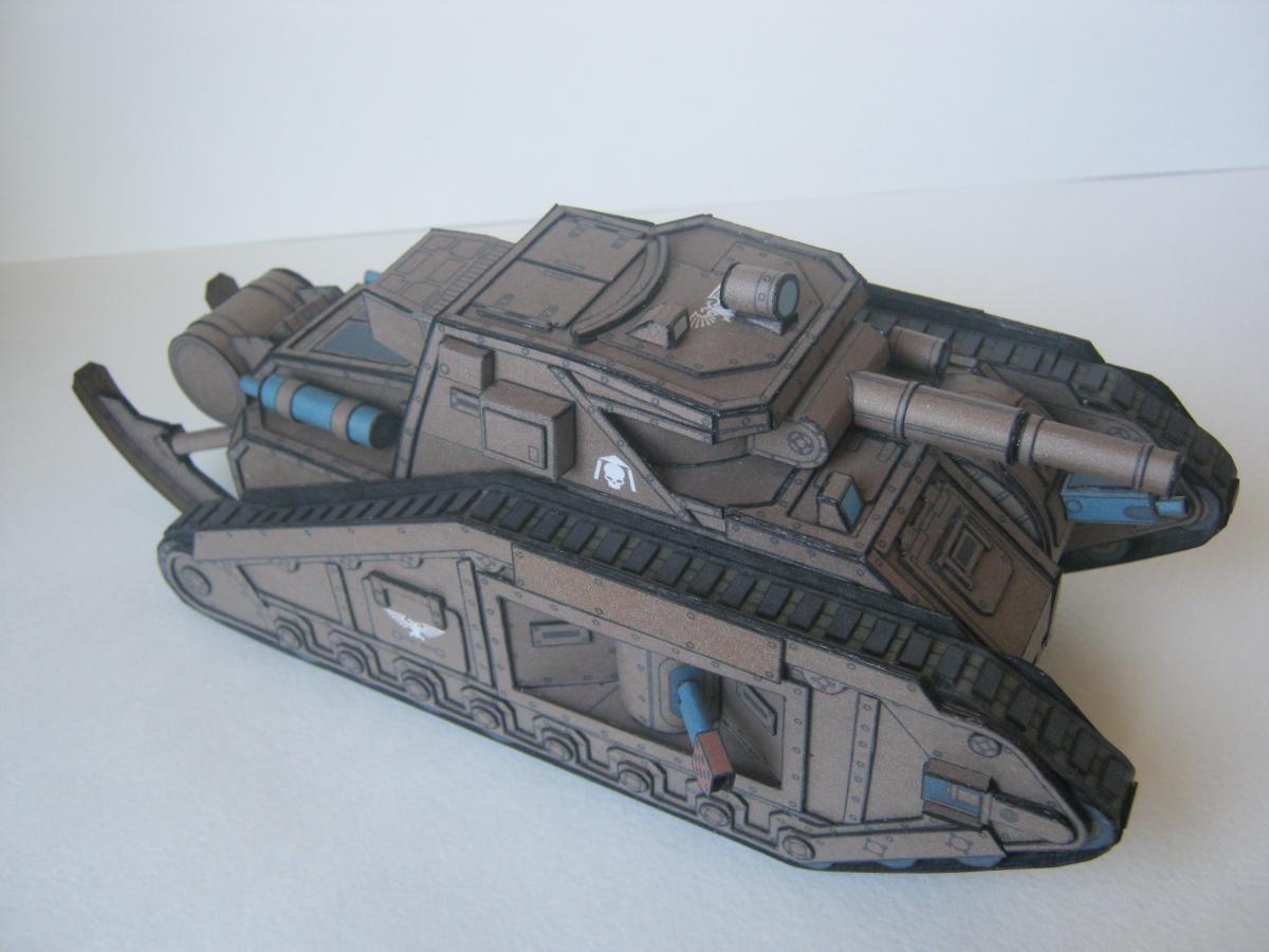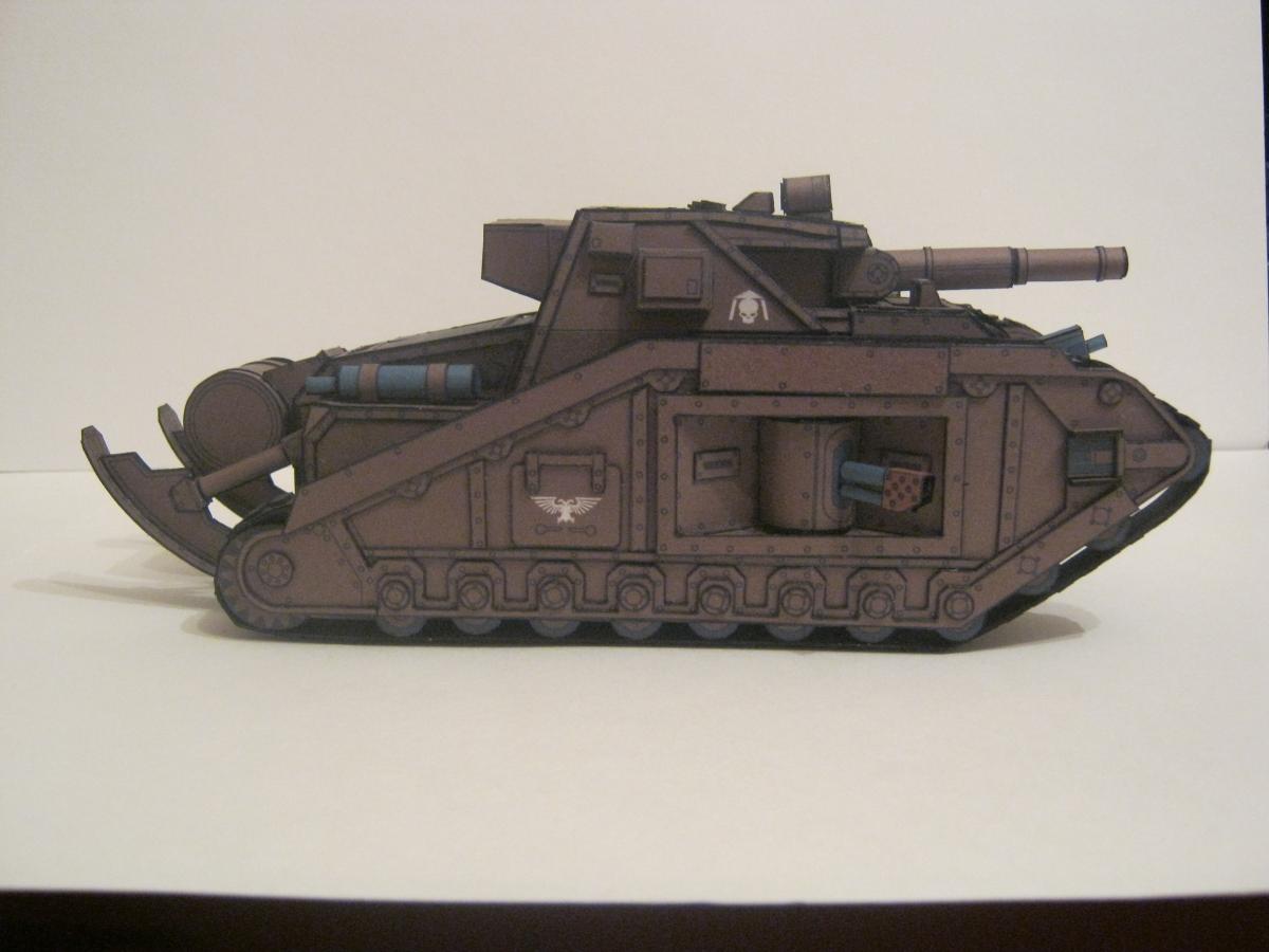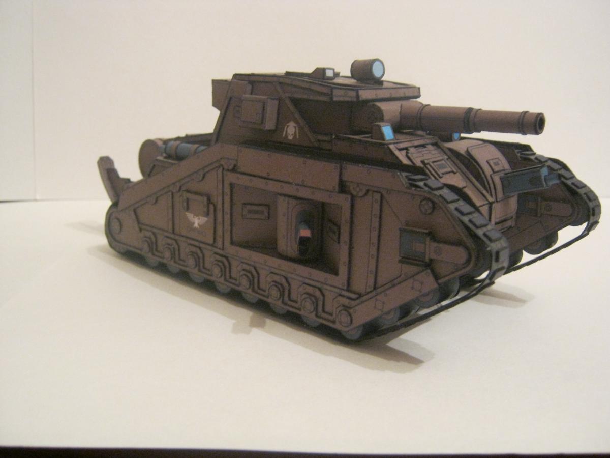 Итак, модель из вселенной Warhammer 40k, Malcador heavy tank, однако по своей конструкции это скорее ПТ-САУ, так как орудие расположено в неподвижной рубке, с ограниченным сектором обстрела. Немного игрового описания и игровые характеристики "...Дизайн этого танка имеет весьма длинную историю. Он задумывался, как временная замена танку «Леман Расс», и с введением последнего, практически исчез . Во многих регионах Империума Малкадор давно снят с производства, а то и никогда не производился, что породило ошибочное мнение, что он используется либо еретиками, либо отсталыми мирами. Здесь также важен и тот факт, что во многих мирах, где Малкадор всё же используется, он переведён в резерв, а если и используется в бою, то только как дань традиции. Количество миров-кузниц, где производятся запчасти для этого танка, крайне мало, а происхождение его является загадкой даже среди Механикумов. По самой распространенной версии, своё имя танк получил в честь Малкадора Сиджилайта – сподвижника Императора, фигуры крайне загадочной. И история этого танка тесно связана с событиями Великой Ереси. В те тёмные и опасные времена возникла большая потребность в ресурсах, необходимо было заново создать огромные армии. Знаменитые Ленд Рейдеры остались только у космодесанта, и чтобы восстановить получившуюся пустоту, стали активно создаваться дешёвые и неприхотливые машины, и Малкадор в их числе. Как бы то ни было, уже сложно установить истину спустя столько лет. Малкадор предназначался только для временного использования, - он неповоротливее и гораздо тяжелее Леман Расса. Малкадор, благодаря своей толстой броне, чрезвычайно прочен, и также отлично вооружён: помимо главного орудия, в спонсонах и башне могут быть установлены тяжёлые стабберы, тяжёлые болтеры, огнеметы или лазпушки. Но он, всё же, проигрывает Леман Рассу во многих аспектах, прежде всего в подвижности и в секторе обстрела. Если враг прорывает линию обороны, и бой становится хаотичным, этот неповоротливый танк практически бесполезен. Опытные командиры, могут исключить эти недостатки, поддерживая эскадроны Малкадоров пехотой или другими машинами. Тем не менее, ещё один недостаток таких танков – ненадёжные двигатели, которые очень часто перегреваются и выходят из строя. Мощность основного двигателя Малкадора, газовой турбины (вариант, широко распространённый в сельскохозяйственных машинах), является недостаточной для танка подобной величины и массы. Из-за этого, у него малая производительность и неэкономичный расход топлива. Вот почему командиры предпочитают Малкадору более современные машины. "Технические характеристики: Обозначение: 8677-032-8391-ML021 Название: Малкадор Родной мир-кузница: М’Кханд Количество известных модификаций: 13 Экипаж: Водитель, командир, 4 стрелка, заряжающий Двигатель: HL330 12-цилиндровый Вес: 105 тонн Длина: 9.6 м Ширина: 4.4 м Высота: 3.9 м Клиренс: 0.65 м Максимальная скорость: 25км/ч Максимальная скорость по бездорожью: 18км/ч Главное орудие: Боевая пушка Вторичное вооружение: 3 тяжёлых болтера Траверз: 60° Вертикальная наводка: -2° +20° Количество боеприпасов для главного орудия: 32 снаряда Количество боеприпасов для вторичного вооружения: 7500 снарядов Толщина брони: надстройка - 180 мм корпус - 160 ммДанная модель несет в боковых спонсонах тяжелые огнеметы, это небольшое отличие от исходной развертк
