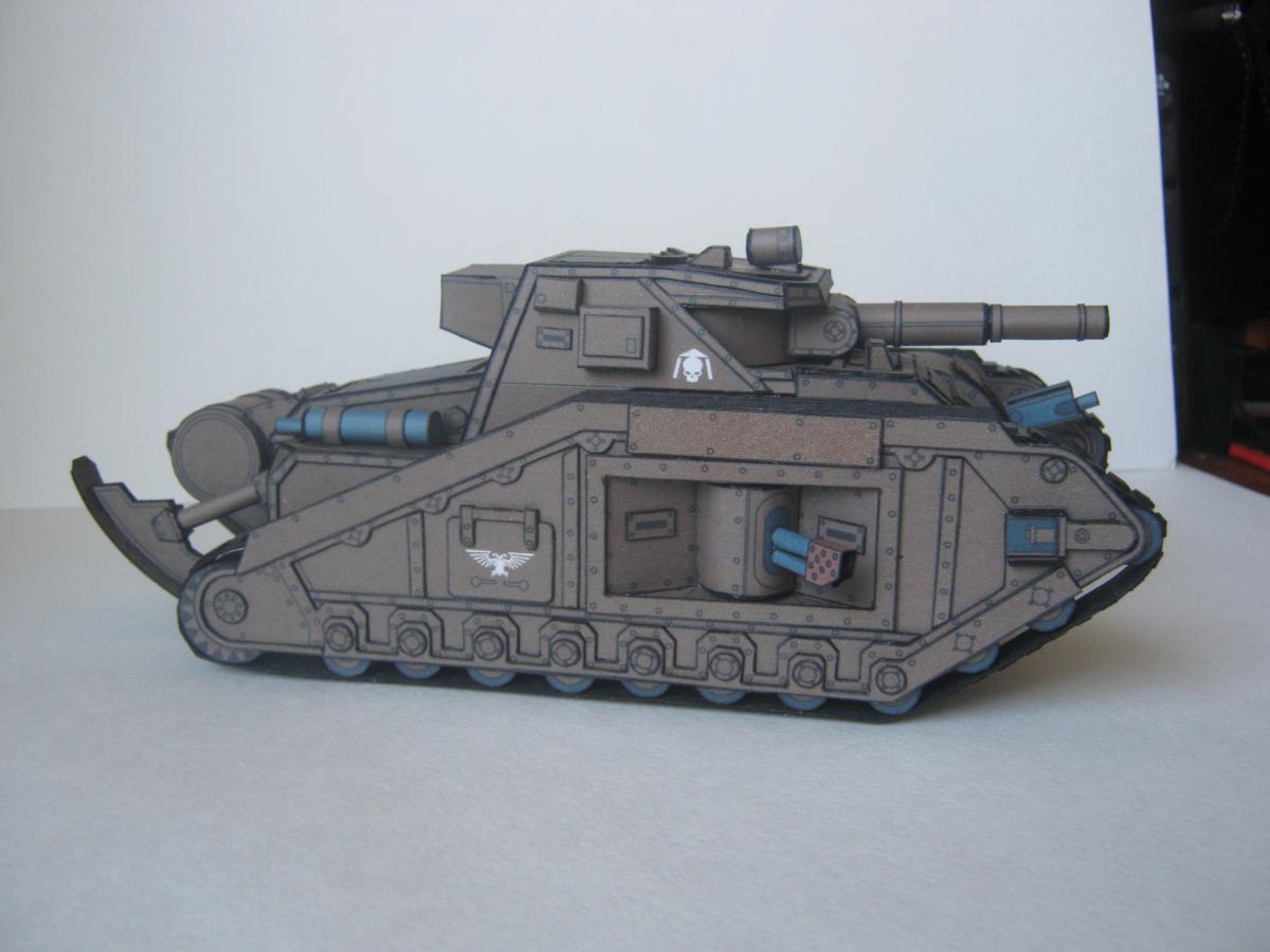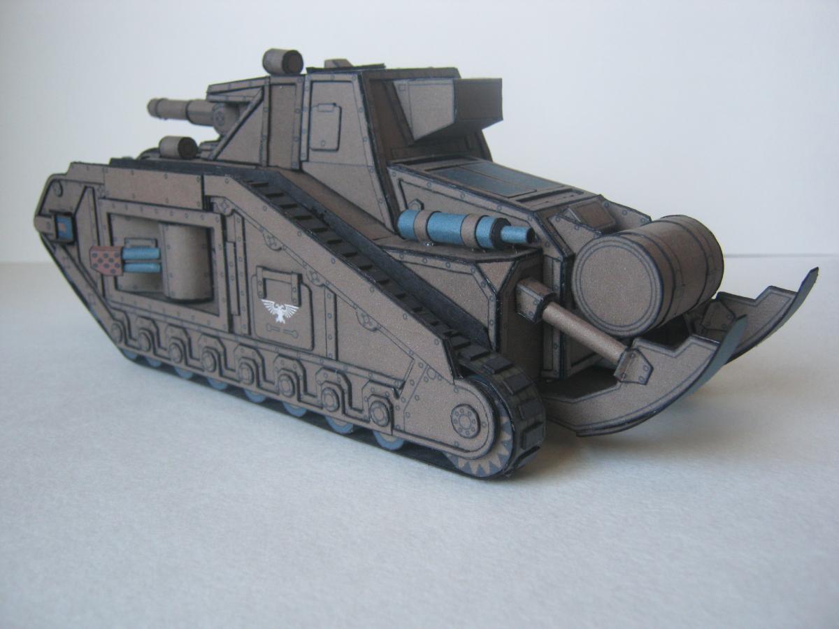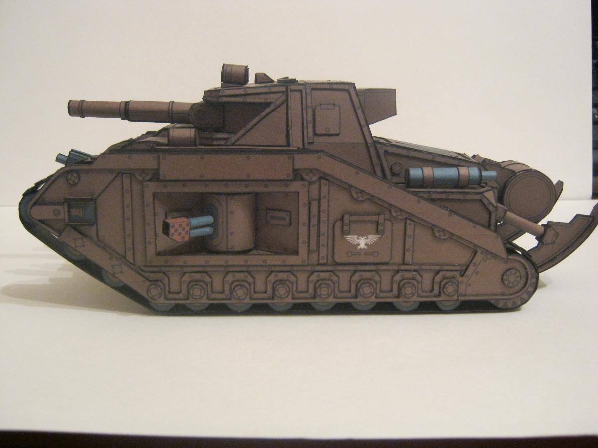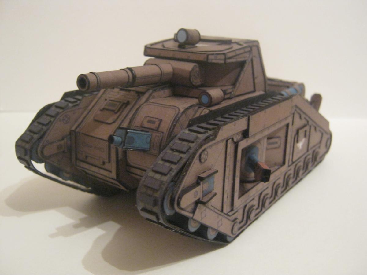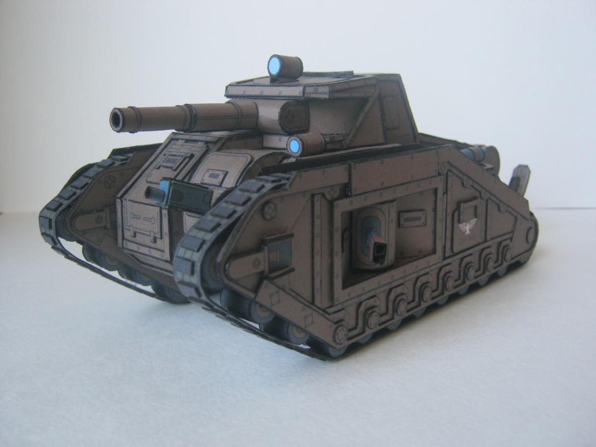 Итак, модель из вселенной Warhammer 40k, Malcador heavy tank, однако по своей конструкции это скорее ПТ-САУ, так как орудие расположено в неподвижной рубке, с ограниченным сектором обстрела. Немного игрового описания и игровые характеристики "...Дизайн этого танка имеет весьма длинную историю. Он задумывался, как временная замена танку «Леман Расс», и с введением последнего, практически исчез . Во многих регионах Империума Малкадор давно снят с производства, а то и никогда не производился, что породило ошибочное мнение, что он используется либо еретиками, либо отсталыми мирами. Здесь также важен и тот факт, что во многих мирах, где Малкадор всё же используется, он переведён в резерв, а если и используется в бою, то только как дань традиции. Количество миров-кузниц, где производятся запчасти для этого танка, крайне мало, а происхождение его является загадкой даже среди Механикумов. По самой распространенной версии, своё имя танк получил в честь Малкадора Сиджилайта – сподвижника Императора, фигуры крайне загадочной. И история этого танка тесно связана с событиями Великой Ереси. В те тёмные и опасные времена возникла большая потребность в ресурсах, необходимо было заново создать огромные армии. Знаменитые Ленд Рейдеры остались только у космодесанта, и чтобы восстановить получившуюся пустоту, стали активно создаваться дешёвые и неприхотливые машины, и Малкадор в их числе. Как бы то ни было, уже сложно установить истину спустя столько лет. Малкадор предназначался только для временного использования, - он неповоротливее и гораздо тяжелее Леман Расса. Малкадор, благодаря своей толстой броне, чрезвычайно прочен, и также отлично вооружён: помимо главного орудия, в спонсонах и башне могут быть установлены тяжёлые стабберы, тяжёлые болтеры, огнеметы или лазпушки. Но он, всё же, проигрывает Леман Рассу во многих аспектах, прежде всего в подвижности и в секторе обстрела. Если враг прорывает линию обороны, и бой становится хаотичным, этот неповоротливый танк практически бесполезен. Опытные командиры, могут исключить эти недостатки, поддерживая эскадроны Малкадоров пехотой или другими машинами. Тем не менее, ещё один недостаток таких танков – ненадёжные двигатели, которые очень часто перегреваются и выходят из строя. Мощность основного двигателя Малкадора, газовой турбины (вариант, широко распространённый в сельскохозяйственных машинах), является недостаточной для танка подобной величины и массы. Из-за этого, у него малая производительность и неэкономичный расход топлива. Вот почему командиры предпочитают Малкадору более современные машины. "Технические характеристики: Обозначение: 8677-032-8391-ML021 Название: Малкадор Родной мир-кузница: М’Кханд Количество известных модификаций: 13 Экипаж: Водитель, командир, 4 стрелка, заряжающий Двигатель: HL330 12-цилиндровый Вес: 105 тонн Длина: 9.6 м Ширина: 4.4 м Высота: 3.9 м Клиренс: 0.65 м Максимальная скорость: 25км/ч Максимальная скорость по бездорожью: 18км/ч Главное орудие: Боевая пушка Вторичное вооружение: 3 тяжёлых болтера Траверз: 60° Вертикальная наводка: -2° +20° Количество боеприпасов для главного орудия: 32 снаряда Количество боеприпасов для вторичного вооружения: 7500 снарядов Толщина брони: надстройка - 180 мм корпус - 160 ммДанная модель несет в боковых спонсонах тяжелые огнеметы, это небольшое отличие от исходной развертк