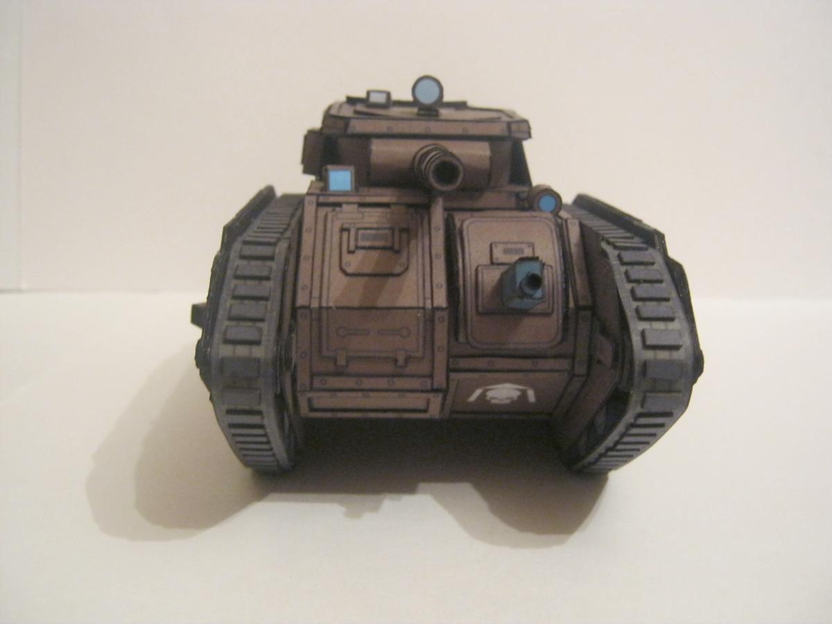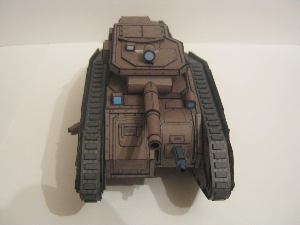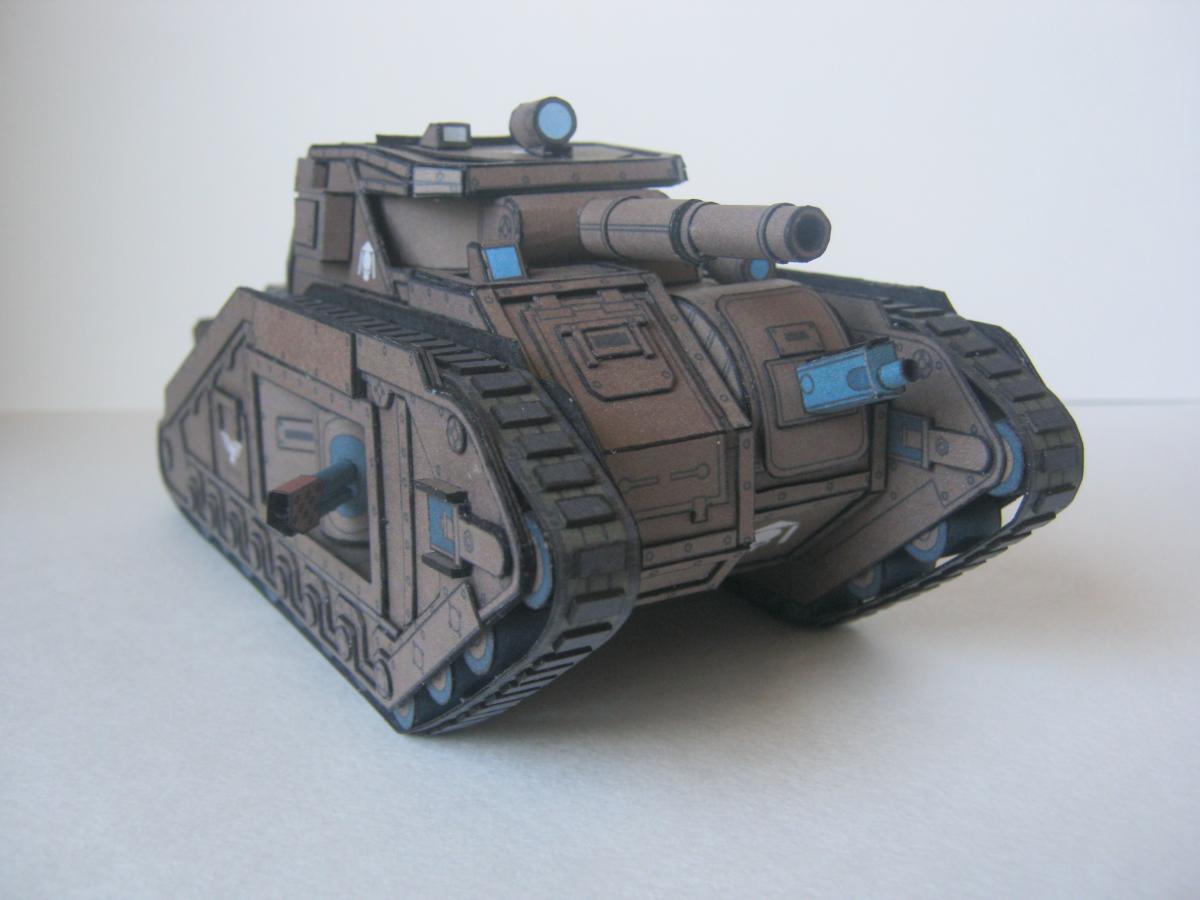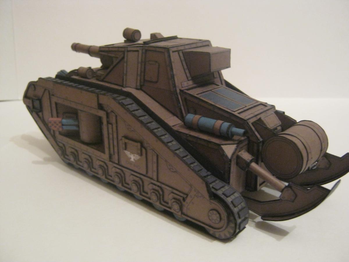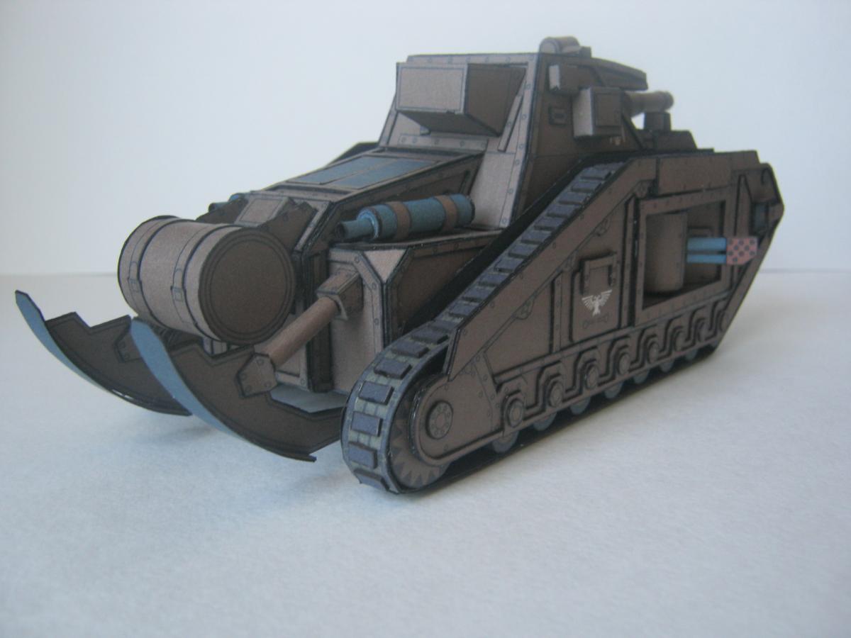 Итак, модель из вселенной Warhammer 40k, Malcador heavy tank, однако по своей конструкции это скорее ПТ-САУ, так как орудие расположено в неподвижной рубке, с ограниченным сектором обстрела. Немного игрового описания и игровые характеристики "...Дизайн этого танка имеет весьма длинную историю. Он задумывался, как временная замена танку «Леман Расс», и с введением последнего, практически исчез . Во многих регионах Империума Малкадор давно снят с производства, а то и никогда не производился, что породило ошибочное мнение, что он используется либо еретиками, либо отсталыми мирами. Здесь также важен и тот факт, что во многих мирах, где Малкадор всё же используется, он переведён в резерв, а если и используется в бою, то только как дань традиции. Количество миров-кузниц, где производятся запчасти для этого танка, крайне мало, а происхождение его является загадкой даже среди Механикумов. По самой распространенной версии, своё имя танк получил в честь Малкадора Сиджилайта – сподвижника Императора, фигуры крайне загадочной. И история этого танка тесно связана с событиями Великой Ереси. В те тёмные и опасные времена возникла большая потребность в ресурсах, необходимо было заново создать огромные армии. Знаменитые Ленд Рейдеры остались только у космодесанта, и чтобы восстановить получившуюся пустоту, стали активно создаваться дешёвые и неприхотливые машины, и Малкадор в их числе. Как бы то ни было, уже сложно установить истину спустя столько лет. Малкадор предназначался только для временного использования, - он неповоротливее и гораздо тяжелее Леман Расса. Малкадор, благодаря своей толстой броне, чрезвычайно прочен, и также отлично вооружён: помимо главного орудия, в спонсонах и башне могут быть установлены тяжёлые стабберы, тяжёлые болтеры, огнеметы или лазпушки. Но он, всё же, проигрывает Леман Рассу во многих аспектах, прежде всего в подвижности и в секторе обстрела. Если враг прорывает линию обороны, и бой становится хаотичным, этот неповоротливый танк практически бесполезен. Опытные командиры, могут исключить эти недостатки, поддерживая эскадроны Малкадоров пехотой или другими машинами. Тем не менее, ещё один недостаток таких танков – ненадёжные двигатели, которые очень часто перегреваются и выходят из строя. Мощность основного двигателя Малкадора, газовой турбины (вариант, широко распространённый в сельскохозяйственных машинах), является недостаточной для танка подобной величины и массы. Из-за этого, у него малая производительность и неэкономичный расход топлива. Вот почему командиры предпочитают Малкадору более современные машины. "Технические характеристики: Обозначение: 8677-032-8391-ML021 Название: Малкадор Родной мир-кузница: М’Кханд Количество известных модификаций: 13 Экипаж: Водитель, командир, 4 стрелка, заряжающий Двигатель: HL330 12-цилиндровый Вес: 105 тонн Длина: 9.6 м Ширина: 4.4 м Высота: 3.9 м Клиренс: 0.65 м Максимальная скорость: 25км/ч Максимальная скорость по бездорожью: 18км/ч Главное орудие: Боевая пушка Вторичное вооружение: 3 тяжёлых болтера Траверз: 60° Вертикальная наводка: -2° +20° Количество боеприпасов для главного орудия: 32 снаряда Количество боеприпасов для вторичного вооружения: 7500 снарядов Толщина брони: надстройка - 180 мм корпус - 160 ммДанная модель несет в боковых спонсонах тяжелые огнеметы, это небольшое отличие от исходной развертк