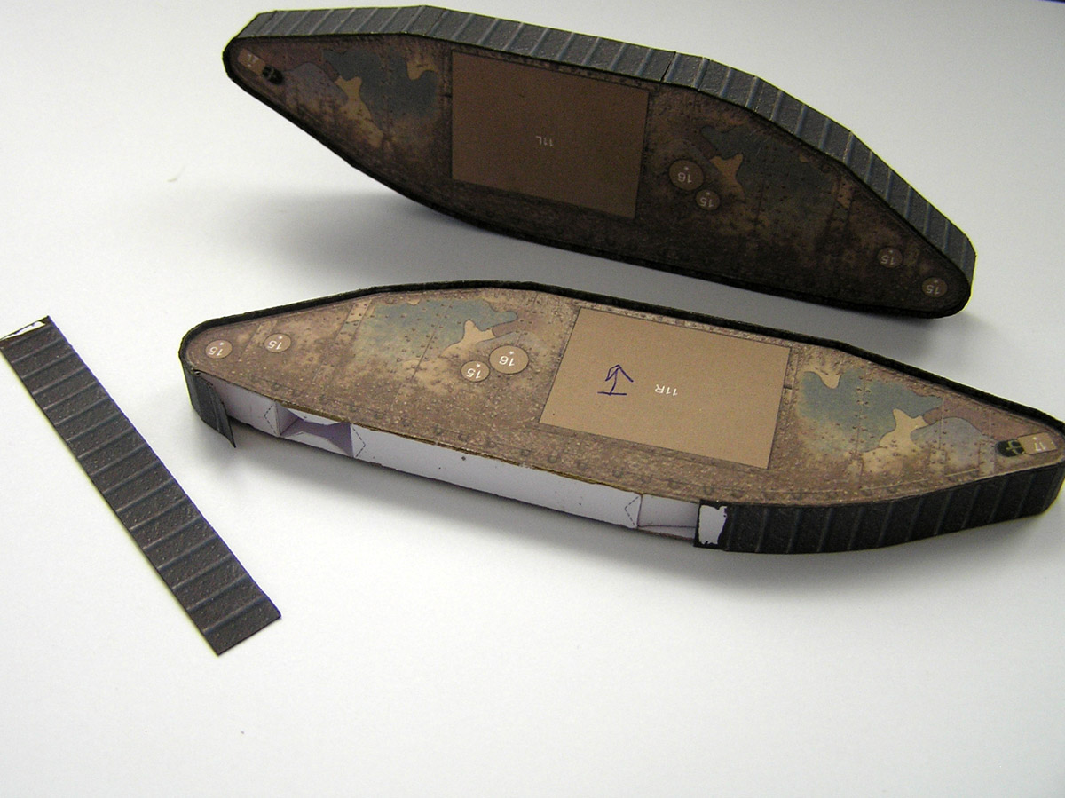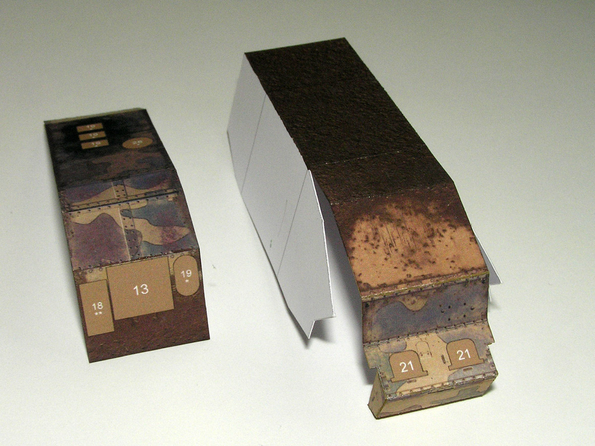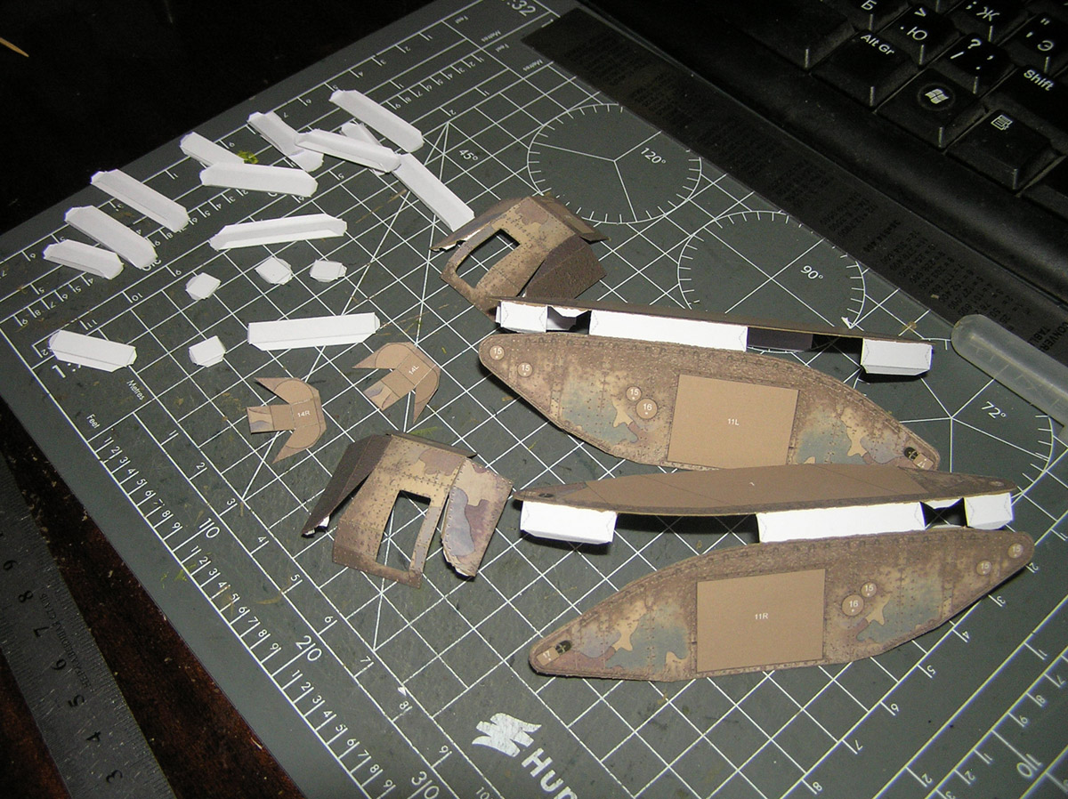 http://cdn-frm-eu.wargaming.net/wot/ru/uploads/monthly_09_2016/post-4861458-0-37033500-1474277446.jpg Еще раз поздравляем всех с 100-летием танка! Targo_Kain, представляет рассказ о сборке модели "Mark I. Бронекоробочка" (стиль изложения автора сохранен). Рекомендуем перед началом сборки ознакомиться с статьей о инструментах и материалах для бумажного моделизма. Предыдущие статьи автора: "M103", "Type 5 Heavy", "AMX 50 B", "Японский Тигр", танка Т-54, ИС-2 и ПТ-САУ: Charioteer, 1 http://cdn-frm-eu.wargaming.net/wot/ru/uploads/monthly_09_2016/post-4861458-0-97502300-1474278039_thumb.jpg Начнём с корпуса. Он совсем простой. На фото детали 1 и 3 вырезанные, согнутые где надо и с подкрашенными торцами. 2 http://cdn-frm-eu.wargaming.net/wot/ru/uploads/monthly_09_2016/post-4861458-0-82448600-1474278040_thumb.jpg Корпус, деталь 1 внутрь вставлены шпангоуты – детали 2. Можно приклеить деталь 3 на клапана детали 1, но я их срезал и нарастил толщину боковых стенок корпуса. Из-за этого детали 2 пришлось заузить. Выбор за вами. 3 http://cdn-frm-eu.wargaming.net/wot/ru/uploads/monthly_09_2016/post-4861458-0-95763700-1474278041_thumb.jpg Вот корпус уже собран. Простой, как кирпич, немного заточенный спереди. 4 http://cdn-frm-eu.wargaming.net/wot/ru/uploads/monthly_09_2016/post-4861458-0-01435100-1474278043_thumb.jpg Корпус вид сзади-сбоку. 5 http://cdn-frm-eu.wargaming.net/wot/ru/uploads/monthly_09_2016/post-4861458-0-88756600-1474278043_thumb.jpg А теперь будем собирать самое сложное в этой модели – гусеничные блоки. На фото сами блоки – детали 4 левая и правая, шпангоуты внутрь них детали с 5 по 10, спонсоны для орудий – детали 12 и 14. Вырезано, согнуто, торцы подкрашены. 6 http://cdn-frm-eu.wargaming.net/wot/ru/uploads/monthly_09_2016/post-4861458-0-97206900-1474278044_thumb.jpg Тоже самое, что и на предыдущем фото, под другим ракурсом. 7 http://cdn-frm-eu.wargaming.net/wot/ru/uploads/monthly_09_2016/post-4861458-0-35423600-1474278046_thumb.jpg Вклейка внутрь детали 4 шпангоутов (с 5 по 10). Шпангоуты приклеены основанием, но ещё не склеены между собой. Левую и правую детали 4 на фото я разместил так, что бы было понятно, зачем нужны линии. 8 http://cdn-frm-eu.wargaming.net/wot/ru/uploads/monthly_09_2016/post-4861458-0-37470600-1474278047_thumb.jpg Тоже самое, что и на предыдущем фото, но ракурс взят выше – что бы можно было рассмотреть все детали. 9 http://cdn-frm-eu.wargaming.net/wot/ru/uploads/monthly_09_2016/post-4861458-0-35712300-1474278048_thumb.jpg Шпангоуты оконечности гусеничного блока склеены между собой в "кессон" (жесткая конструкция по типу ящика). С этого момента нужно внимательно следить, что бы всю конструкцию гусеничного блока не "повело винтом" или "волной", пока блок не будет склеен полностью. 10 http://cdn-frm-eu.wargaming.net/wot/ru/uploads/monthly_09_2016/post-4861458-0-83485000-1474278049_thumb.jpg Склеены кессоны обеих оконечностей гусеничного блока. Центральный кессон ещё не полный – одну его стенку образует часть детали 4. Будьте очень внимательны на этом этапе и далее, т.к. от правильности геометрии этих силовых элементов зависит правильность сборки всей модели. 11 http://cdn-frm-eu.wargaming.net/wot/ru/uploads/monthly_09_2016/post-4861458-0-94134100-1474278050_thumb.jpg Шпангоуты обеих гусеничных блоков склеены в кессоны. Обратите внимание – верхний гусеничный блок сделан стандартно из заданным по развёрткам и инструкции количеством деталей с 5 по 10, нижний же на фото имеет дополнительные шпангоуты, которые соединяют три кессона (носовой, центральный и кормовой) блока между собой. Это даст нам большую жёсткость конструкции и снизит вероятность поводки блока. Однако будет и недостаток – если блок всё таки поведёт – исправить будет труднее. В варианте по инструкции же носовой и кормовой кессоны будут иметь некоторую степень свободы – выше вероятность неровной склейки, но и проще будет исправить. Кроме того, обратите внимание – в нижнем блоке есть доп
