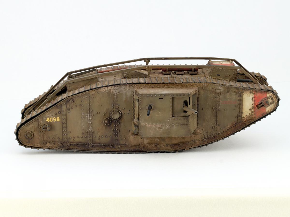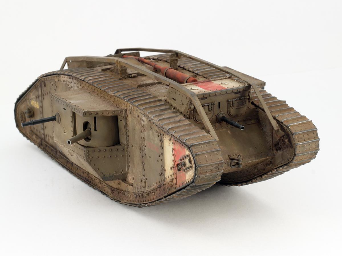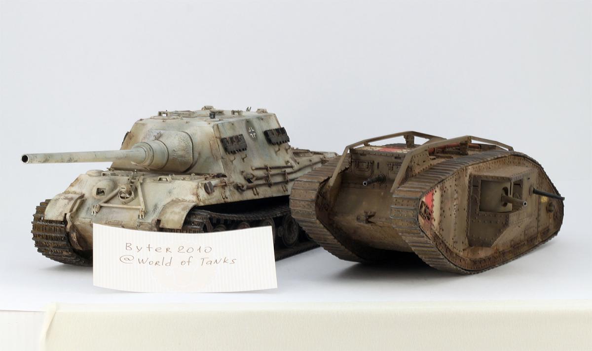 Всем привет. Представляю вам свой Mark IV. Модель искоробочная, ибо в матчасти этих монстриков я не разбираюсь, просто хотелось заиметь одного такого на полку. Размер, конечно, поражает, эта штуковина оказалась длиной с Ягдтигра! Качество отливок неплохое, а вот собираемость разочаровала. Панели плохо стыкуются, потребовалось много шпаклевки при подгонке. Особенно тяжело пришлось с траками. Сделать их рабочими, как предлагает производитель, у меня не получилось, пришлось клеить сплошной лентой, что стало причиной пары косяков. Скорее всего, в ближайшем будущем заменю их на наборные от какого-нибудь стороннего производителя. И еще хочу отметить один момент. Полностью склеенная модель имеет не очень правильную развесовку и норовит завалиться на нос. Я рекомендую добавить пару свинцовых грузов в корму в начале сборки. Покраска производилась акрилами Tamiya, тонировка - маслом и пигментами АК. Удачи в боях, Евгений.