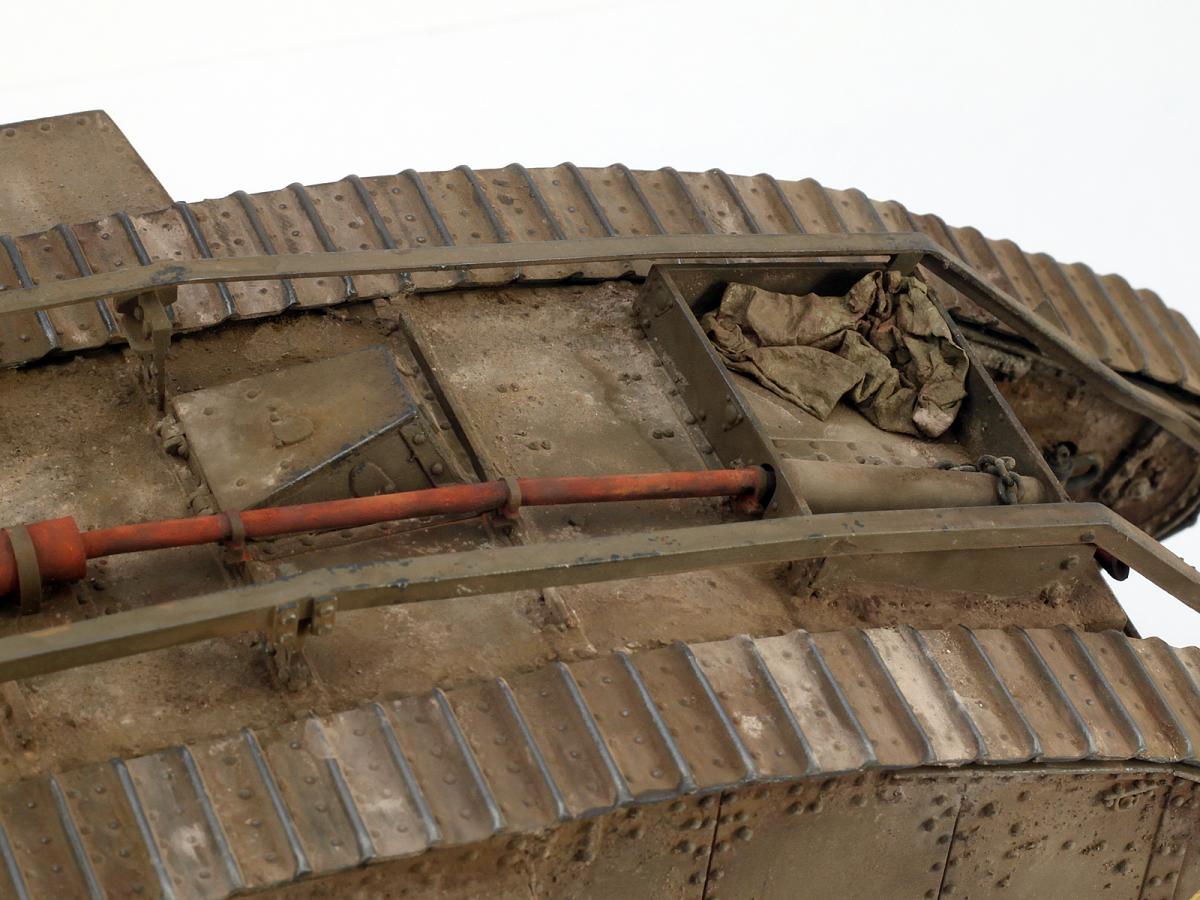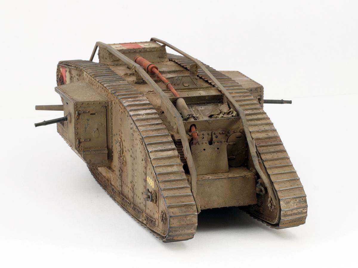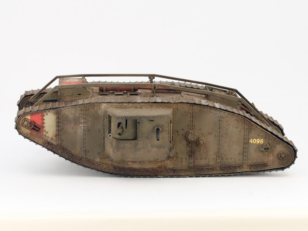 Всем привет. Представляю вам свой Mark IV. Модель искоробочная, ибо в матчасти этих монстриков я не разбираюсь, просто хотелось заиметь одного такого на полку. Размер, конечно, поражает, эта штуковина оказалась длиной с Ягдтигра! Качество отливок неплохое, а вот собираемость разочаровала. Панели плохо стыкуются, потребовалось много шпаклевки при подгонке. Особенно тяжело пришлось с траками. Сделать их рабочими, как предлагает производитель, у меня не получилось, пришлось клеить сплошной лентой, что стало причиной пары косяков. Скорее всего, в ближайшем будущем заменю их на наборные от какого-нибудь стороннего производителя. И еще хочу отметить один момент. Полностью склеенная модель имеет не очень правильную развесовку и норовит завалиться на нос. Я рекомендую добавить пару свинцовых грузов в корму в начале сборки. Покраска производилась акрилами Tamiya, тонировка - маслом и пигментами АК. Удачи в боях, Евгений.