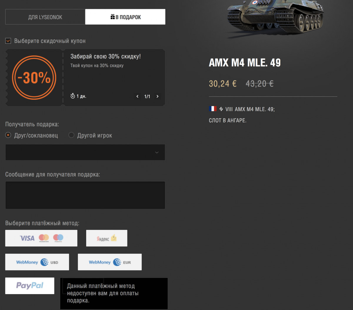 Приветствую, у меня не получается оплатить с помощью PayPal прем танк в магазине, в подарок другу с формулировкой: "Данный платёжный метод не доступен вам для оплаты подарка" (вам, с маленькой буквы - не моя опечатка). При этом указанный способ оплаты позволяет приобрести танк для себя. Проблема такого рода платежа исключительно моя или у кого-то данное явление так же наблюдается? ЦПП проблему не решил, на продление купона для данной покупки отказался, равно как и на перевод покупки на аккаунт друга, сразу после приобретения.