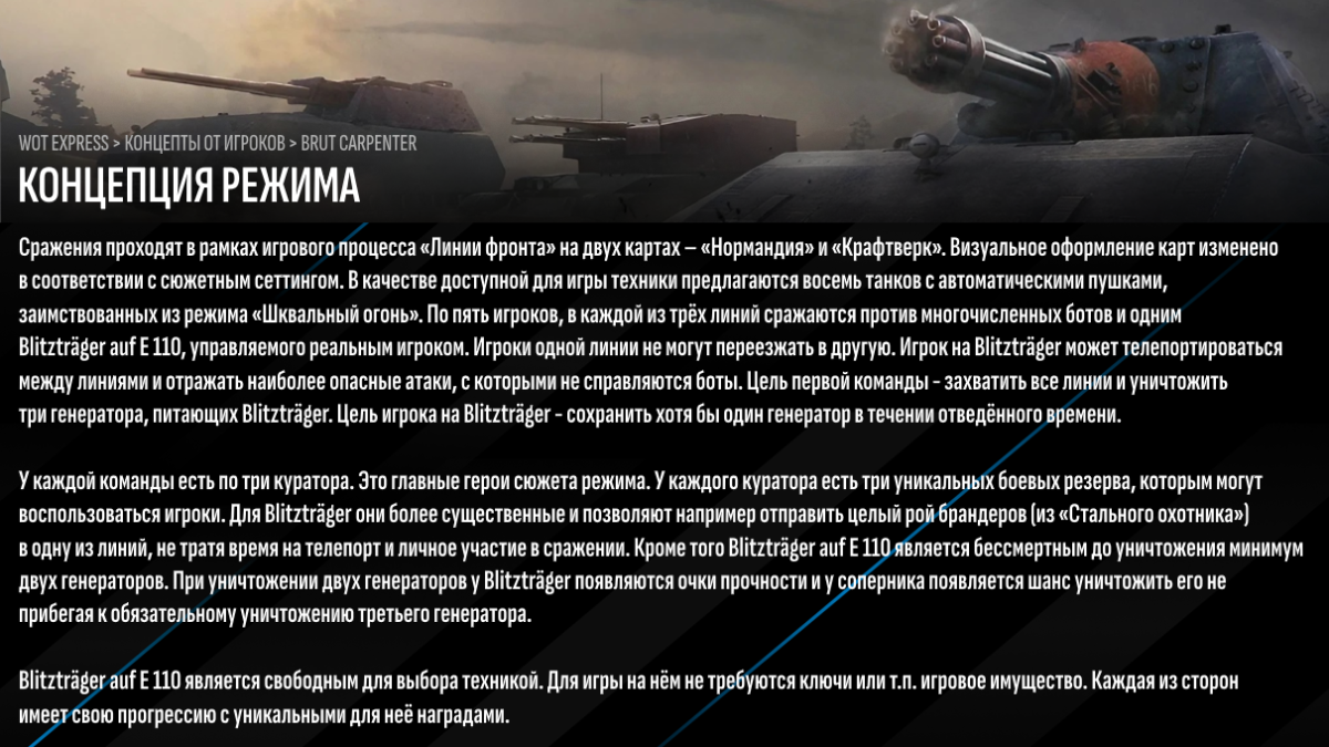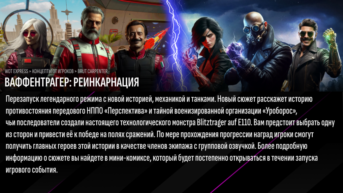 Концепт перезапуска легендарного режима с новой историей, сеттингом и игровыми механиками. Представляет из себя гибрид "Линии фронта", "Шквального огня" и PvE-режима. При создании концепта исходил из того, что нельзя использовать старый лор сюжета и саму механику геймплея старого режима. Вместо это совершенно новый сюжет с другими персонажами, связанными с лором НППО "Перспектива" (нового лора Лесты из БП и некоторых акций). Прошу заметить, что представленная механика геймплея лишь черновой вариант, который необходимо тестировать и пробовать разные варианты. В целом идея в том, чтобы создать драйвовый расслабляющий геймплей, где можно выносить ботов с помощью автоматических пушек. Но для баланса в противовес ставится неуязвимый Ваффентрагер, которым управляет реальный игрок. Сюжет события можно рассказать в виде мини-комикса в клиенте игры, страницы которой раскрывались бы постепенно в течении запуска режима (видел подобное в Мире Кораблей). Естественно можно и нужно добавить коробки в подобное событие. Насчёт уникального экипажа возможна такая фича как выбор стороны перед запуском режима (Перспектива или Уроборос) и игрок получает возможность получить только троих членов экипажа с одной стороны. Остальных можно докупить отдельно в составе набора или выбить в коробках. При этом независимо от выбора стороны можно будет играть и за машины с автоматическими пушками, и за Ваффентрагер. Больше подробностей как геймплея, как и сюжета прикрепил в виде фотокарточек внизу. Визуальные образы персонажей были созданы с помощью нейросети DALL-E 3