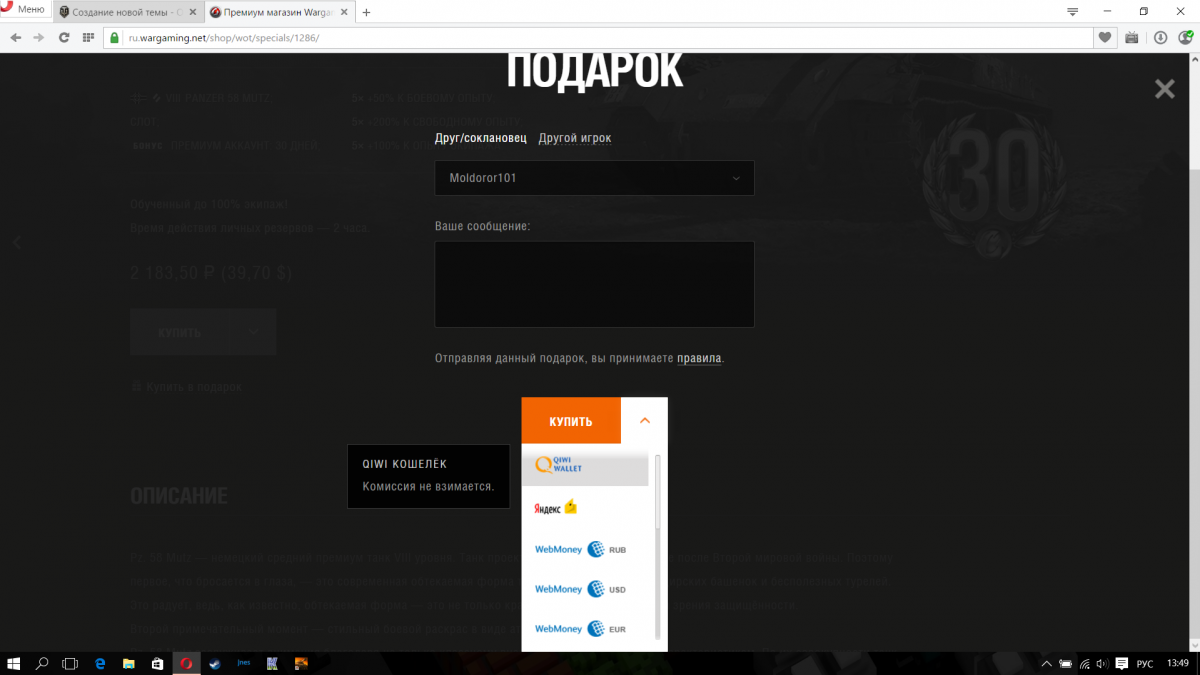Благодаря тому что в премиум магазине отсутствует метод оплаты банковской картой, я не могу воспользоваться данным спецпредложением и купить в подарок своему брату танк Pz. 58 Mutz. Прошу вас продлить акцию до момента восстановления метода оплаты банковской картой. Я уже обращался в центр поддержки, где мне ответили что данная проблема присутствует, но о сроках ее решения ничего не сказали. p.s. Другие методы оплаты меня не устраивают, так как требуют дополнительных вложений (% комиссия и т.д.), так же мне не нужны все эти возможные кошельки. http://cdn-frm-eu.wargaming.net/wot/ru/uploads/monthly_02_2016/post-33530384-0-14376600-1456311020_thumb.png