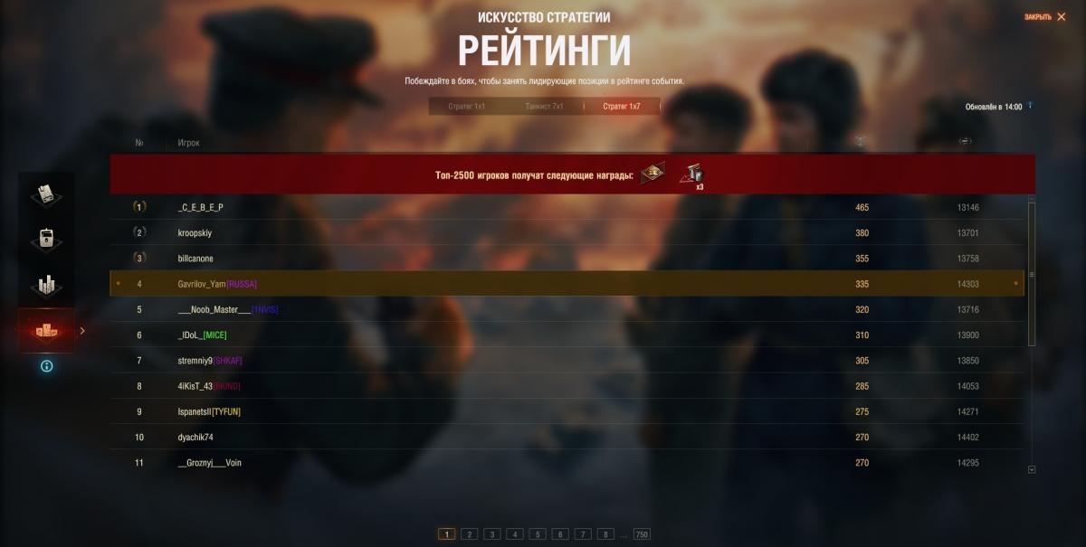 Почему именно RUSSA : Вы гарантированно получите прем танк Вы гарантированно получаете место в боях на ГК т.к. у нас не хватает людей (в основном сидят рандомщики) Вы получаете возможность сделать ставку на аукционе Вы играете в коллективе добрых и адекватных игроков без истерик и ругани У нас 95 бойцов что позволит нам ставить максимальное количество боёв на ГК У нас опытный командир, ну а как же, это же я Программа для общения во время боя discord Требования к вам: Наличие техники 10 уровня для игры на ГК Возраст 18+ WG рейтинг от 6000 А теперь о минусах: Ввиду того что количество призовых мест на ивенте сократилось с 26 тыс. до 10 тыс. то вы, скорее всего, не сможете выиграть танк 10 уровня, я честно об этом говорю.