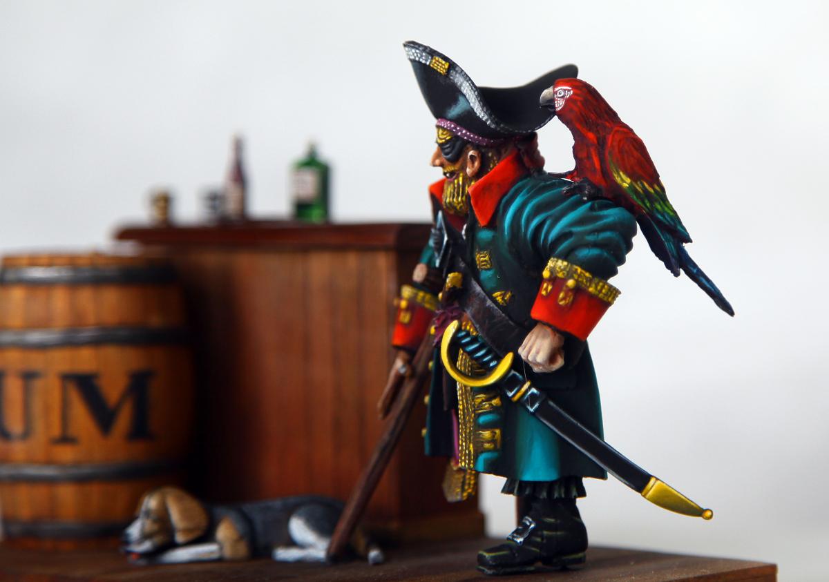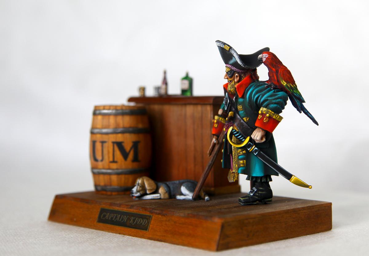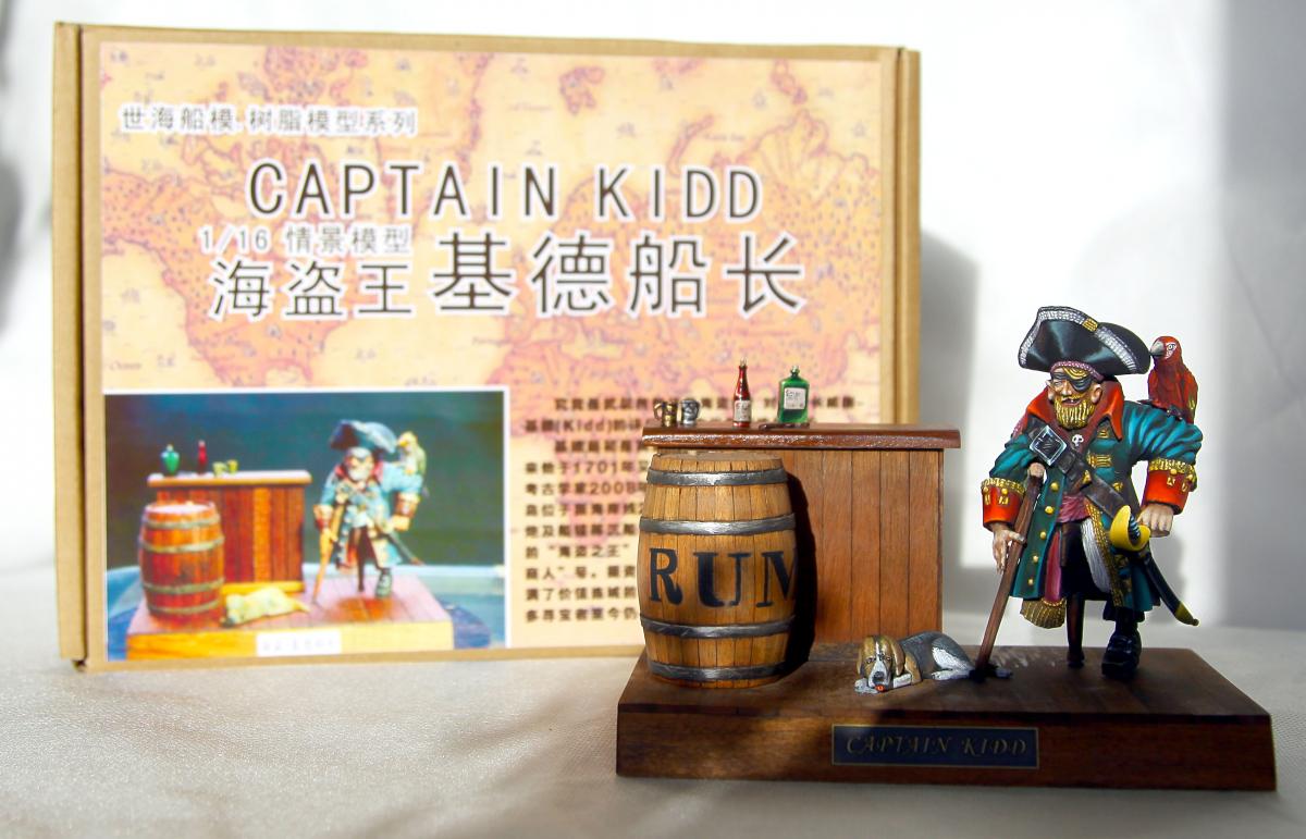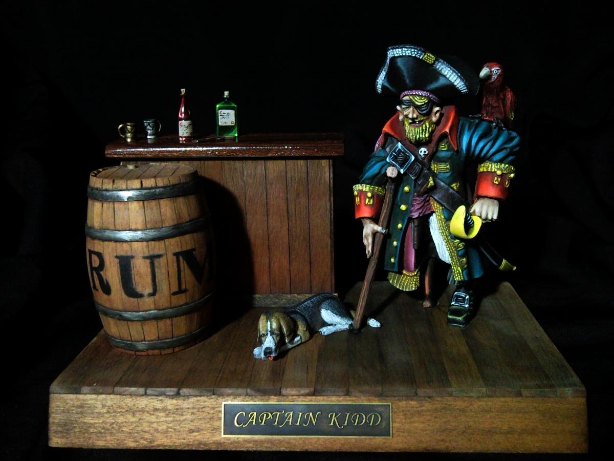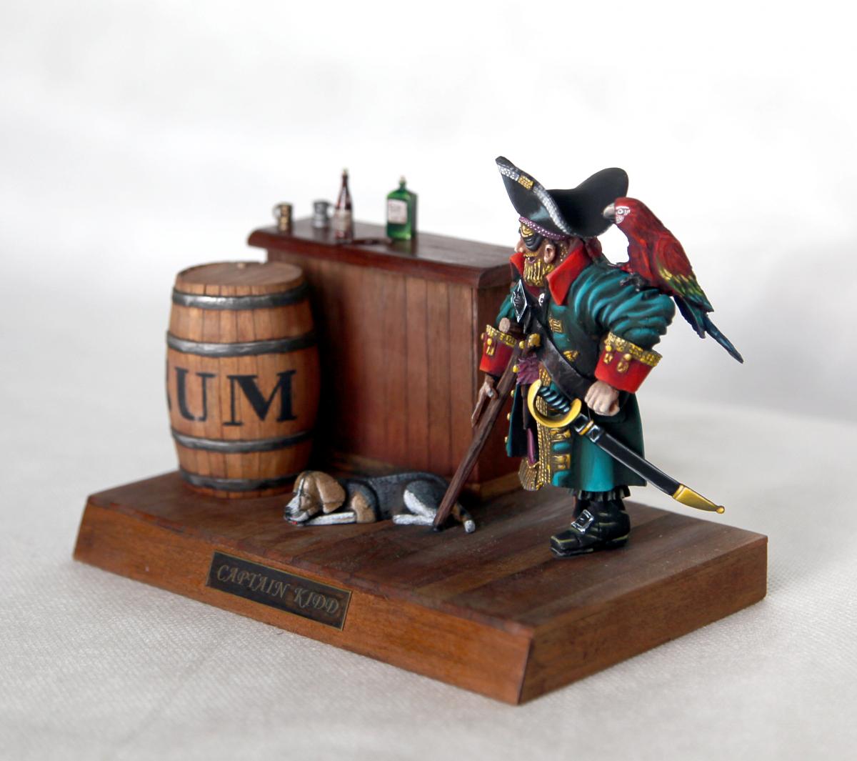 Добрый день! Представляем вашему вниманию интересную виньетку с пиратом Captain Kidd - образ скорее собирательный, по этому можно обозвать фигурку разными именами героев фольклора или морских разбойников. Фигурка выполнена в гротескном в стиле, персонаж видимо списан с известного пирата Джона Сильвера - одноногий с попугаем на плече, а рядом барная стойка и бочка с ромом. Набор выпускался в далеком 1979 году японской фирмой IMAI (в металле, весом грамм 600-700, 1/16, 122mm), в данное время раритет - снят с производства. Готовую фигурку этой фирмы прилагаю. Благодаря нашим китайским друзьям возрожден и выпущен в серию. Параметры миниатюры: масштаб 1/16, основание виньетки 100х160мм, высота фигурки 100мм, высота бочки 60мм. Фигурка пирата, попугая, собаки и элементы прочего антуража отлиты из полиэфирной смолы. Основание наборное - собирается из заготовок фанеры, материал для настила и торцов - вишня, бочка - каркас фанера, доски - бук, обручи - свинец. Дерево слегка затонировано для наглядности. Фото на темном фоне - мои, на белом фирмы заказчика росписи. Краски - акрил разных производителей, NMM и прочие фичи.