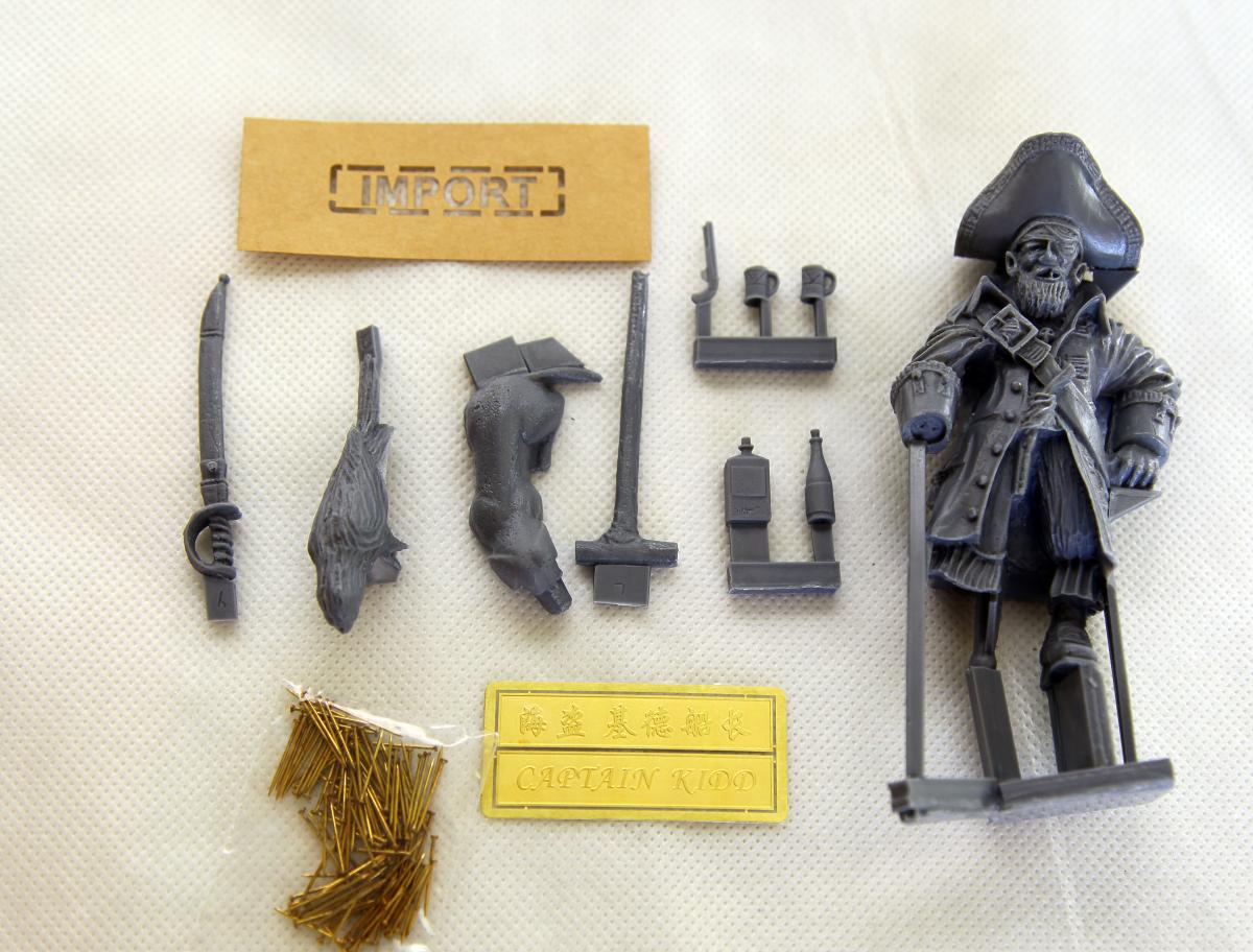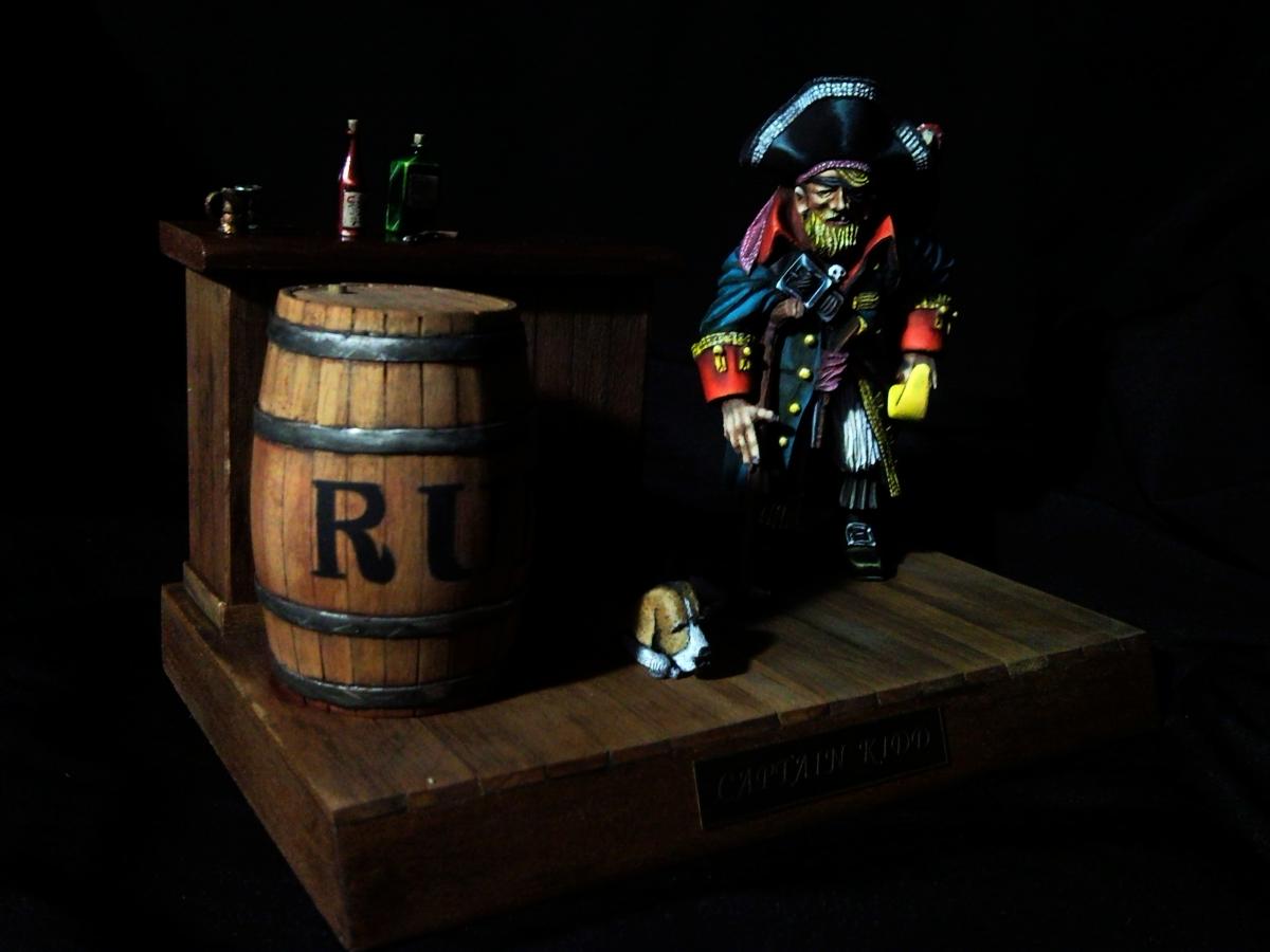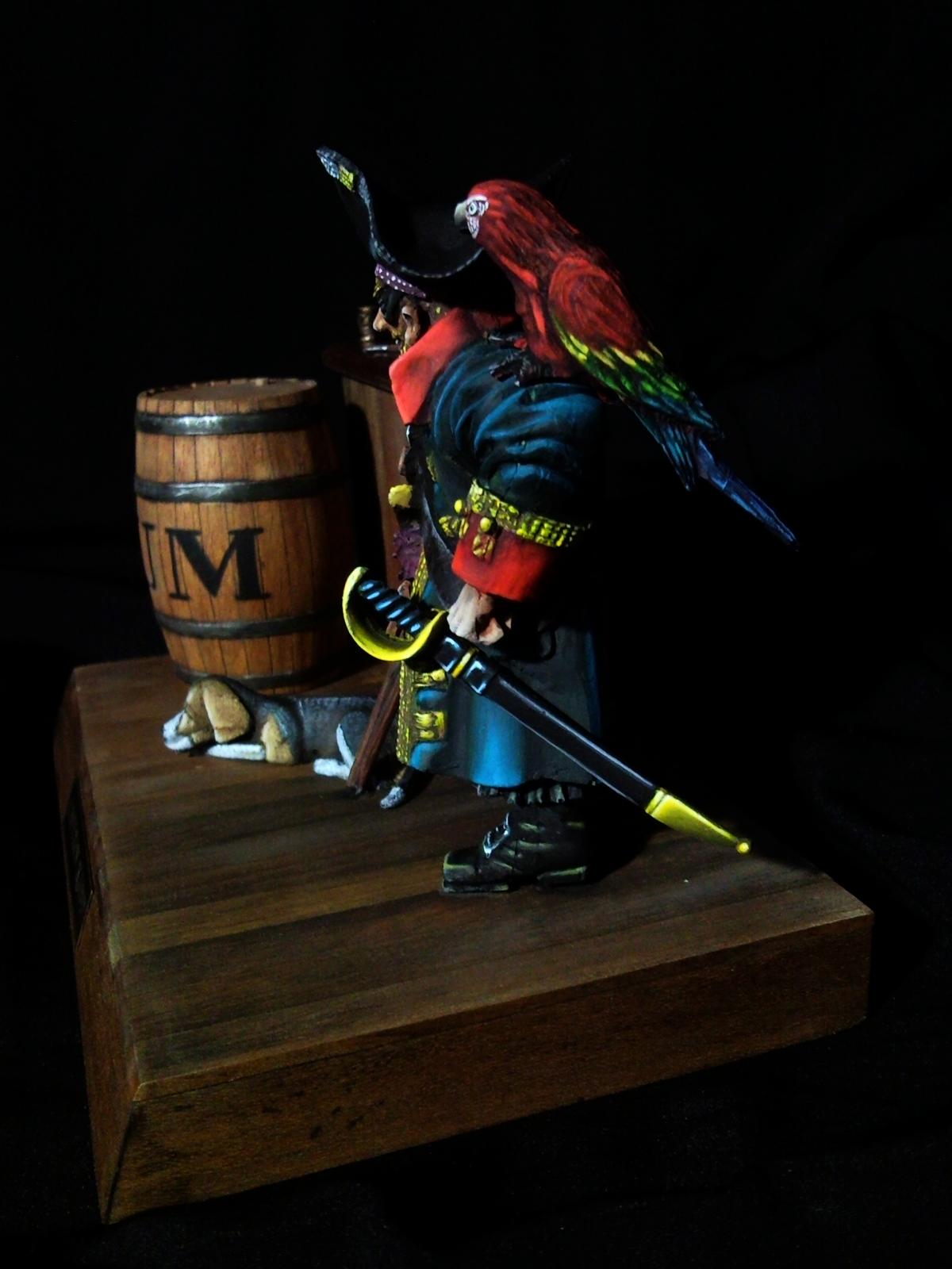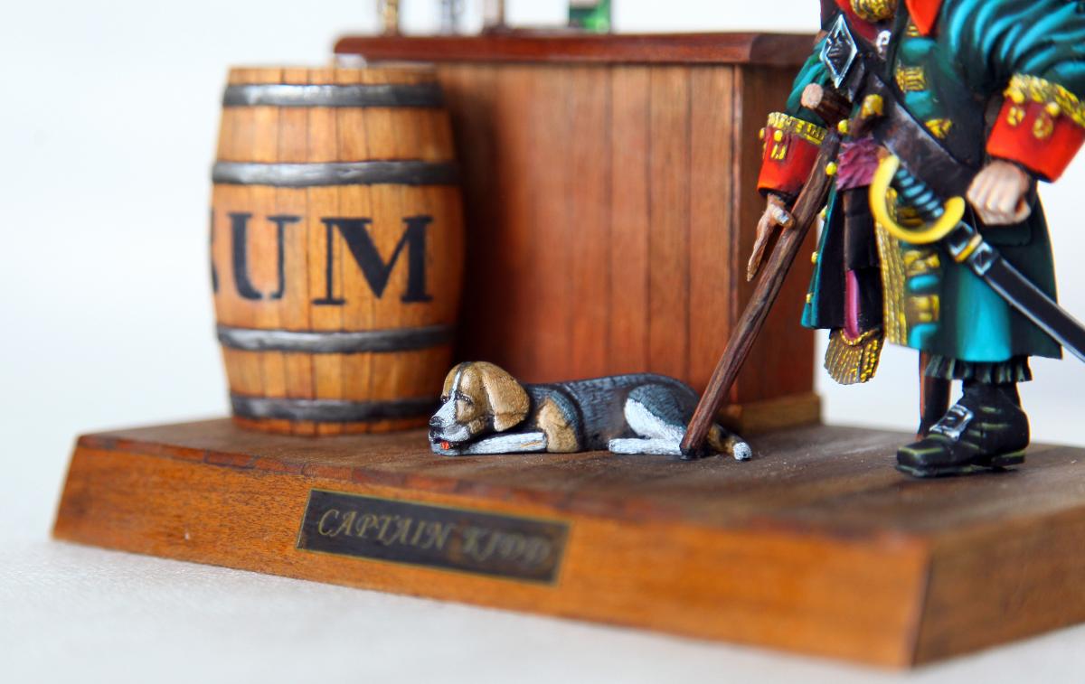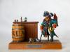 Добрый день! Представляем вашему вниманию интересную виньетку с пиратом Captain Kidd - образ скорее собирательный, по этому можно обозвать фигурку разными именами героев фольклора или морских разбойников. Фигурка выполнена в гротескном в стиле, персонаж видимо списан с известного пирата Джона Сильвера - одноногий с попугаем на плече, а рядом барная стойка и бочка с ромом. Набор выпускался в далеком 1979 году японской фирмой IMAI (в металле, весом грамм 600-700, 1/16, 122mm), в данное время раритет - снят с производства. Готовую фигурку этой фирмы прилагаю. Благодаря нашим китайским друзьям возрожден и выпущен в серию. Параметры миниатюры: масштаб 1/16, основание виньетки 100х160мм, высота фигурки 100мм, высота бочки 60мм. Фигурка пирата, попугая, собаки и элементы прочего антуража отлиты из полиэфирной смолы. Основание наборное - собирается из заготовок фанеры, материал для настила и торцов - вишня, бочка - каркас фанера, доски - бук, обручи - свинец. Дерево слегка затонировано для наглядности. Фото на темном фоне - мои, на белом фирмы заказчика росписи. Краски - акрил разных производителей, NMM и прочие фичи.