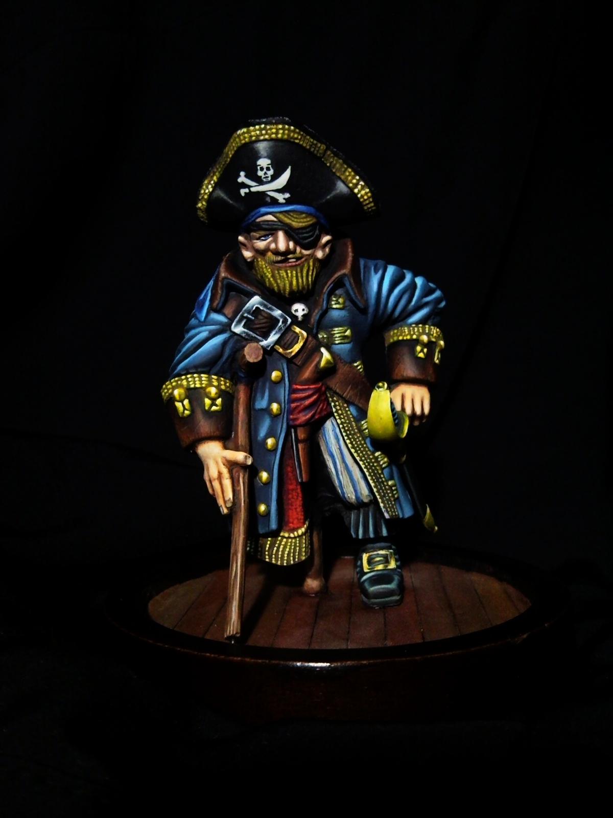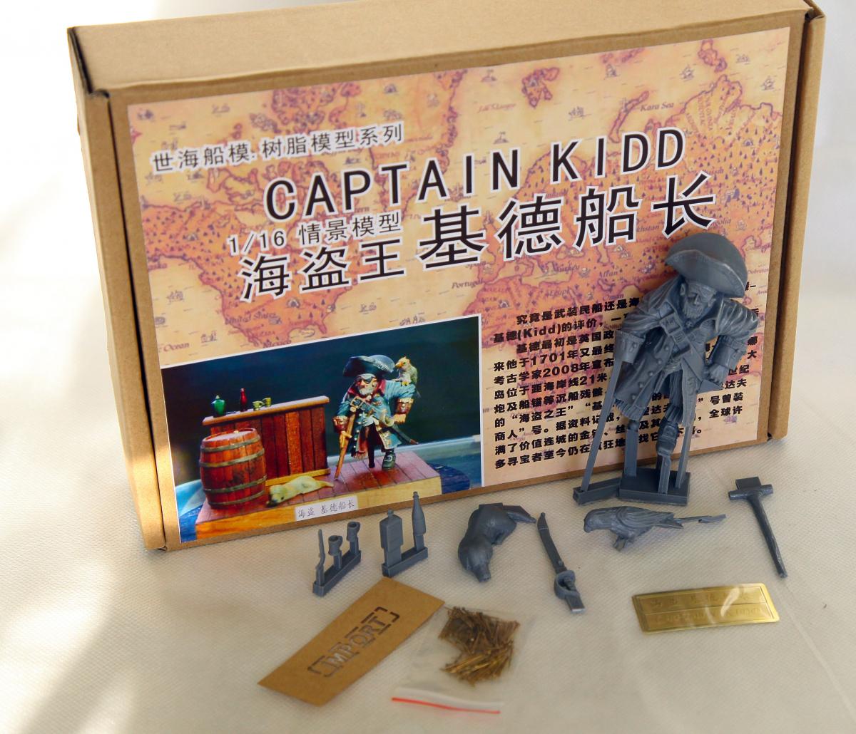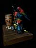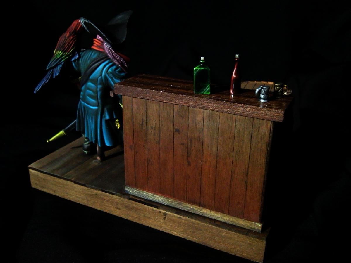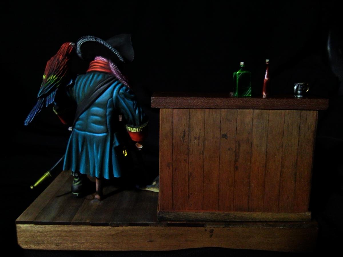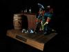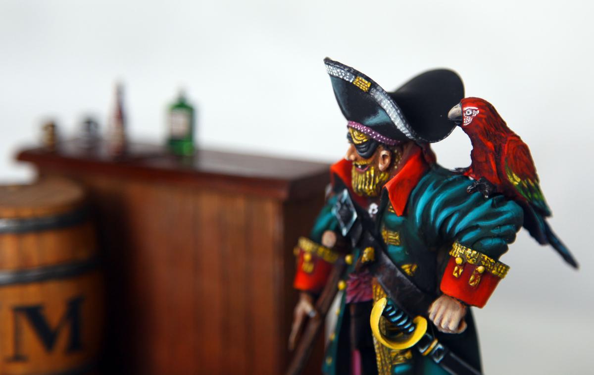 Добрый день! Представляем вашему вниманию интересную виньетку с пиратом Captain Kidd - образ скорее собирательный, по этому можно обозвать фигурку разными именами героев фольклора или морских разбойников. Фигурка выполнена в гротескном в стиле, персонаж видимо списан с известного пирата Джона Сильвера - одноногий с попугаем на плече, а рядом барная стойка и бочка с ромом. Набор выпускался в далеком 1979 году японской фирмой IMAI (в металле, весом грамм 600-700, 1/16, 122mm), в данное время раритет - снят с производства. Готовую фигурку этой фирмы прилагаю. Благодаря нашим китайским друзьям возрожден и выпущен в серию. Параметры миниатюры: масштаб 1/16, основание виньетки 100х160мм, высота фигурки 100мм, высота бочки 60мм. Фигурка пирата, попугая, собаки и элементы прочего антуража отлиты из полиэфирной смолы. Основание наборное - собирается из заготовок фанеры, материал для настила и торцов - вишня, бочка - каркас фанера, доски - бук, обручи - свинец. Дерево слегка затонировано для наглядности. Фото на темном фоне - мои, на белом фирмы заказчика росписи. Краски - акрил разных производителей, NMM и прочие фичи.
