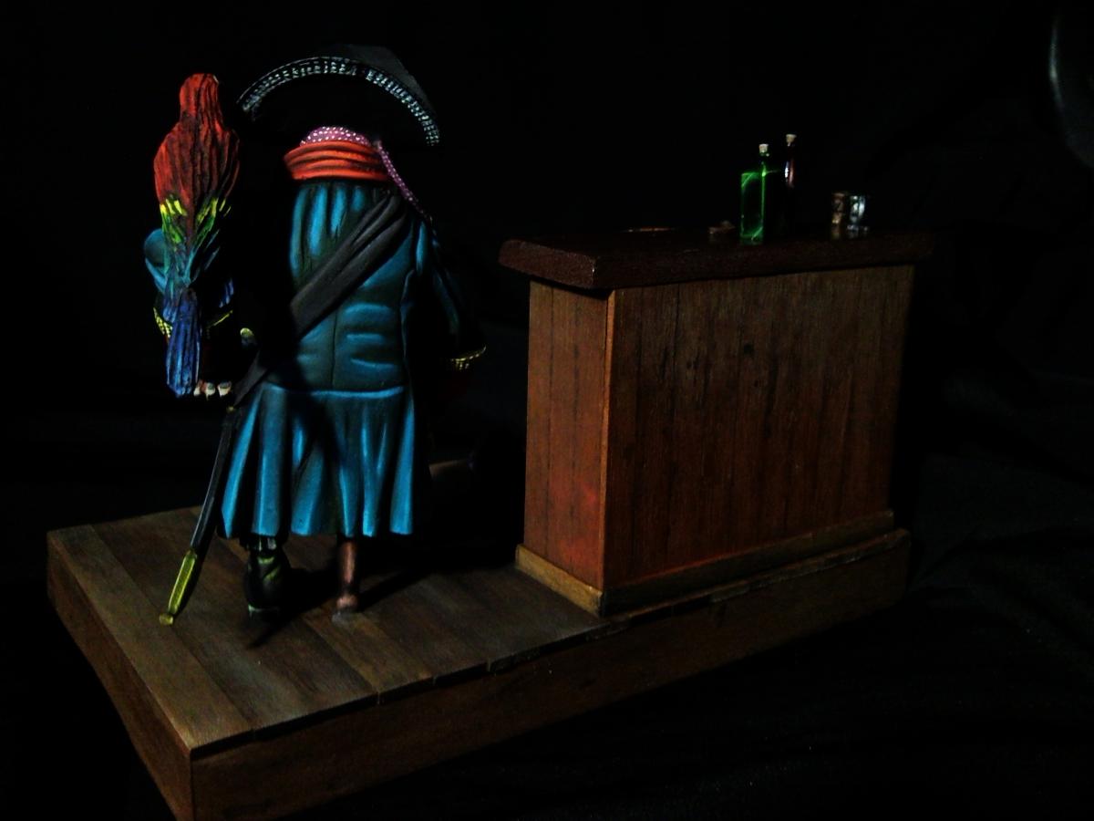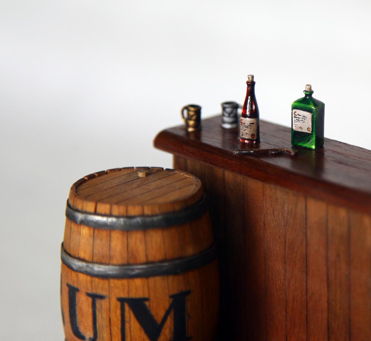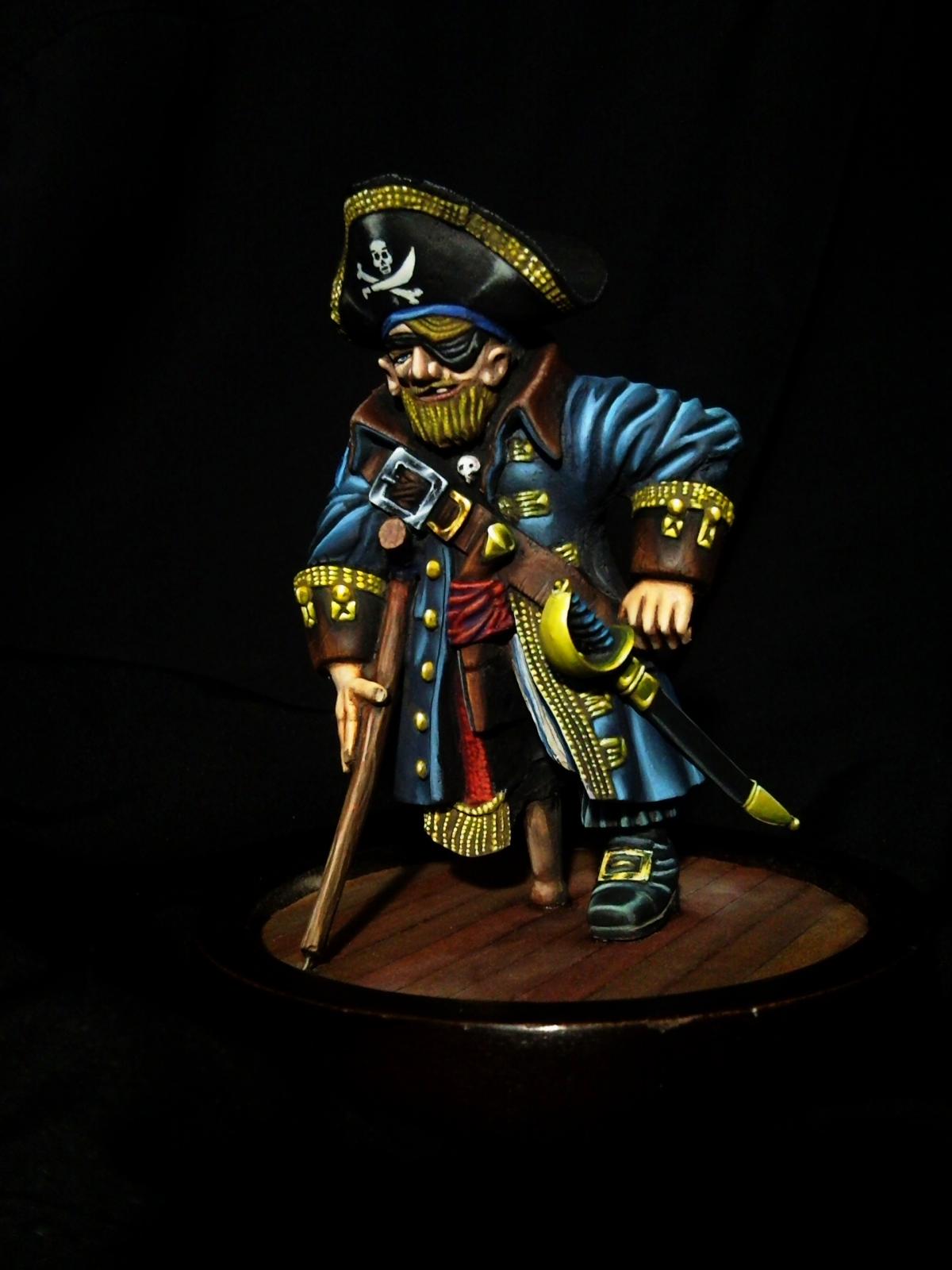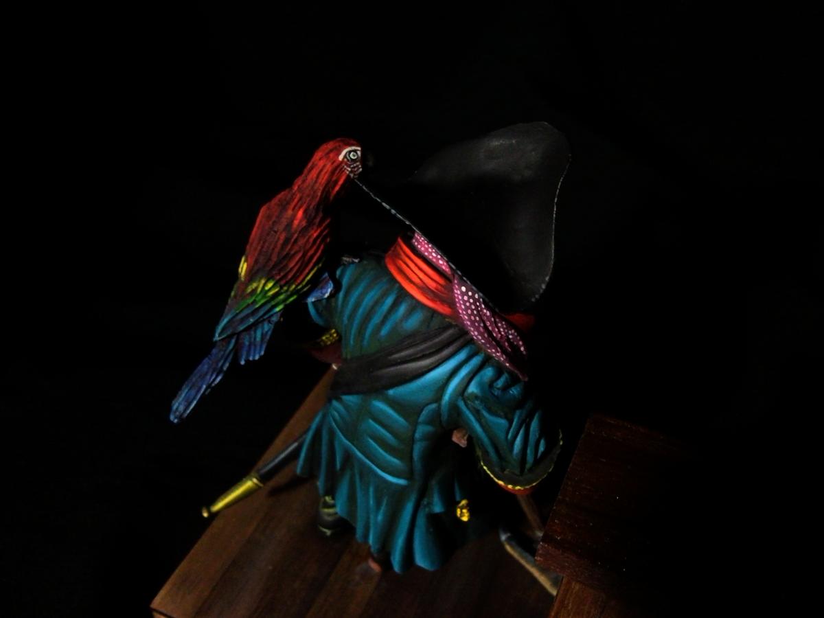 Добрый день! Представляем вашему вниманию интересную виньетку с пиратом Captain Kidd - образ скорее собирательный, по этому можно обозвать фигурку разными именами героев фольклора или морских разбойников. Фигурка выполнена в гротескном в стиле, персонаж видимо списан с известного пирата Джона Сильвера - одноногий с попугаем на плече, а рядом барная стойка и бочка с ромом. Набор выпускался в далеком 1979 году японской фирмой IMAI (в металле, весом грамм 600-700, 1/16, 122mm), в данное время раритет - снят с производства. Готовую фигурку этой фирмы прилагаю. Благодаря нашим китайским друзьям возрожден и выпущен в серию. Параметры миниатюры: масштаб 1/16, основание виньетки 100х160мм, высота фигурки 100мм, высота бочки 60мм. Фигурка пирата, попугая, собаки и элементы прочего антуража отлиты из полиэфирной смолы. Основание наборное - собирается из заготовок фанеры, материал для настила и торцов - вишня, бочка - каркас фанера, доски - бук, обручи - свинец. Дерево слегка затонировано для наглядности. Фото на темном фоне - мои, на белом фирмы заказчика росписи. Краски - акрил разных производителей, NMM и прочие фичи.