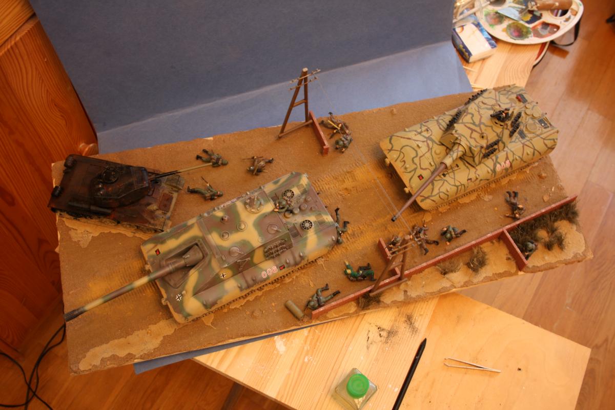 Всем привет!На днях на глаза попалась моя старая недоделанная диорама с двумя вундервафлями художника Алоизыча http://cdn-frm-eu.wargaming.net/4.4/style_emoticons/wot/Smile_harp.gif. Модели годные, разве что сборка была изкоробочная, но покрашены они были на 3(+). Основание не доделано, много чего ещё предстоит сделать. Надеюсь, конечный результат порадует не только меня, но и вас) http://cdn-frm-eu.wargaming.net/wot/ru/uploads/monthly_10_2015/post-5715890-0-93114600-1443777560_thumb.jpg Итак, план работ: 1. Докрасить сотки - смывка, пыль, грязь в траках, сажа. 2. Хоть как-то докрасить фигурки десанта - постараюсь придать хоть какие-то черты лица, но в этом, к сожалению, не силён ни разу http://cdn-frm-eu.wargaming.net/4.4/style_emoticons/wot/Smile_sad.gif. 3. Разобраться с подбитым танком - вроде бы местами покраска хорошая, но не везде. Так же надо сделать обломки и пепел вокруг танка на земле. http://cdn-frm-eu.wargaming.net/wot/ru/uploads/monthly_10_2015/post-5715890-0-93182900-1443777562_thumb.jpg 4. Основание. Здесь множество подпунктов: 4.1 Натянуть все провода между столбами (вроде бы просто, но... В прочем, об этом позже по ходу работы http://cdn-frm-eu.wargaming.net/4.4/style_emoticons/wot/asap.gif) 4.2 Покрасить кирпичный заборчик - базовый цвет к кирпичному близкий, но из-за работы наждачной бумагой остались высветленные места. 4.3 Разобраться с дорогой - грязь, высветлить относительно другого грунта. 4.4 Насажать травы и кустов. В итоге, имеем неприступный фронт работ. Уже успел покрасить сотки, сделал смывку и нанёс пыль. Так же постарался изобразить лица на фигурках, но всё равно, лучше на макро в упор не фотографировать). http://cdn-frm-eu.wargaming.net/wot/ru/uploads/monthly_10_2015/post-5715890-0-84970600-1443777581_thumb.jpg По ходу покраски тяжа пришлось удалять свою импровизацию - италеревского командира, взятого из набора с фердинандом, которого я прилепил за ПНВ на командирской башенке. Немного мучений, немного расчленёнки и готово. Захлопнул люк от греха подальше http://cdn-frm-eu.wargaming.net/4.4/style_emoticons/wot/arta.gif. http://cdn-frm-eu.wargaming.net/wot/ru/uploads/monthly_10_2015/post-5715890-0-30016100-1443777565_thumb.jpghttp://cdn-frm-eu.wargaming.net/wot/ru/uploads/monthly_10_2015/post-5715890-0-88260800-1443777567_thumb.jpghttp://cdn-frm-eu.wargaming.net/wot/ru/uploads/monthly_10_2015/post-5715890-0-33711900-1443777570_thumb.jpghttp://cdn-frm-eu.wargaming.net/wot/ru/uploads/monthly_10_2015/post-5715890-0-57896300-1443777572_thumb.jpghttp://cdn-frm-eu.wargaming.net/wot/ru/uploads/monthly_10_2015/post-5715890-0-54143800-1443777575_thumb.jpghttp://cdn-frm-eu.wargaming.net/wot/ru/uploads/monthly_10_2015/post-5715890-0-27758700-1443777579_thumb.jpg Такой вопрос - как обработать верх МТО? А то мне не нравится, что он чистый и нету сажи/грязи. Но не уверен, что они там могут быть. Заранее спасибо)