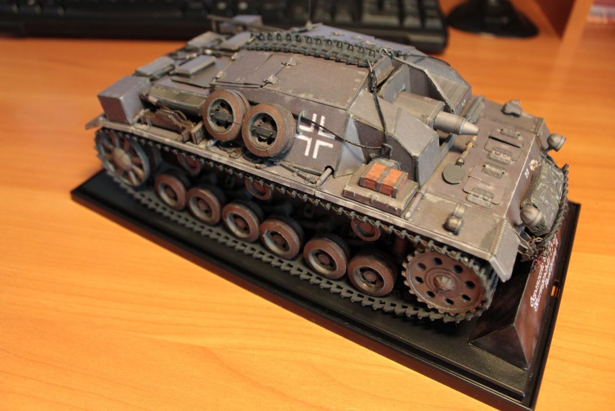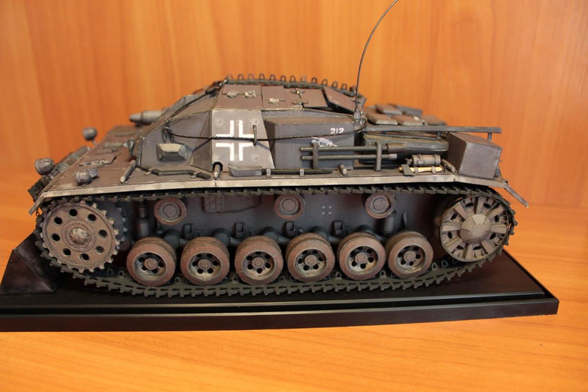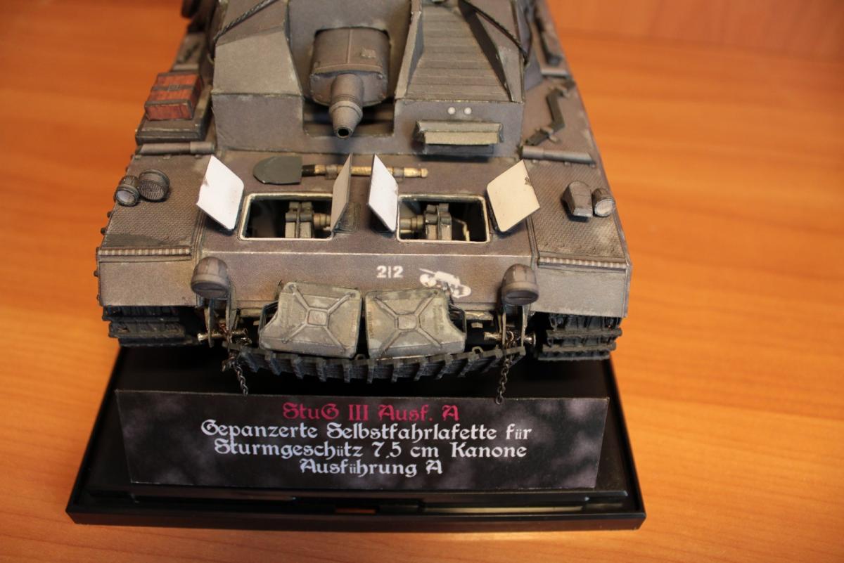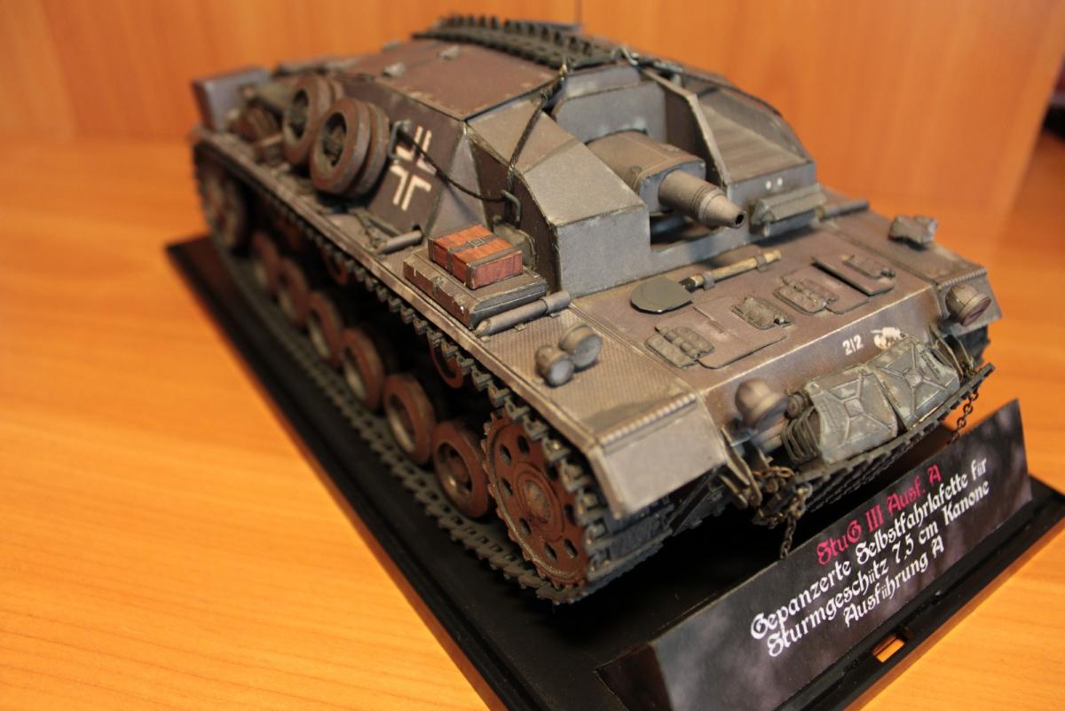 Stug 3 Ausf.A (Gepanzerte Selbstfahrlafette für Sturmgeschütz 7,5 cm Kanone) Первый серийный вариант немецкой самоходно-артиллерийской установки (выпускались январь - март 1940 г.). Лобовое бронирование 50 мм, вооружёние - короткоствольная 75-мм пушка 24 калибра Stuk37/L24. Несмотря на то, что зачастую эти машины относят к модификации Ausf. B, корректнее отнести их к модификации Ausf. A, поскольку они были оснащены 10-скоростной коробкой передач Maybach SRG 328 145. В более поздних моделях коробка была заменена на 6 скоростную коробку передач ZF SSG 77 Aphon, а также замена на более широкие гусеницы (шириной 38 см), широкие звездочки и опорные катки. Использовалось: 1. Журнал GPM № 209. Оригинал. Бумага офисная 80 г/м3, картон 0,5, 0,75, 1. 2. Клеи ПВА (Момент). Цианакрилатный Супер-клей Момент. 3. Краски Tamia (серый немецкий и оружейный метал) - редко, для прокраски торцов - основные цвета фирмы Ладога в тубах. 4. Иглы швейные, зубочистки, цепочка из магазина бижутерии 5. Нож модельный Excel, мат самовостаннавливающийся, очки бинокулярные 9157-3 процесс сборки: http://fotki.yandex....c/album/147853/ http://cdn-frm-eu.wargaming.net/wot/ru/uploads/monthly_06_2013/post-1909414-0-31955100-1371966720_thumb.jpg http://cdn-frm-eu.wargaming.net/wot/ru/uploads/monthly_06_2013/post-1909414-0-92719500-1371966727_thumb.jpg http://cdn-frm-eu.wargaming.net/wot/ru/uploads/monthly_06_2013/post-1909414-0-91234200-1371966734_thumb.jpg http://cdn-frm-eu.wargaming.net/wot/ru/uploads/monthly_06_2013/post-1909414-0-49112500-1371966742_thumb.jpg http://cdn-frm-eu.wargaming.net/wot/ru/uploads/monthly_06_2013/post-1909414-0-87774800-1371966749_thumb.jpg http://cdn-frm-eu.wargaming.net/wot/ru/uploads/monthly_06_2013/post-1909414-0-19191200-1371966756_thumb.jpg http://cdn-frm-eu.wargaming.net/wot/ru/uploads/monthly_06_2013/post-1909414-0-04089100-1371966767_thumb.jpg http://cdn-frm-eu.wargaming.net/wot/ru/uploads/monthly_06_2013/post-1909414-0-90153600-1371966777_thumb.jpg http://cdn-frm-eu.wargaming.net/wot/ru/uploads/monthly_06_2013/post-1909414-0-27182700-1371966806_thumb.jpg http://cdn-frm-eu.wargaming.net/wot/ru/uploads/monthly_06_2013/post-1909414-0-18471400-1371966841_thumb.jpg