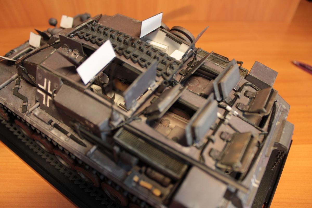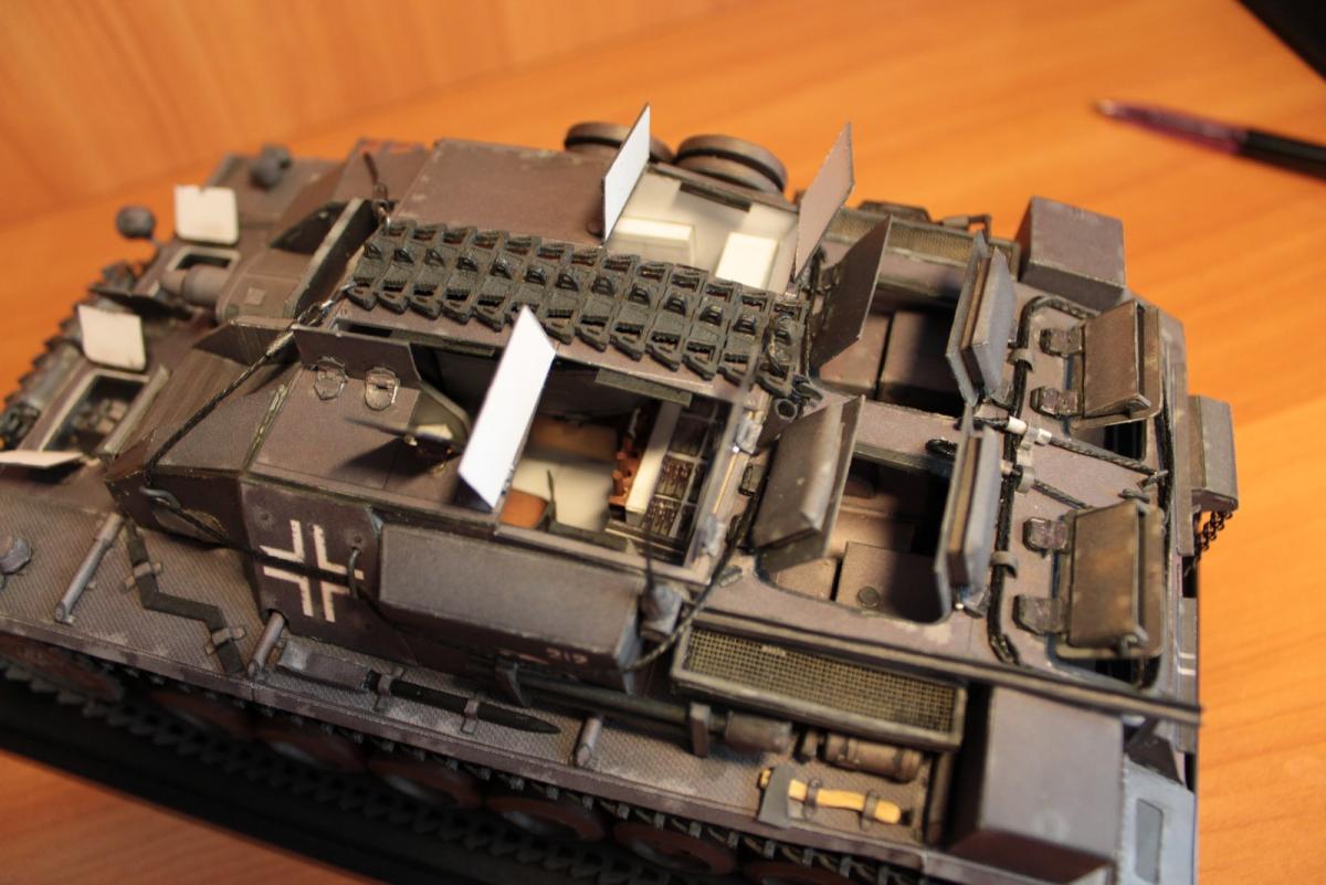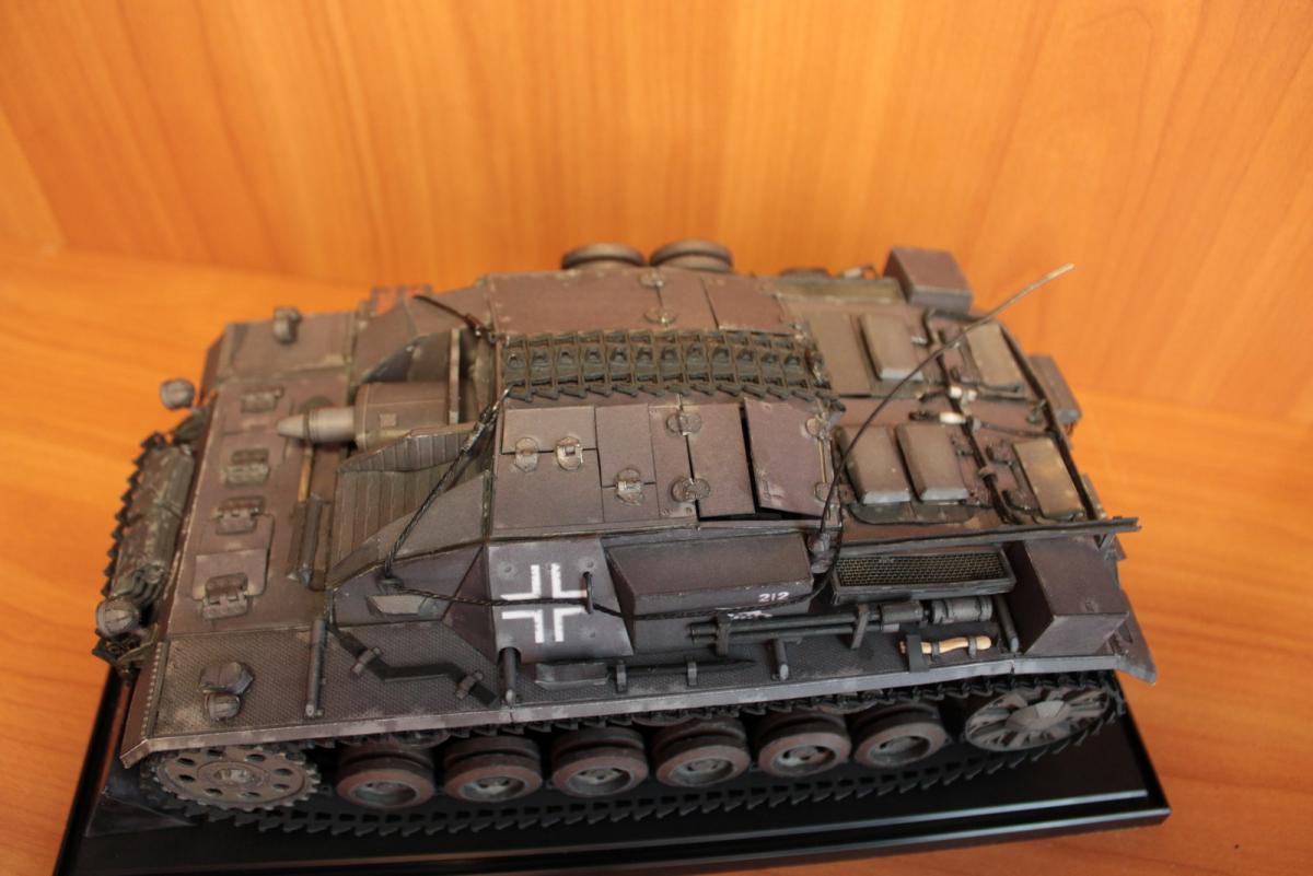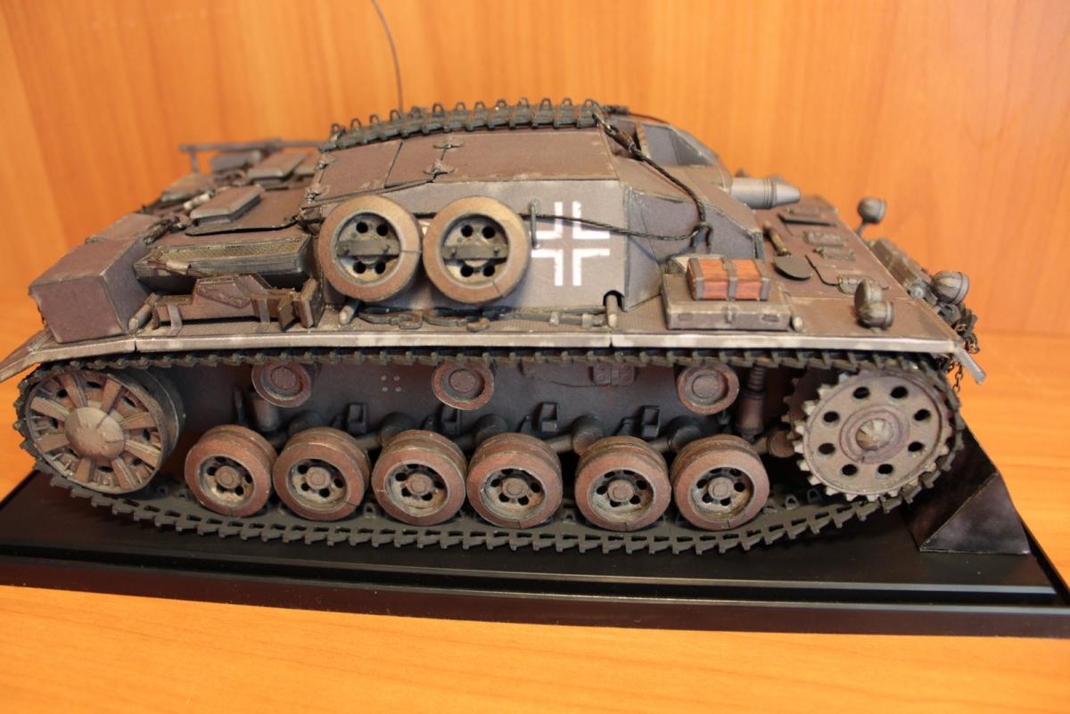 Stug 3 Ausf.A (Gepanzerte Selbstfahrlafette für Sturmgeschütz 7,5 cm Kanone) Первый серийный вариант немецкой самоходно-артиллерийской установки (выпускались январь - март 1940 г.). Лобовое бронирование 50 мм, вооружёние - короткоствольная 75-мм пушка 24 калибра Stuk37/L24. Несмотря на то, что зачастую эти машины относят к модификации Ausf. B, корректнее отнести их к модификации Ausf. A, поскольку они были оснащены 10-скоростной коробкой передач Maybach SRG 328 145. В более поздних моделях коробка была заменена на 6 скоростную коробку передач ZF SSG 77 Aphon, а также замена на более широкие гусеницы (шириной 38 см), широкие звездочки и опорные катки. Использовалось: 1. Журнал GPM № 209. Оригинал. Бумага офисная 80 г/м3, картон 0,5, 0,75, 1. 2. Клеи ПВА (Момент). Цианакрилатный Супер-клей Момент. 3. Краски Tamia (серый немецкий и оружейный метал) - редко, для прокраски торцов - основные цвета фирмы Ладога в тубах. 4. Иглы швейные, зубочистки, цепочка из магазина бижутерии 5. Нож модельный Excel, мат самовостаннавливающийся, очки бинокулярные 9157-3 процесс сборки: http://fotki.yandex....c/album/147853/ http://cdn-frm-eu.wargaming.net/wot/ru/uploads/monthly_06_2013/post-1909414-0-31955100-1371966720_thumb.jpg http://cdn-frm-eu.wargaming.net/wot/ru/uploads/monthly_06_2013/post-1909414-0-92719500-1371966727_thumb.jpg http://cdn-frm-eu.wargaming.net/wot/ru/uploads/monthly_06_2013/post-1909414-0-91234200-1371966734_thumb.jpg http://cdn-frm-eu.wargaming.net/wot/ru/uploads/monthly_06_2013/post-1909414-0-49112500-1371966742_thumb.jpg http://cdn-frm-eu.wargaming.net/wot/ru/uploads/monthly_06_2013/post-1909414-0-87774800-1371966749_thumb.jpg http://cdn-frm-eu.wargaming.net/wot/ru/uploads/monthly_06_2013/post-1909414-0-19191200-1371966756_thumb.jpg http://cdn-frm-eu.wargaming.net/wot/ru/uploads/monthly_06_2013/post-1909414-0-04089100-1371966767_thumb.jpg http://cdn-frm-eu.wargaming.net/wot/ru/uploads/monthly_06_2013/post-1909414-0-90153600-1371966777_thumb.jpg http://cdn-frm-eu.wargaming.net/wot/ru/uploads/monthly_06_2013/post-1909414-0-27182700-1371966806_thumb.jpg http://cdn-frm-eu.wargaming.net/wot/ru/uploads/monthly_06_2013/post-1909414-0-18471400-1371966841_thumb.jpg