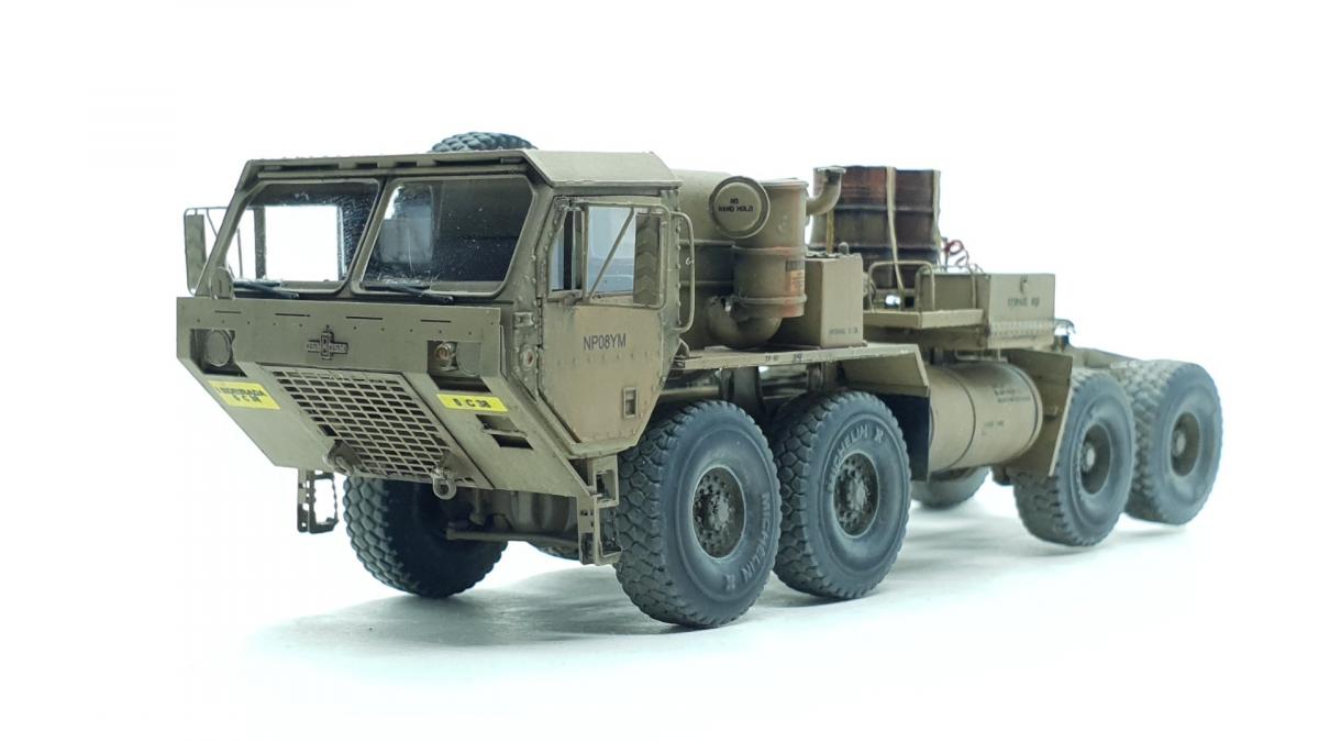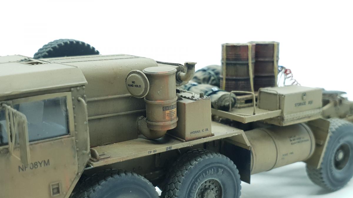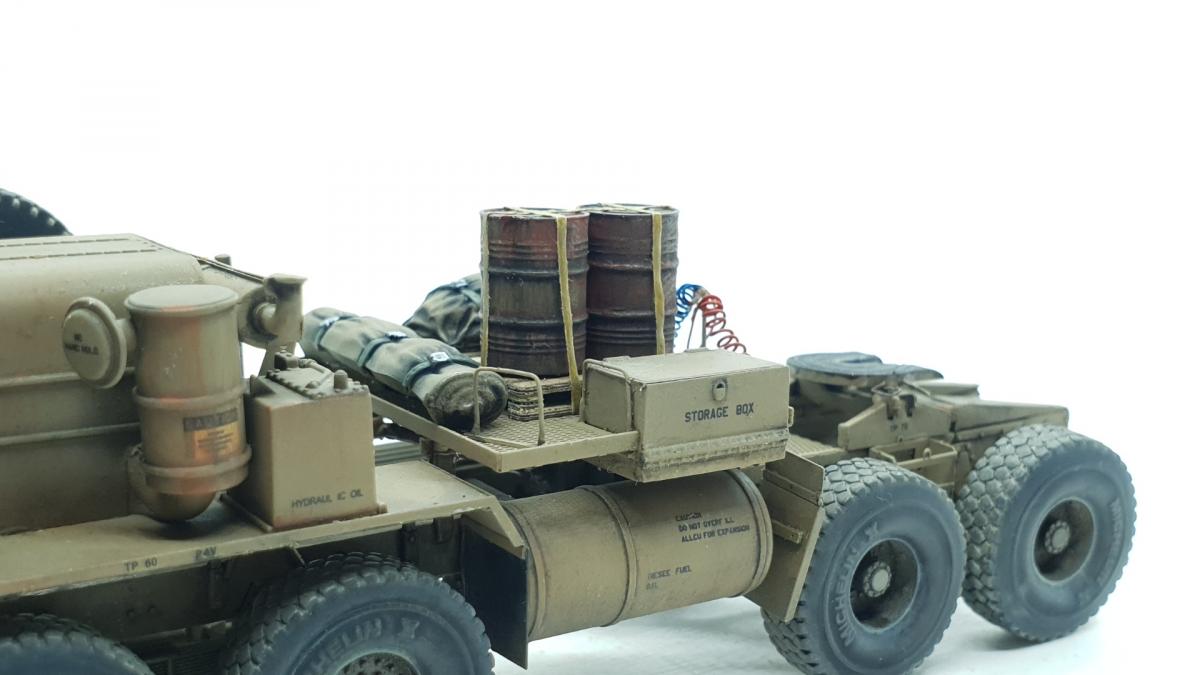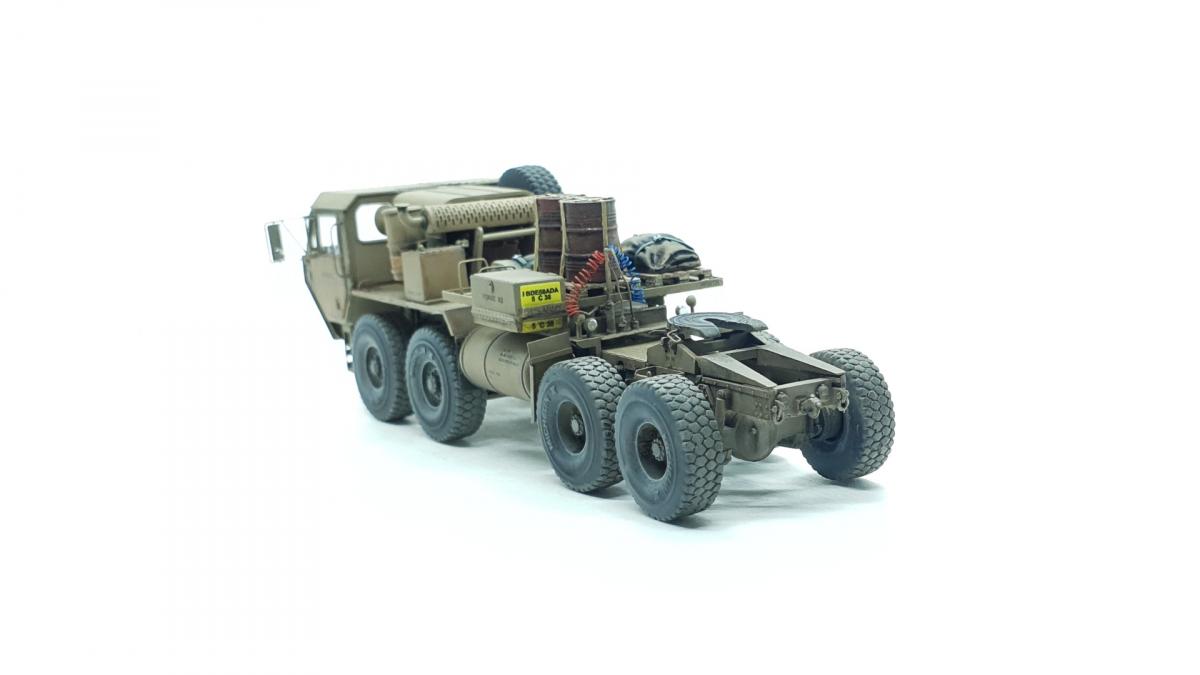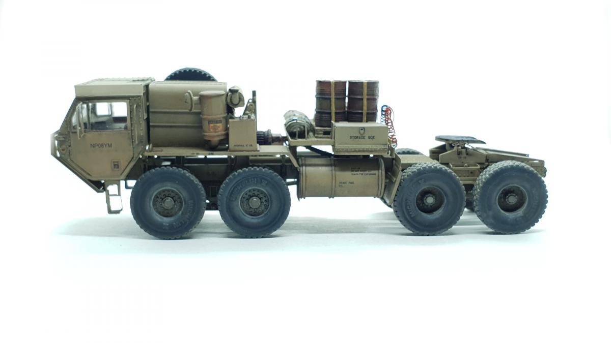 Модель куплена была года 3-4 назад, тогда и начал собирать, только остановился на сборке колёс, каждое из которых состоит из 4 деталей... тогда мне этого хватило. Но тут решил избавиться от этого недостроя. Допы: - фототравление от Tetra - палеты от Brassica Models - скатки от Golikov Project и Таран - фаркоп от Ogurets Project - бочки - новые декали от Doctor Decal Сначала решил погрузиться в мат. часть, найти прототип и какую-нибудь документацию. Спасибо коллеге по масштабу, который мне прислал более 50 технических документов по серии тяжёлых тягачей M97x и M98x. Благо, английский язык не стал препятствием, и я достаточно быстро нашёл информацию именно по M983. Оказалось, что на данную машину устанавливалась лебёдка, но в наборе её не было. Кроме этого, не было и стопоров "седла", поручней, лесенки на баке, некоторых технических устройств и дополнительного крепления запасного колеса. Позднее обнаружил, что производитель потерял ещё и фаркоп. И это только самое заметное. Что ж, начнём. Китайские друзья умудрили накосячить. Кроме облоя и плохой стыкуемости деталей было несколько серьёзных косяков. Правая дверь совершенно не соответствует посадочному месту - где-то выпирает, где-то не хватает части двери. Второй серьёзный косяк - бракованные декали, на номерных знаках у подложки были "левые" полосы по краям (в альбоме есть фото). Под центральной площадкой опоры оказались слишком короткими, пришлось их наращивать. В остальном проблемы не было. В работе над моделью применил фототравление от Tetra, очень понравилось с ним работать. В разы тоньше и изящнее, чем фототравление из набора. Не обошлось и без доработок модели. Сделал из проволоки две съёмные рукояти на платформе. Добавил из проволоки стопоры "седла". Из куска пластика и смоляного болта сделал крепление для запасного колеса. Кроме этого, добавил фаркоп от Ogurets Project.Самым сложным для меня было сделать систему подачи воздуха в прицеп (trailer air supply control, в общих чертах понял назначение, но вопросы остались). Из пластикового уголка сделал основание, из пластиковых трубок разной толщины сделал подставку под шланги, а сами шланги сделал из скрученной проволоки. Долго думал, что взять для украшения модели. В итоге взял пару скаток, две бочки и палеты. Крепления для бочек сделал из бумажного скотча от Tamiya. Краска от АК RealColor, Tamiya. Лаки Pacific88, AK. Везеринг от Ammo Mig.