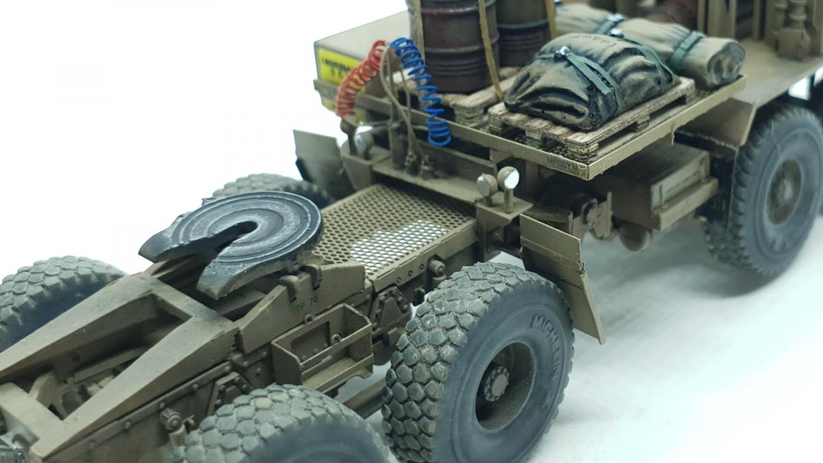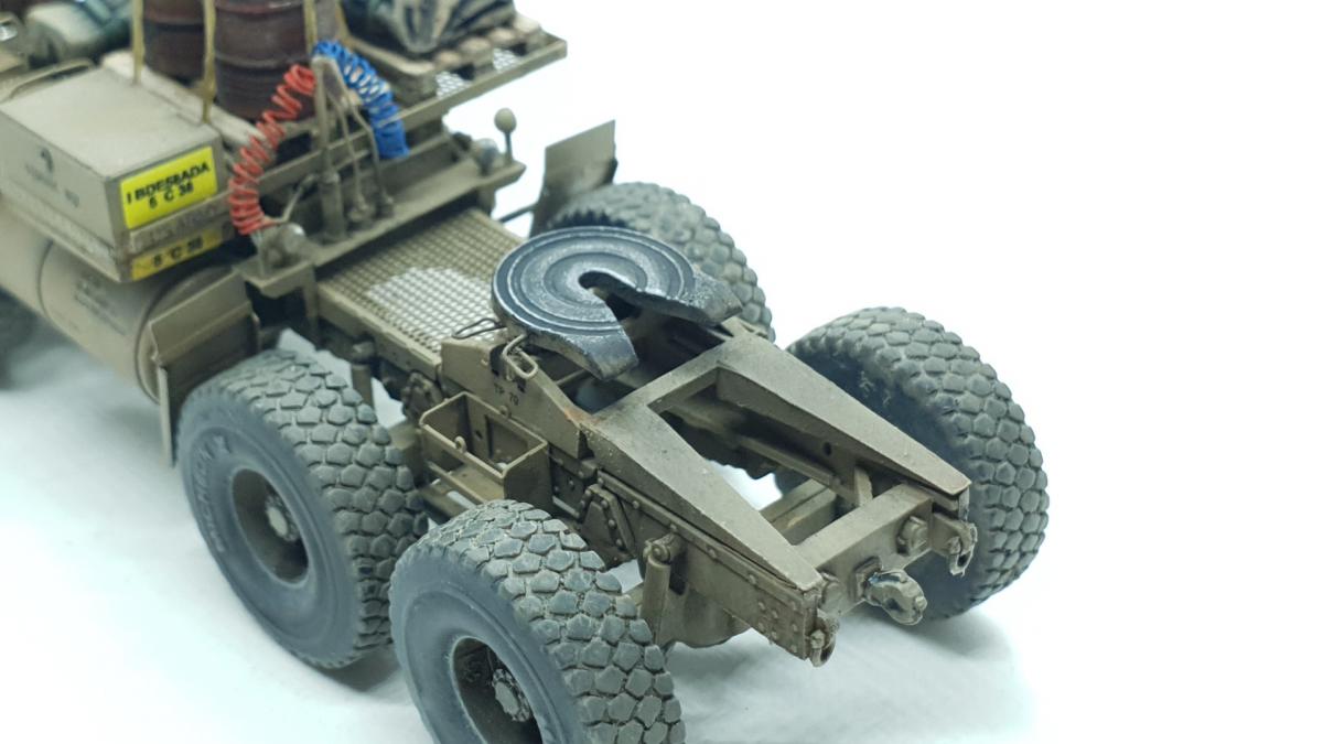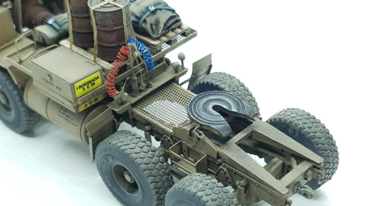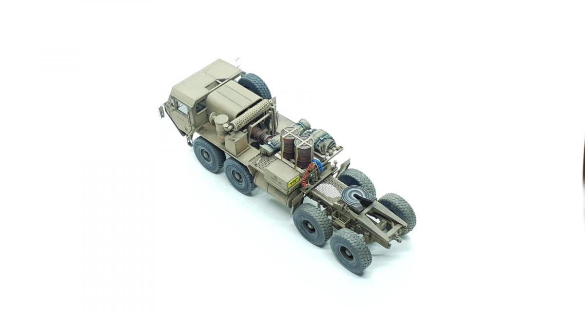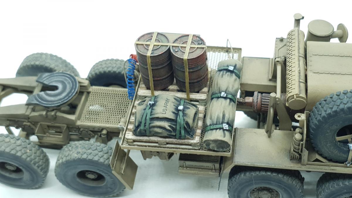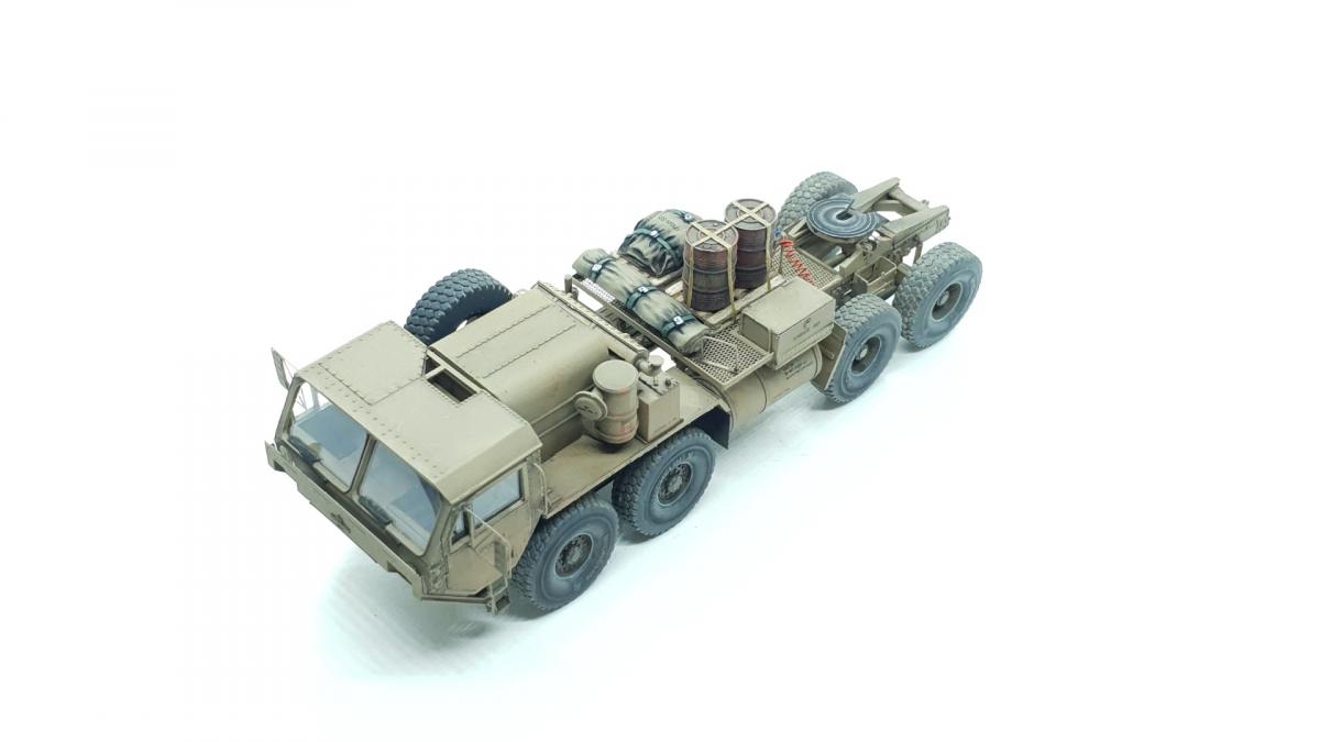 Модель куплена была года 3-4 назад, тогда и начал собирать, только остановился на сборке колёс, каждое из которых состоит из 4 деталей... тогда мне этого хватило. Но тут решил избавиться от этого недостроя. Допы: - фототравление от Tetra - палеты от Brassica Models - скатки от Golikov Project и Таран - фаркоп от Ogurets Project - бочки - новые декали от Doctor Decal Сначала решил погрузиться в мат. часть, найти прототип и какую-нибудь документацию. Спасибо коллеге по масштабу, который мне прислал более 50 технических документов по серии тяжёлых тягачей M97x и M98x. Благо, английский язык не стал препятствием, и я достаточно быстро нашёл информацию именно по M983. Оказалось, что на данную машину устанавливалась лебёдка, но в наборе её не было. Кроме этого, не было и стопоров "седла", поручней, лесенки на баке, некоторых технических устройств и дополнительного крепления запасного колеса. Позднее обнаружил, что производитель потерял ещё и фаркоп. И это только самое заметное. Что ж, начнём. Китайские друзья умудрили накосячить. Кроме облоя и плохой стыкуемости деталей было несколько серьёзных косяков. Правая дверь совершенно не соответствует посадочному месту - где-то выпирает, где-то не хватает части двери. Второй серьёзный косяк - бракованные декали, на номерных знаках у подложки были "левые" полосы по краям (в альбоме есть фото). Под центральной площадкой опоры оказались слишком короткими, пришлось их наращивать. В остальном проблемы не было. В работе над моделью применил фототравление от Tetra, очень понравилось с ним работать. В разы тоньше и изящнее, чем фототравление из набора. Не обошлось и без доработок модели. Сделал из проволоки две съёмные рукояти на платформе. Добавил из проволоки стопоры "седла". Из куска пластика и смоляного болта сделал крепление для запасного колеса. Кроме этого, добавил фаркоп от Ogurets Project.Самым сложным для меня было сделать систему подачи воздуха в прицеп (trailer air supply control, в общих чертах понял назначение, но вопросы остались). Из пластикового уголка сделал основание, из пластиковых трубок разной толщины сделал подставку под шланги, а сами шланги сделал из скрученной проволоки. Долго думал, что взять для украшения модели. В итоге взял пару скаток, две бочки и палеты. Крепления для бочек сделал из бумажного скотча от Tamiya. Краска от АК RealColor, Tamiya. Лаки Pacific88, AK. Везеринг от Ammo Mig.