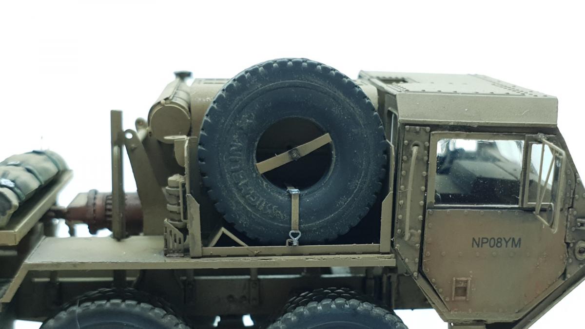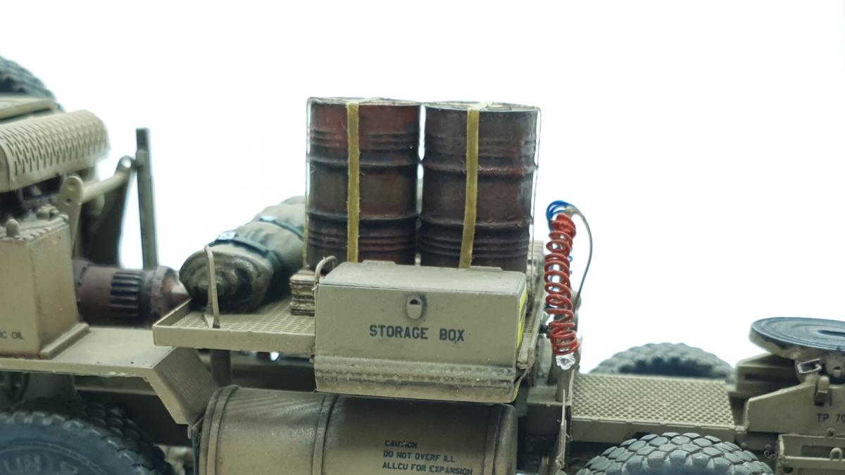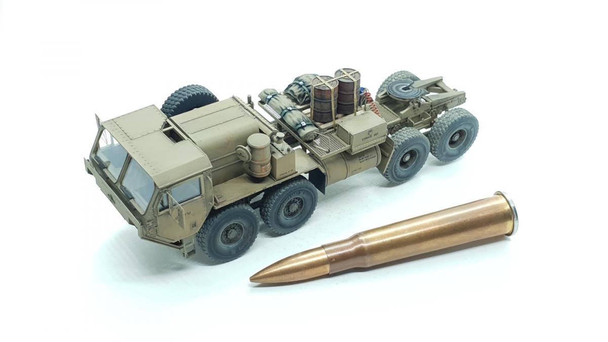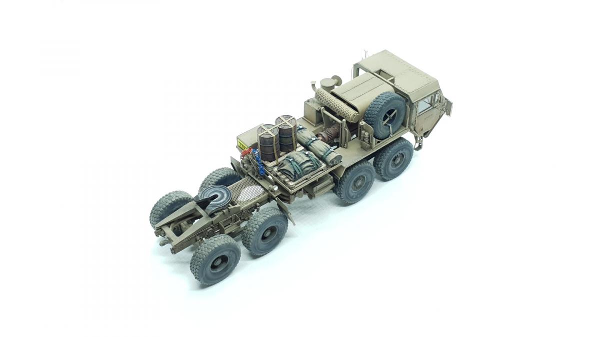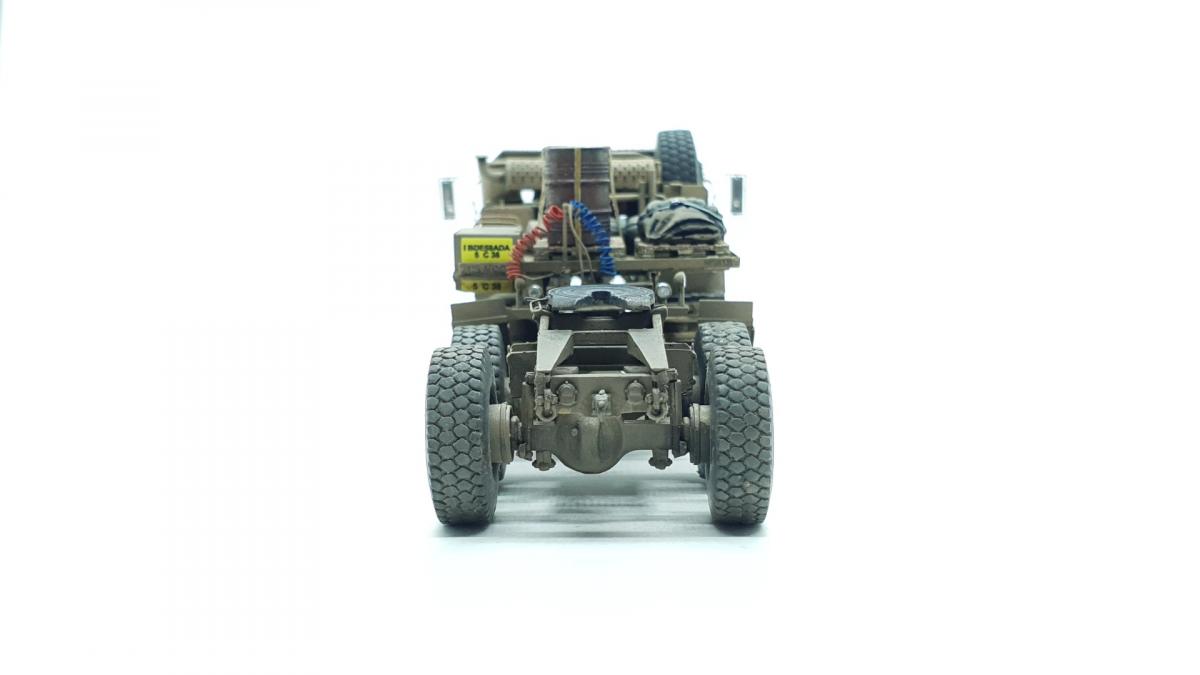 Модель куплена была года 3-4 назад, тогда и начал собирать, только остановился на сборке колёс, каждое из которых состоит из 4 деталей... тогда мне этого хватило. Но тут решил избавиться от этого недостроя. Допы: - фототравление от Tetra - палеты от Brassica Models - скатки от Golikov Project и Таран - фаркоп от Ogurets Project - бочки - новые декали от Doctor Decal Сначала решил погрузиться в мат. часть, найти прототип и какую-нибудь документацию. Спасибо коллеге по масштабу, который мне прислал более 50 технических документов по серии тяжёлых тягачей M97x и M98x. Благо, английский язык не стал препятствием, и я достаточно быстро нашёл информацию именно по M983. Оказалось, что на данную машину устанавливалась лебёдка, но в наборе её не было. Кроме этого, не было и стопоров "седла", поручней, лесенки на баке, некоторых технических устройств и дополнительного крепления запасного колеса. Позднее обнаружил, что производитель потерял ещё и фаркоп. И это только самое заметное. Что ж, начнём. Китайские друзья умудрили накосячить. Кроме облоя и плохой стыкуемости деталей было несколько серьёзных косяков. Правая дверь совершенно не соответствует посадочному месту - где-то выпирает, где-то не хватает части двери. Второй серьёзный косяк - бракованные декали, на номерных знаках у подложки были "левые" полосы по краям (в альбоме есть фото). Под центральной площадкой опоры оказались слишком короткими, пришлось их наращивать. В остальном проблемы не было. В работе над моделью применил фототравление от Tetra, очень понравилось с ним работать. В разы тоньше и изящнее, чем фототравление из набора. Не обошлось и без доработок модели. Сделал из проволоки две съёмные рукояти на платформе. Добавил из проволоки стопоры "седла". Из куска пластика и смоляного болта сделал крепление для запасного колеса. Кроме этого, добавил фаркоп от Ogurets Project.Самым сложным для меня было сделать систему подачи воздуха в прицеп (trailer air supply control, в общих чертах понял назначение, но вопросы остались). Из пластикового уголка сделал основание, из пластиковых трубок разной толщины сделал подставку под шланги, а сами шланги сделал из скрученной проволоки. Долго думал, что взять для украшения модели. В итоге взял пару скаток, две бочки и палеты. Крепления для бочек сделал из бумажного скотча от Tamiya. Краска от АК RealColor, Tamiya. Лаки Pacific88, AK. Везеринг от Ammo Mig.