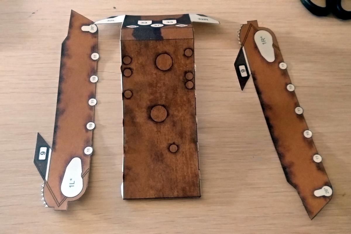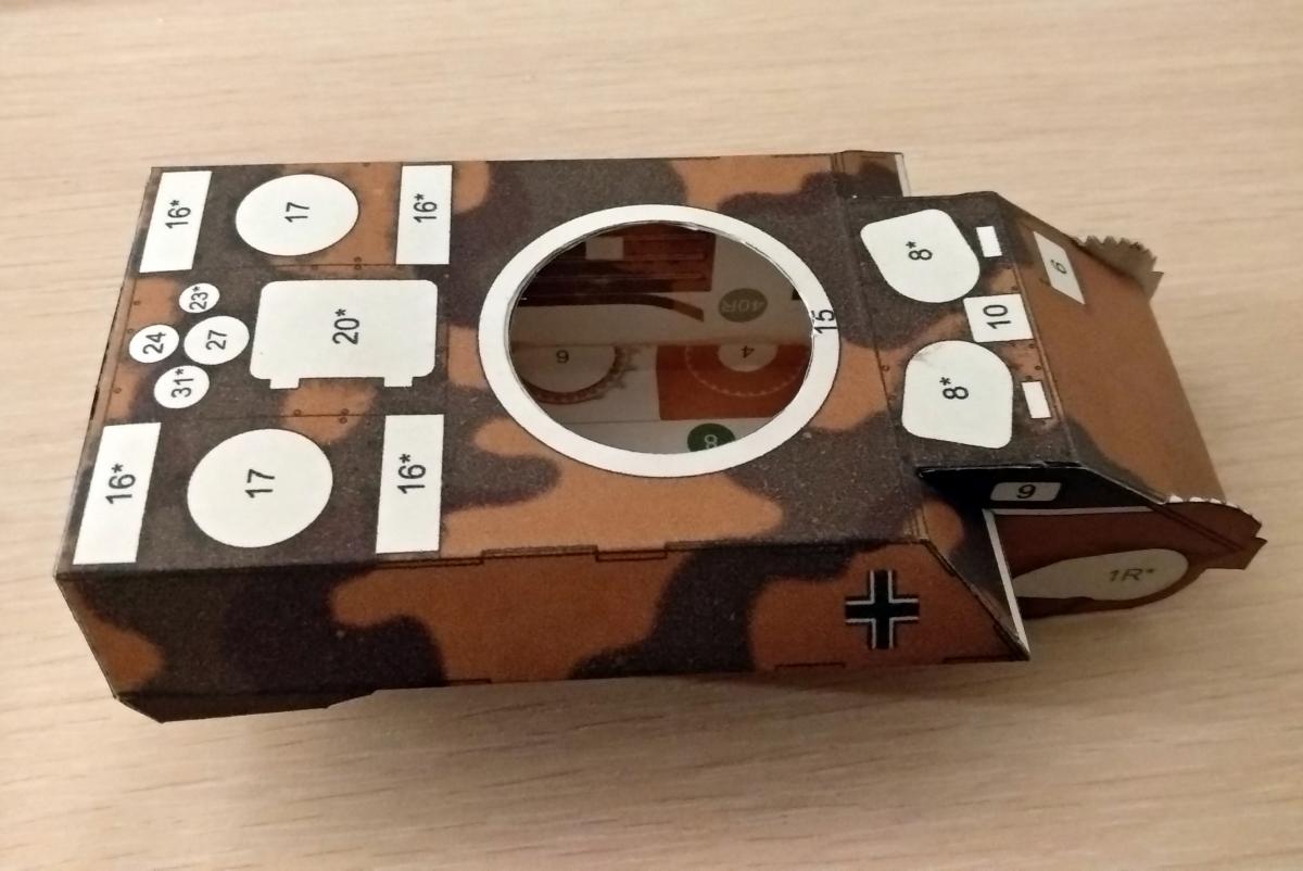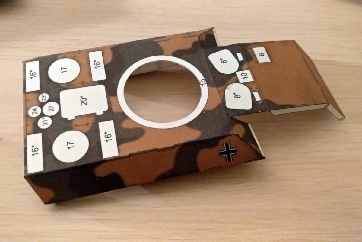 Решил попробовать себя в режиме блога и собрать модель VK1602 leopard от WOPTс пошаговым фотографированием. Итак вырезаем каркас корпуса, вырезаем отверстие под погон башни, проводим тупой стороной ножа все изгибы:http://cdn-frm-eu.wargaming.net/wot/ru/uploads/monthly_06_2020/post-2455394-0-06846500-1591162470_thumb.jpg и сразу его склеиваем,http://cdn-frm-eu.wargaming.net/wot/ru/uploads/monthly_06_2020/post-2455394-0-68321900-1591162585_thumb.jpg. Если кто будет клеить советую добавить дополнительные шпангоуты внутрь по бокам от погона башни, так как несмотря на высокую плотность бумаги она "играет" что может отрицательно сказаться на итоговом результате (например башня не будет стоять ровно и прилегать к корпусу) Далее вырезаем детали корпуса и прорезаем отверстие под погон башни, http://cdn-frm-eu.wargaming.net/wot/ru/uploads/monthly_06_2020/post-2455394-0-27964900-1591162830_thumb.jpghttp://cdn-frm-eu.wargaming.net/wot/ru/uploads/monthly_06_2020/post-2455394-0-83810500-1591162846_thumb.jpg подкрашиваем торцы и проходим изгибы предварительно сверившись со схемой. ( уже на этом этапе я накосячил сделав два изгиба не там где надо. Но так как на эти места будут приклеиваться детали, косяки надеюсь не будут сильно заметны.)http://cdn-frm-eu.wargaming.net/wot/ru/uploads/monthly_06_2020/post-2455394-0-82583900-1591163164_thumb.jpg Следующим шагом будет монтаж обшивки корпуса вокруг каркаса. Начинаем сверху, соосно расположив отверстия под погон. Сторона каркаса с полоской по центру будет передней стороной. в итоге получаем: http://cdn-frm-eu.wargaming.net/wot/ru/uploads/monthly_06_2020/post-2455394-0-46789400-1591163905_thumb.jpg осталось приклеить детали 3l и 3r (их по хорошему надо клеить сразу к детали 1 но я упустил этот момент.) и корпус будет готов. На сегодня все.