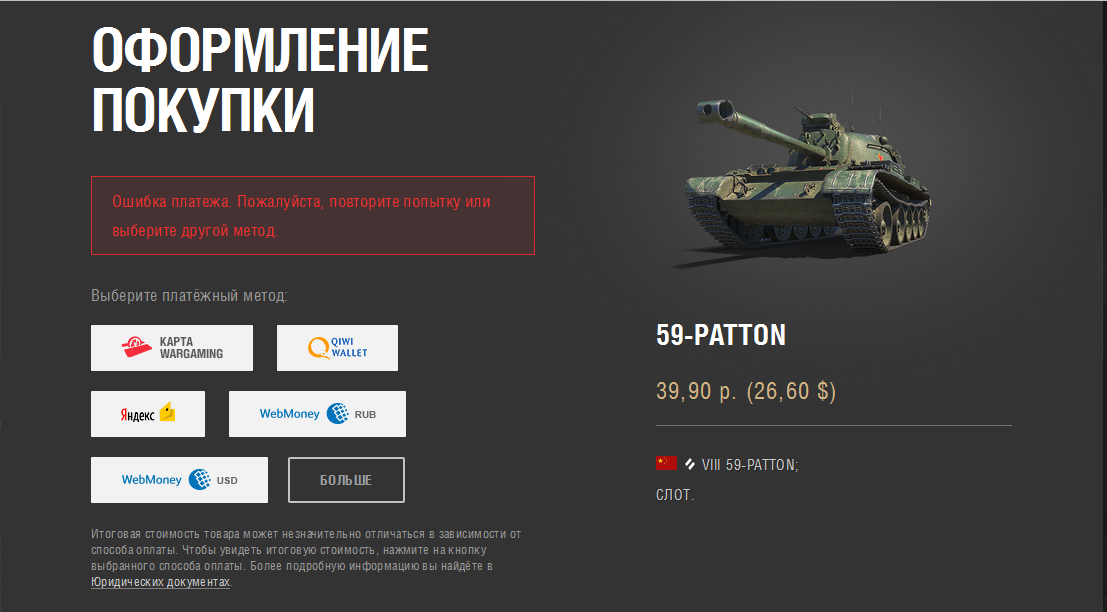Заинтересовался страшненьким 59-Patton, его ввели в продажу на недельку, предварительно апнув, о чём ютюберские зазывалы давно спели ну и всё такое. Захожу значит на сайт, в преммагазин, нахожу танк, выбираю способ оплаты visa, ввожу номер карты, срок действия карты, код, нажимаю кнопку оплаты и вижу то что на картинке. http://cdn-frm-eu.wargaming.net/wot/ru/uploads/monthly_11_2016/post-2201323-0-02071300-1478108611_thumb.png Вот расскажите мне, глядя на эту картинку, в чём проблема? Почему у меня внезапно перестало принимать платежи с этой карты? Вот прошлые принимало, а теперь не принимает.Дам подсказку - всего три недели прошло с прошлого успешного платежа. При этом с картой никаких манипуляций не проводилось, срок действия не закончился, деньги на ней есть. Всё проверил и перепроверил, три раза попробовал. Потратил целый час времени и кучу нервов. И уже хотел было отказаться от этой затеи. Хотел забить и не покупать. Но потом опять передумал и решил доделать начатое. Но это я. А сколько людей решили забить окончательно, сколько их ещё забьёт? Ну если у разработчиков нет сил разгадывать эту сложную загадку я решил припрятать ответ, но лучше, всё же, что бы они сами догадались. Ответ: В общем мне пришлось лезть на сайт беларусбанка, искать номер сервисной поддержки, потом звонить туда, слушать нудные "если хотите это... нажмите то..." краснея объяснять взрослому адекватному человеку - девушке свою проблему (Она же теперь по базе данных знает обо мне всё!). Потом краснея выслушивать придавливаемое ехидной улыбкой - "данный сайт, на котором вы пытаетесь оплатить кучку пикселей кровно-заработанными, не взирая на то, что они постоянно банят вам чат в игре заслуженно на целый месяц, требует 3дсекьюр". Потом лезть в интернет банкинг (и это мне ещё повезло, сразу вообще предложили идти в банк) и настраивать этот 3дсекьюр. В итоге, как выяснилось, проблема появилась из-за требования 3дсекьюр для платежа на сайте и его отсутствием на моей карточке. А почему нельзя было сделать нормальное уведомление о проблеме с платежом? Очень тяжело программным путём распознать такую ошибку? Хотя бы исходя из сути запроса к серверу, предшествующего ответу об ошибке. Или форма оплаты на сайте не является критическим и приоритетным моментом? Какой процент карточек потенциальных покупателей без 3дсекьюр? Какой процент потенциальных покупателей забьёт болт на всё это дело, завершив таким образом битву экстрасенсов? Какая релевантность вашего маркетинга с такой формой оплаты? Хотел описать эту проблему в разделе "Проблемы с оплатой", но там какой-то запутанный лабиринт из ссылок, который не содержит нужной информации, но к тому же не даёт возможности описать проблему. А в разделе "Предложения" я создавать темы не достоин. Поэтому я написал здесь. Мне в принципе всё равно, решите вы эту свою(!) проблему или нет. я хотел часик поиграться, прикупив новый танчик, но в итоге потратил 4 часа на оплату, выяснение причин, лабиринты из ссылок и описание проблемы на форуме.