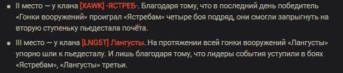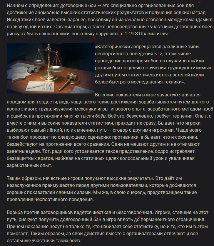 Алоха камрады! Сегодня я хочу рассказать вам небольшую историю о победителях которых как мы знаем не судят. Если вы каким то чудесным образом пропустили события последних дней, то я с радостью вам о них поведаю. Есть такой замечательный клан как P_BY. Топовый клан ру кластера почти всегда занимающий первые места на иветах или сезонах Глобальной карты. Данный клан честно занял первое место с огрооооооооооомным разрывом по очкам в последнем ивенте "Гонки вооружений", но речь пойдет немного о другом. Основная драма завертелась в последний день ивента с претендентами на второе место. Таких кланов набралось аж три штуки, лангусты, хавки, лан5сты. Всем было интересно наблюдать кто же окажется возьмет заслуженное второе место и тут бац, на сцену выходят психи. В последние несколько часов ивента на базовом фронте за минуту до конца прайма одновременно появляются заявки от психов и хавков, скрины под спойлером. Так как психов могли заподозрить в подставных боях, они начали целых три трансляции своих боев дабы отвести от себя опасения и убедить всех что бои честные и никакой подставы в них нет. Получилось ли у них? Стрим одного из них ниже под спойлером. Давайте теперь разберем что такое договорные бои. http://cdn-frm-eu.wargaming.net/wot/ru/uploads/monthly_06_2018/post-954931-0-50597500-1528769000_thumb.jpg Информация взята из официального источника. Так же Правила игры игры нам говорят 2.1.2. Договорные бои или схожие действия любого рода (за исключением тренировочных комнат). 2.1.5. Пассивное (пацифистское) поведение по отношению к участникам другой команды, клана или союза кланов. Помимо пользовательского соглашения существует регламент игрового события в котором говорится Подставные бои считаются нарушением регламента и будут наказываться полным списанием очков славы как с клана, так и с участников боя, а также блокировкой игровых аккаунтов нарушителей. При спорной ситуации по начислению очков славы (подозрение на подставной бой и т. д.) администрация игры оставляет за собой право потребовать запись боя, скриншоты и другую информацию, касающуюся этой ситуации. Если запрошенная информация не будет предоставлена, администрация примет решение по своему усмотрению. Настоятельно рекомендуем включить в настройках игры опцию «Записывать бои». Из всего прочитанного можно сделать вывод что ВГ не признает альянсы как таковые, так же он не признает что кланы могут объединяться в сообщества или целые альянсы. Но ни для кого не секрет что это далеко не так. Глобальная карта это сложная экосистема завязанная на политике, договорах и компромиссах где огромное количество кланов коммуницируют между собой чтобы добиваться определенных целей. Но на ивентах все далеко наоборот, кланы отвергают альянсы и играют на благо игроков внутри клана. Так же существуют топовые кланы которые борются между собой за престижные 1-2-3 - 50 - 100 места, все зависит от амбиций. Тут то и кроется проблема. Психи заняли свое честно заработанное первое место так как оказались сильнее и умнее других кланов, они заработали колоссальное количество очков с огромным разрывом от 2 места, но их честно заработанные очки принадлежат только им и никому более. Но нет, как же так? Нельзя забывать о своих союзниках, нужно срочно им помочь именно в последний день ивента когда ничего не угрожает получению первого места. Как нужно им помочь? 1.