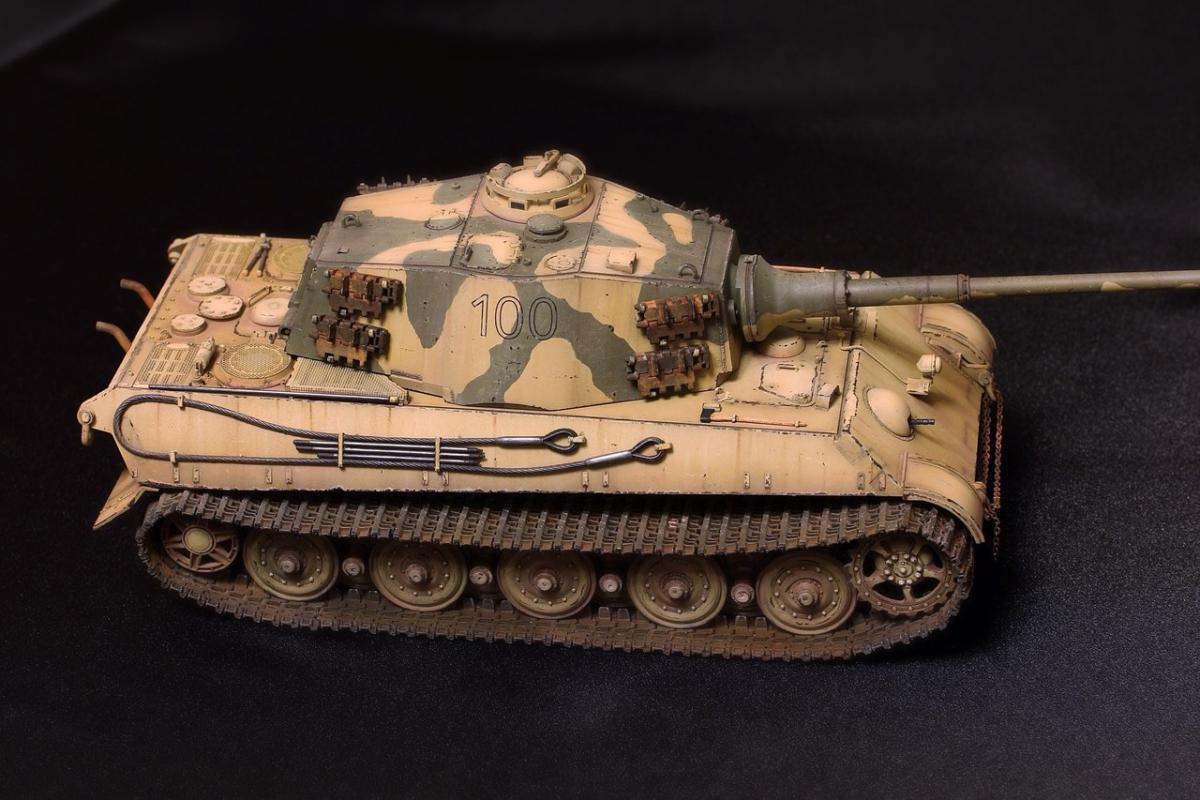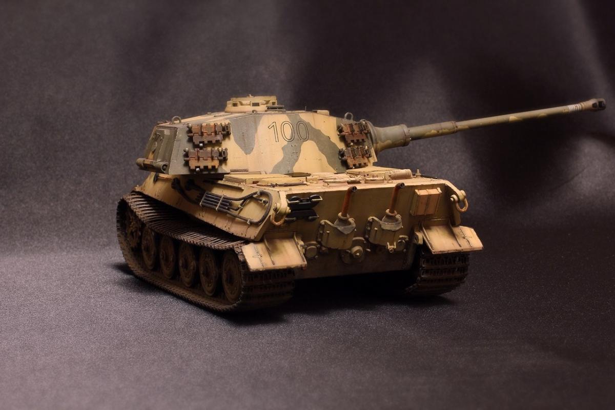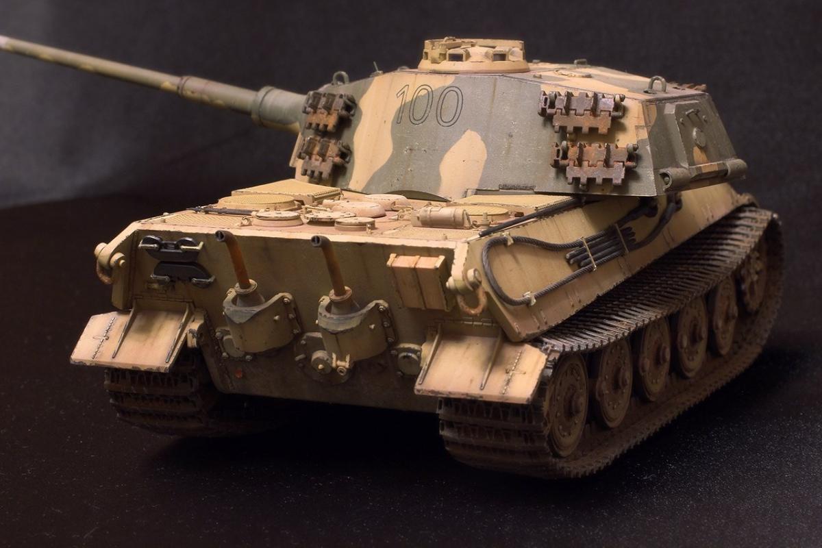 Приветствую всех товарищи моделисты! Хочу представить вашему вниманию свою крайнюю поделку - King Tiger от Академии. Модель практически из коробки. Из дополнений: добавлены местами сварные швы на корпусе и башне, заменен китовый козырек на пивжесть, проводка к фаре из проволоки, транспортные траки заменены на боевые от Hobby Boss, на башне оставил транспортные, поскольку на обе гусеницы ушло все впритык, триплексы из DVD, мушка на башне - гитарная струна, она же и в глушителях в виде перегородок, номер 100 на башне - сухие декали от Wilder. Всем приятного просмотра!
