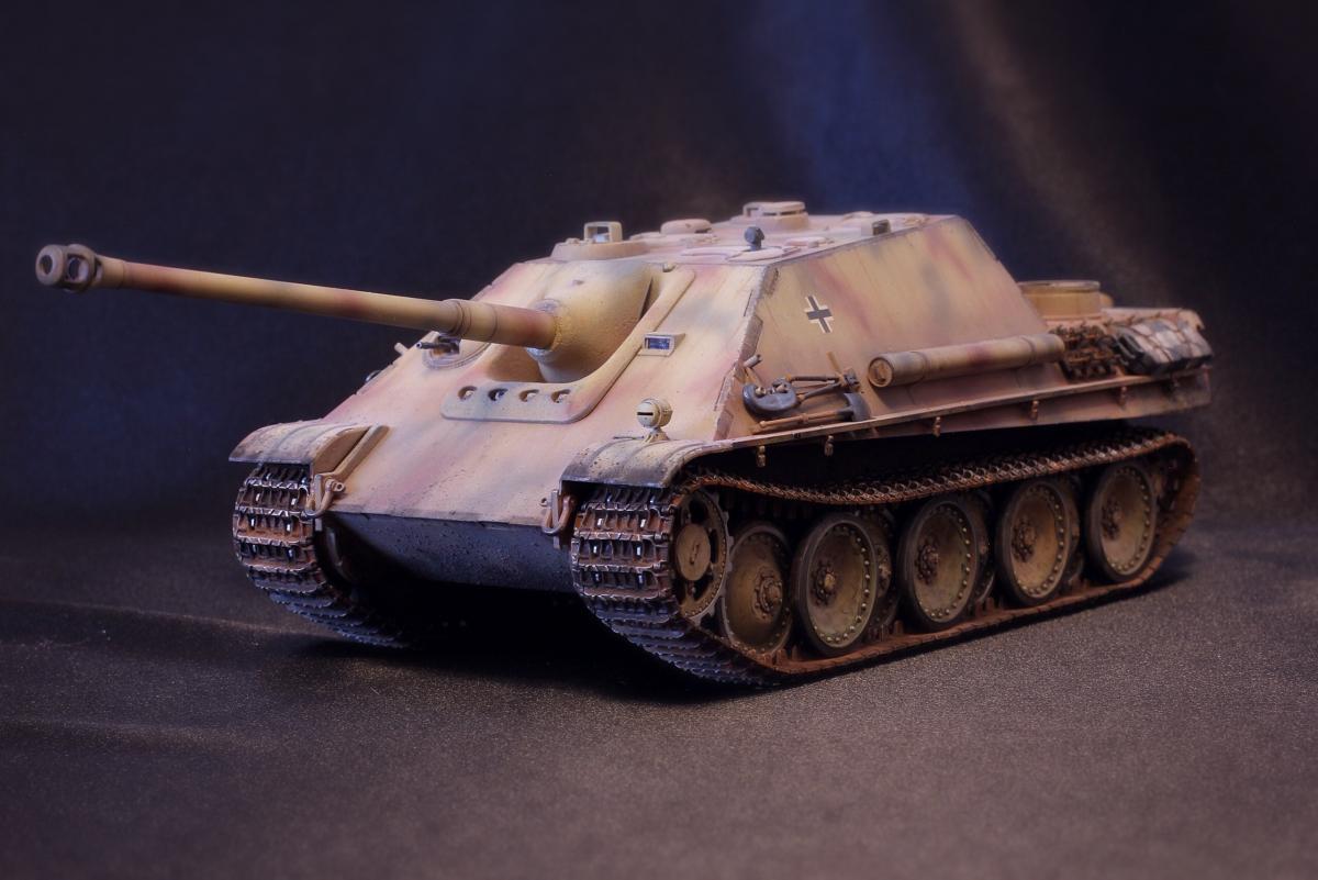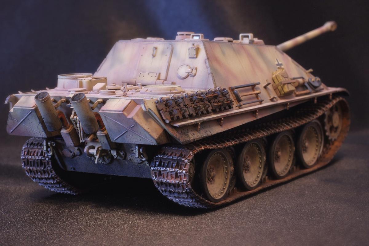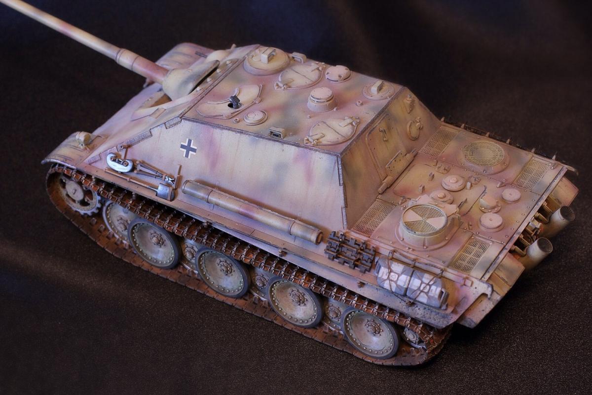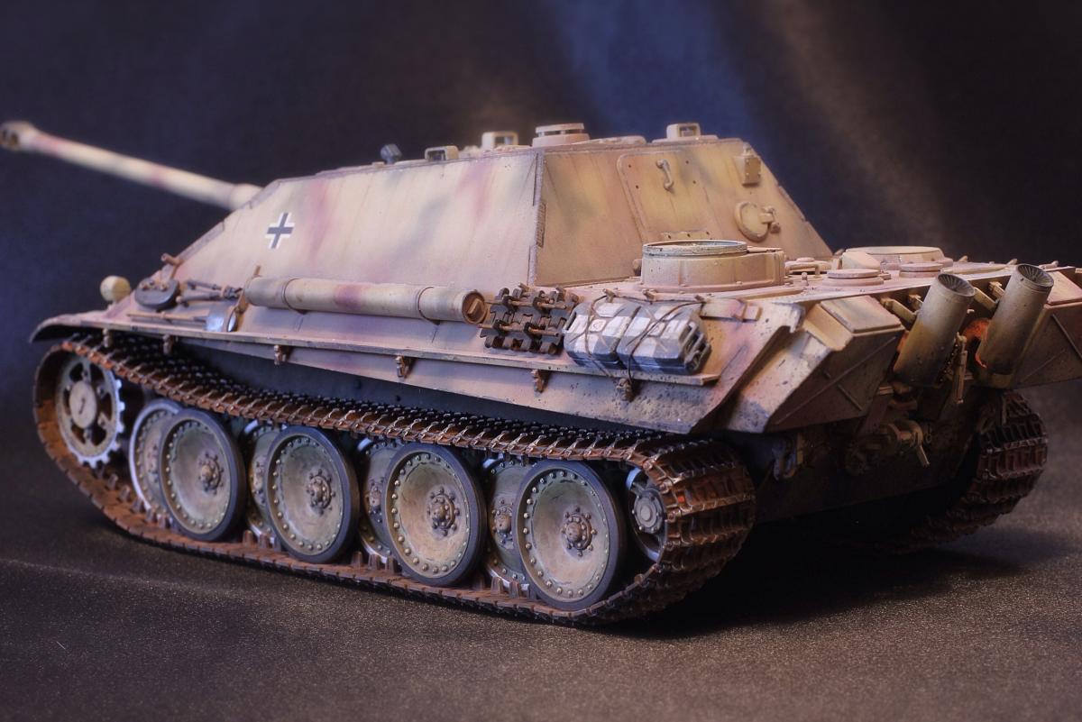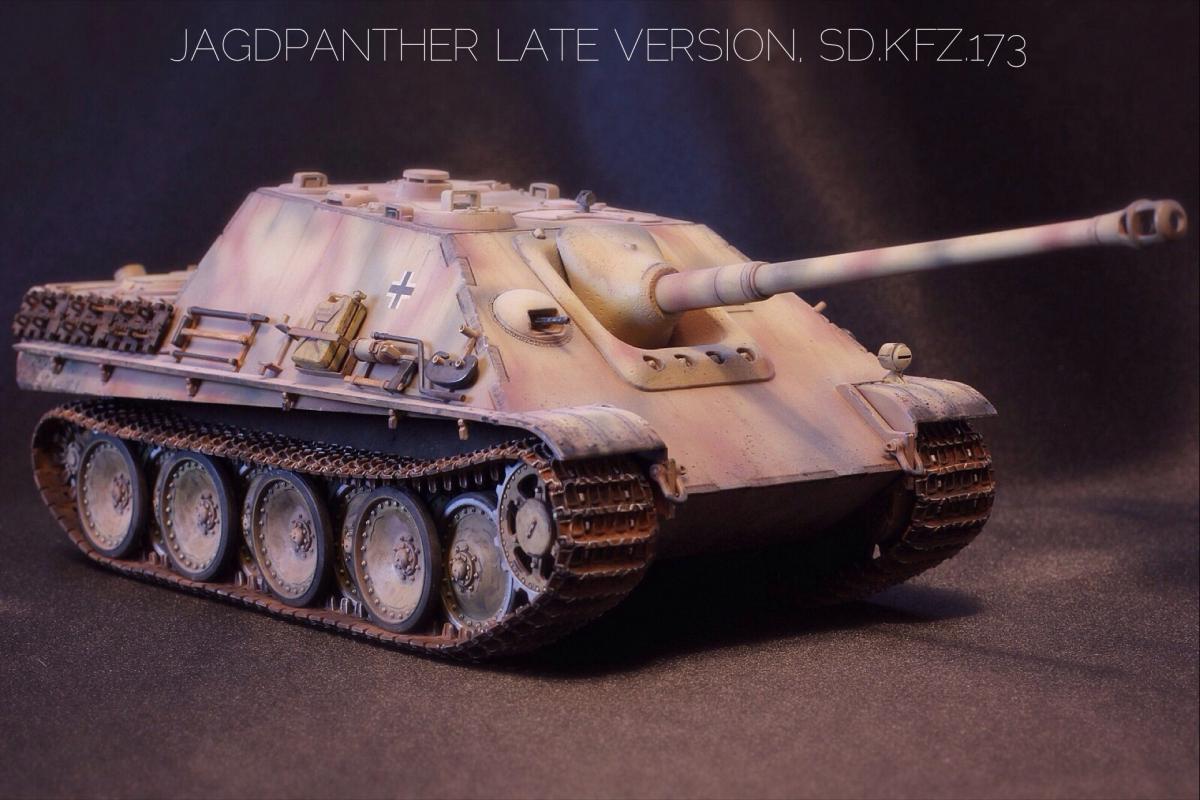 Приветствую всех, товарищи моделисты! Выставляю на суд свою последнюю модель Jagdpanther от Tamiya. Образ собирательный, прототипа нет, мое, так скажем, видение этой машины. Краски - акрил Mr. Hobby, масло и все что с ним связано - "Сонет", пигменты - "Мастер пигмент" и пастельные мелки не помню от какой фирмы. В качестве дополнений были установлены сетки на МТО от Aber, держатель под чурбак из жестянки, три смоляные канистры, проводка к фаре, триплексы из DVD. По матчасти прошу сильно не критиковать, косяки и сам в принципе знаю, в целом модель практически изкоробочная с упором на художественную составляющую. Приятного просмотра!