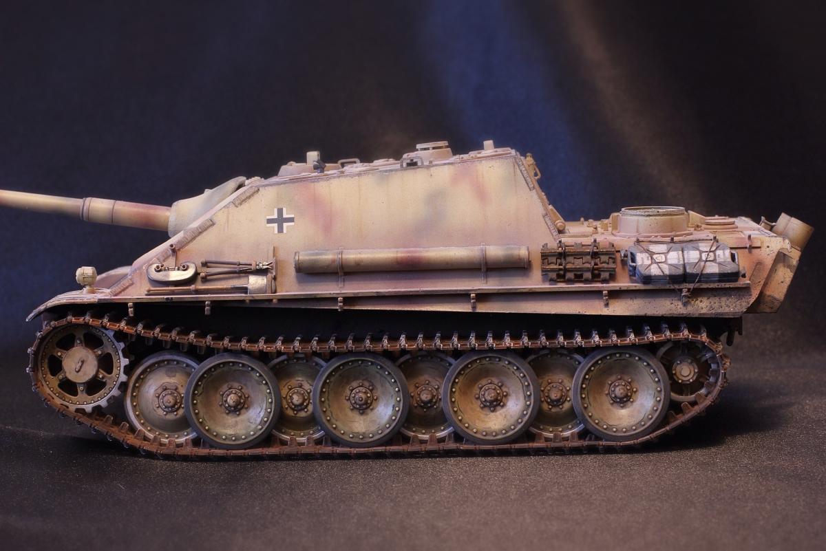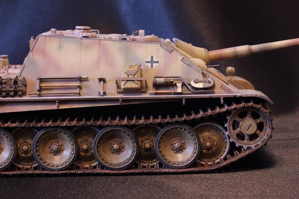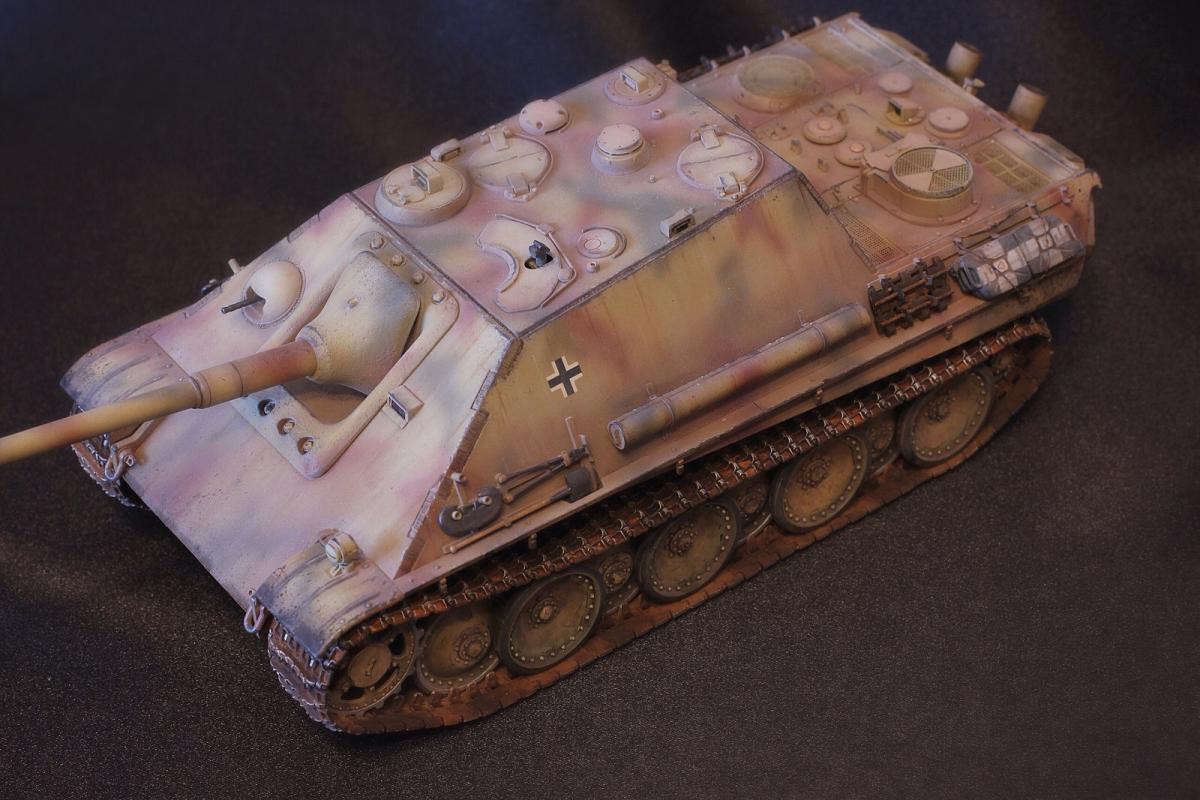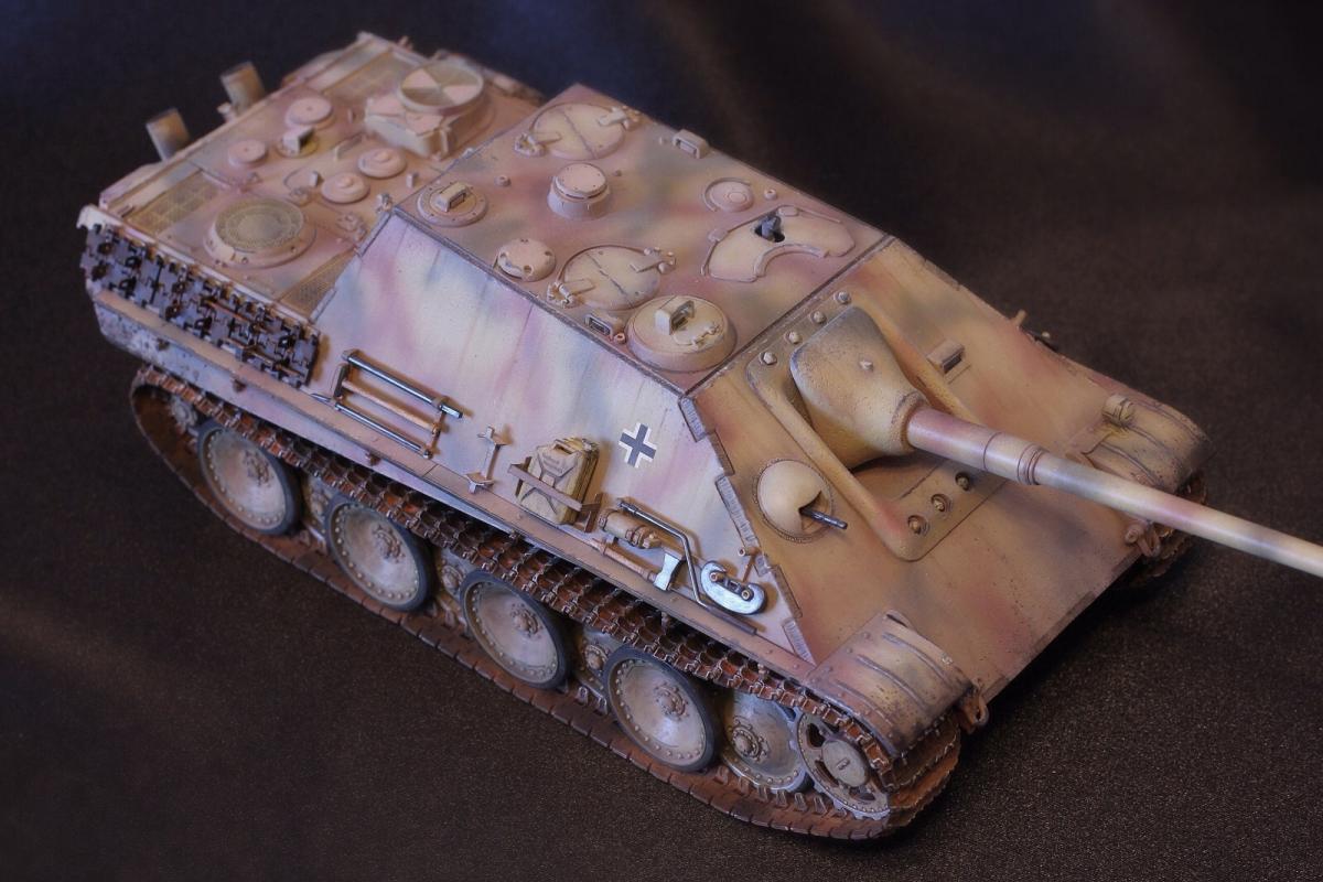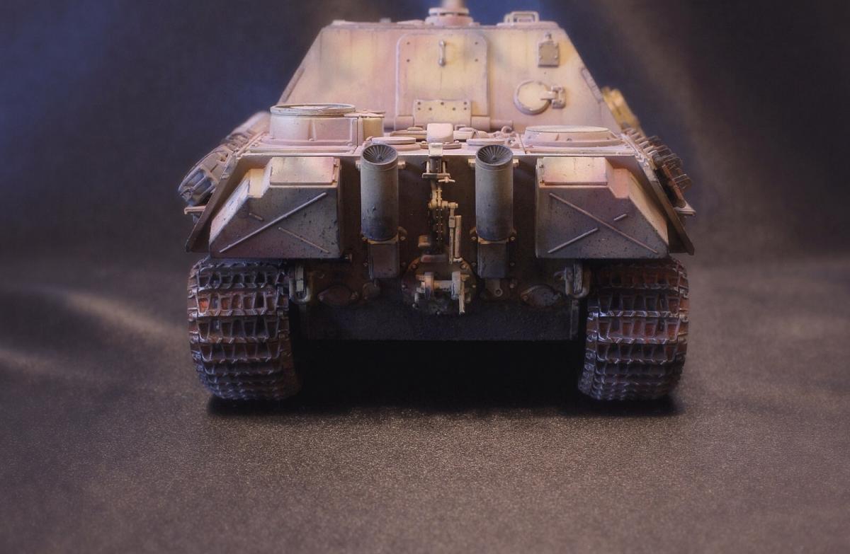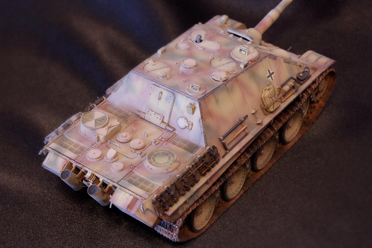 Приветствую всех, товарищи моделисты! Выставляю на суд свою последнюю модель Jagdpanther от Tamiya. Образ собирательный, прототипа нет, мое, так скажем, видение этой машины. Краски - акрил Mr. Hobby, масло и все что с ним связано - "Сонет", пигменты - "Мастер пигмент" и пастельные мелки не помню от какой фирмы. В качестве дополнений были установлены сетки на МТО от Aber, держатель под чурбак из жестянки, три смоляные канистры, проводка к фаре, триплексы из DVD. По матчасти прошу сильно не критиковать, косяки и сам в принципе знаю, в целом модель практически изкоробочная с упором на художественную составляющую. Приятного просмотра!