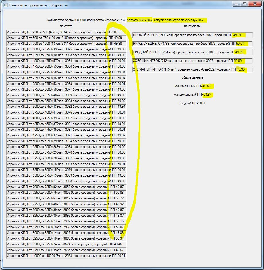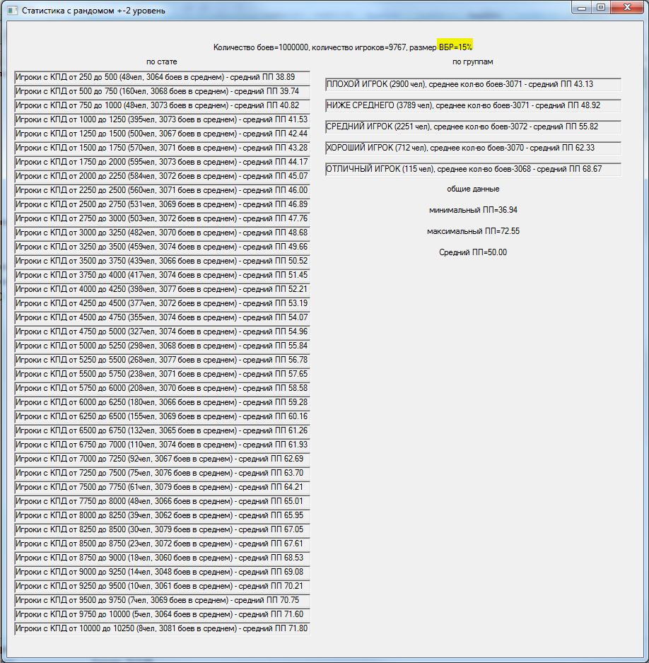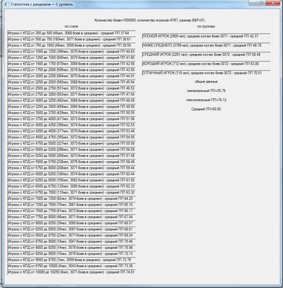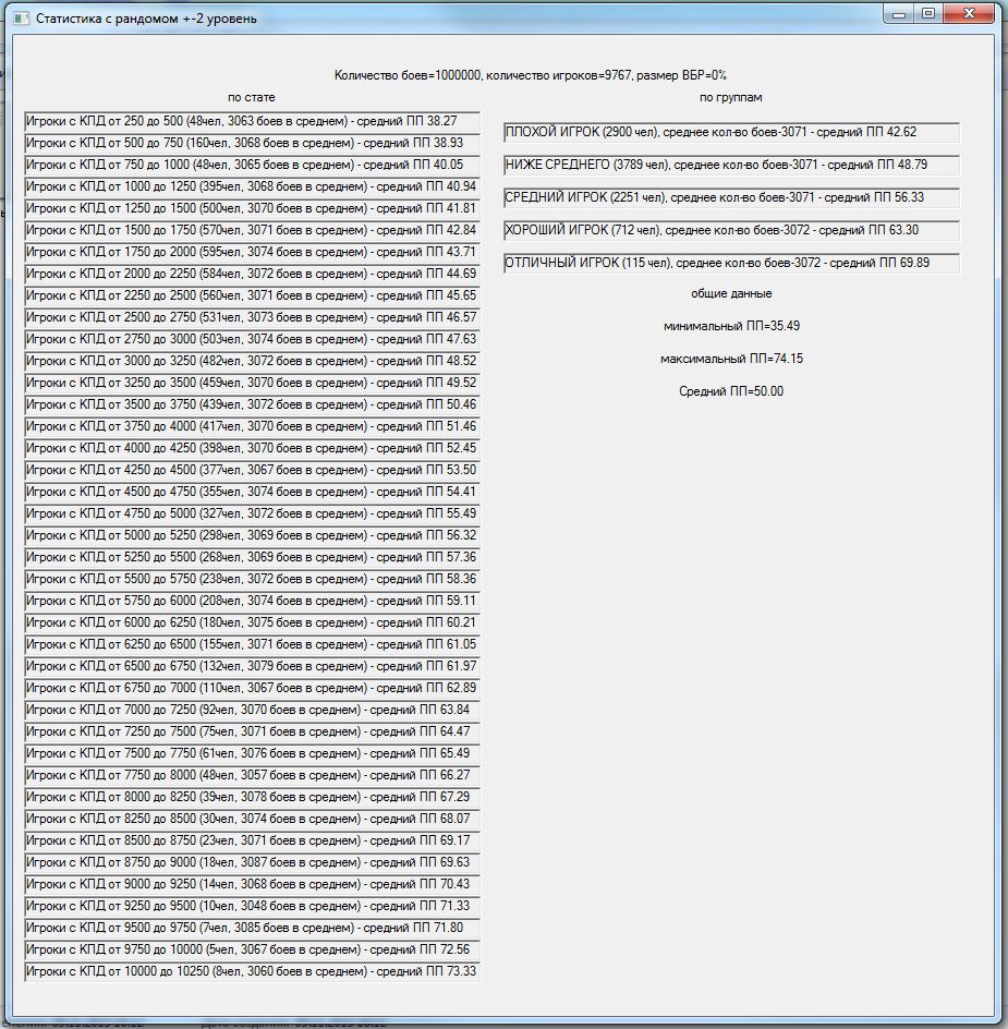 Давно зрела мысль проверить результат изменения +-2 уровня танков в команде на +-1. На словах многие товарищи поясняли итог, но циферки как-то приятнее. В результате накатал программку, идеи частично взяты из моделей mindgamer`а и StranikS_Scan`а,которая моделирует n боев.http://cdn-frm-eu.wargaming.net/wot/ru/uploads/monthly_11_2015/post-15309216-0-06467300-1447099094_thumb.jpg С сайта http://wotraw.ru/ru/accounts/summary.html взял статистику КПД по серверу, в соответствии с ней распределил игроков по скиллу. Какие были сделаны упрощения: использовалась только техника 5-10 уровней для каждого уровня техники единый балансный вес, взят из среднего значения балансных весов по технике одного уровня. Игроки в команды набирались рандомно, парой для разных команд и садились на одинаковый танк, для избавления от заморочек с подгонкой суммарного балансного веса команд. Танк выбирался рандомно от уровня боя в указанном диапазоне уровней .http://cdn-frm-eu.wargaming.net/wot/ru/uploads/monthly_11_2015/post-15309216-0-02906600-1447099112_thumb.jpgПобеда определялась исходя из преимущества по суммарному условному скиллу команды. Скилл команды – сумма произведений (КПД игрока * (балансный вес его техники /суммарный балансный вес техники команды))В процессе добавил элемент рандомности – если скиллы команд были примерно сопоставимы по значению, то результат боя определялся рандомно. http://cdn-frm-eu.wargaming.net/wot/ru/uploads/monthly_11_2015/post-15309216-0-71154600-1447099102_thumb.jpgИсхожу из того, что если одна команда явно скиловее другой, то она преодолеет влияние ВБРа и все равно победит. А потом для темки «Балансировщик. Предложение по балансировке по скилу. Уровень аккаунта.» добавил баланс по скиллу – игроки подбирались еще и в соответствии с КПД с определенным допуском. http://cdn-frm-eu.wargaming.net/wot/ru/uploads/monthly_11_2015/post-15309216-0-07632700-1447099376_thumb.jpg В общем, хотел посмотреть изменение уровней, а в процессе проверил чуть ли не все стандартные поводы для требований «перемен или ни копейки». В частности: Первое же, это тыщу раз понятное, но все же – ПП распределился в соответствии с распределением КПД игроков.http://cdn-frm-eu.wargaming.net/wot/ru/uploads/monthly_11_2015/post-15309216-0-10501800-1447099139_thumb.jpg Игроки распределялись по группам по возрастанию скилла. Но если я задавал мало боев, то иногда ПП игроков какой-либо группы был выше ПП более скиловых игроков. Т.е. рабочая модель на малых отрезках тоже проявляет заговор!http://cdn-frm-eu.wargaming.net/wot/ru/uploads/monthly_11_2015/post-15309216-0-94062100-1447099180_thumb.jpghttp://cdn-frm-eu.wargaming.net/wot/ru/uploads/monthly_11_2015/post-15309216-0-64845800-1447099187_thumb.jpg Внесенный элемент рандомности автоматически сдвигал результаты групп к среднему значению. Причем, чем больший параметр я задавал – тем больше результаты сдвигались к среднему. Т.е. не в первый раз озвучено, но все-таки: ВБР помогает 49- и вредит 51+. Товарищ RenTGen_X верно подметил, что КПД игрока и так получен с учетом ВБРа, карт, топ/сток и т.п, но поиграться исходными данными перед симуляцией все равно было интересно. http://cdn-frm-eu.wargaming.net/wot/ru/uploads/monthly_11_2015/post-15309216-0-42748000-1447099145_thumb.jpghttp://cdn-frm-eu.wargaming.net/wot/ru/uploads/monthly_11_2015/post-15309216-0-59365300-1447099168_thumb.jpg Изменение разброса уровней в команде дает эффект, сходный с ВБРом – чем больше разброс уровней, тем больше усредняются результаты. Правда надо признать, что эффект намного меньше проявляется, чем от ВБРа, но сравнив +-2,+-1 и 0 – тенденция налицо.http://cdn-frm-eu.wargaming.net/wot/ru/uploads/monthly_11_2015/post-15309216-0-10501800-1447099139_thumb.jpghttp://cdn-frm-eu.wargaming.net/wot/ru/uploads/monthly_11_2015/post-15309216-0-18858700-1447099133_thumb.jpghttp://cdn-frm-eu.wargaming.net/wot/ru/uploads/monthly_11_2015/post-15309216-0-33529600-