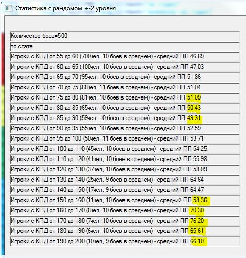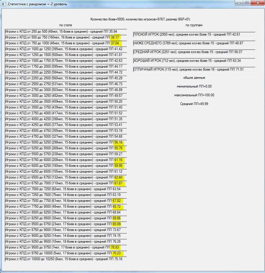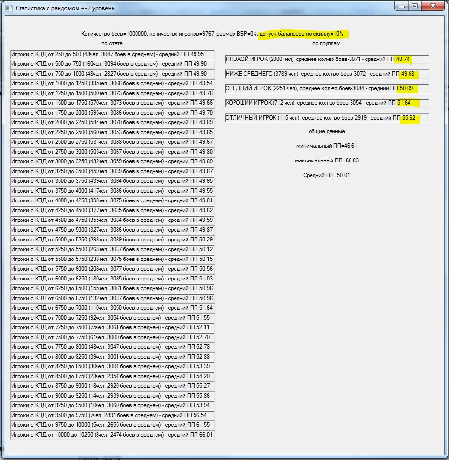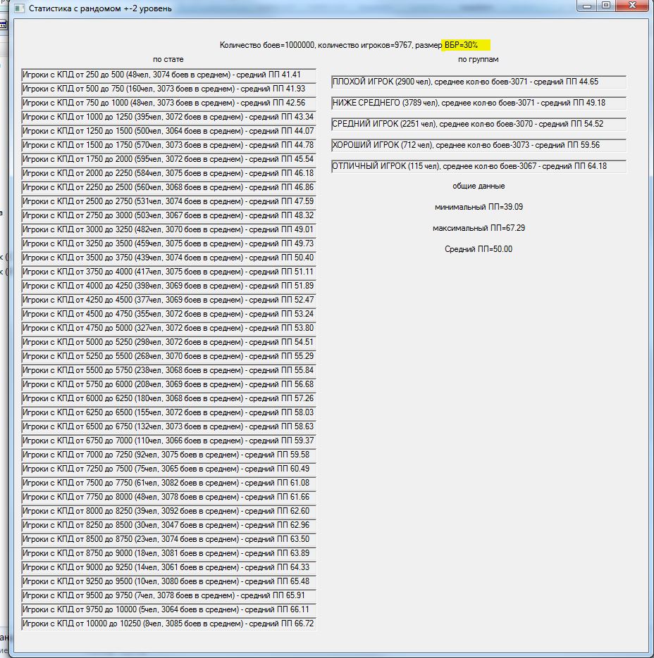 Давно зрела мысль проверить результат изменения +-2 уровня танков в команде на +-1. На словах многие товарищи поясняли итог, но циферки как-то приятнее. В результате накатал программку, идеи частично взяты из моделей mindgamer`а и StranikS_Scan`а,которая моделирует n боев.http://cdn-frm-eu.wargaming.net/wot/ru/uploads/monthly_11_2015/post-15309216-0-06467300-1447099094_thumb.jpg С сайта http://wotraw.ru/ru/accounts/summary.html взял статистику КПД по серверу, в соответствии с ней распределил игроков по скиллу. Какие были сделаны упрощения: использовалась только техника 5-10 уровней для каждого уровня техники единый балансный вес, взят из среднего значения балансных весов по технике одного уровня. Игроки в команды набирались рандомно, парой для разных команд и садились на одинаковый танк, для избавления от заморочек с подгонкой суммарного балансного веса команд. Танк выбирался рандомно от уровня боя в указанном диапазоне уровней .http://cdn-frm-eu.wargaming.net/wot/ru/uploads/monthly_11_2015/post-15309216-0-02906600-1447099112_thumb.jpgПобеда определялась исходя из преимущества по суммарному условному скиллу команды. Скилл команды – сумма произведений (КПД игрока * (балансный вес его техники /суммарный балансный вес техники команды))В процессе добавил элемент рандомности – если скиллы команд были примерно сопоставимы по значению, то результат боя определялся рандомно. http://cdn-frm-eu.wargaming.net/wot/ru/uploads/monthly_11_2015/post-15309216-0-71154600-1447099102_thumb.jpgИсхожу из того, что если одна команда явно скиловее другой, то она преодолеет влияние ВБРа и все равно победит. А потом для темки «Балансировщик. Предложение по балансировке по скилу. Уровень аккаунта.» добавил баланс по скиллу – игроки подбирались еще и в соответствии с КПД с определенным допуском. http://cdn-frm-eu.wargaming.net/wot/ru/uploads/monthly_11_2015/post-15309216-0-07632700-1447099376_thumb.jpg В общем, хотел посмотреть изменение уровней, а в процессе проверил чуть ли не все стандартные поводы для требований «перемен или ни копейки». В частности: Первое же, это тыщу раз понятное, но все же – ПП распределился в соответствии с распределением КПД игроков.http://cdn-frm-eu.wargaming.net/wot/ru/uploads/monthly_11_2015/post-15309216-0-10501800-1447099139_thumb.jpg Игроки распределялись по группам по возрастанию скилла. Но если я задавал мало боев, то иногда ПП игроков какой-либо группы был выше ПП более скиловых игроков. Т.е. рабочая модель на малых отрезках тоже проявляет заговор!http://cdn-frm-eu.wargaming.net/wot/ru/uploads/monthly_11_2015/post-15309216-0-94062100-1447099180_thumb.jpghttp://cdn-frm-eu.wargaming.net/wot/ru/uploads/monthly_11_2015/post-15309216-0-64845800-1447099187_thumb.jpg Внесенный элемент рандомности автоматически сдвигал результаты групп к среднему значению. Причем, чем больший параметр я задавал – тем больше результаты сдвигались к среднему. Т.е. не в первый раз озвучено, но все-таки: ВБР помогает 49- и вредит 51+. Товарищ RenTGen_X верно подметил, что КПД игрока и так получен с учетом ВБРа, карт, топ/сток и т.п, но поиграться исходными данными перед симуляцией все равно было интересно. http://cdn-frm-eu.wargaming.net/wot/ru/uploads/monthly_11_2015/post-15309216-0-42748000-1447099145_thumb.jpghttp://cdn-frm-eu.wargaming.net/wot/ru/uploads/monthly_11_2015/post-15309216-0-59365300-1447099168_thumb.jpg Изменение разброса уровней в команде дает эффект, сходный с ВБРом – чем больше разброс уровней, тем больше усредняются результаты. Правда надо признать, что эффект намного меньше проявляется, чем от ВБРа, но сравнив +-2,+-1 и 0 – тенденция налицо.http://cdn-frm-eu.wargaming.net/wot/ru/uploads/monthly_11_2015/post-15309216-0-10501800-1447099139_thumb.jpghttp://cdn-frm-eu.wargaming.net/wot/ru/uploads/monthly_11_2015/post-15309216-0-18858700-1447099133_thumb.jpghttp://cdn-frm-eu.wargaming.net/wot/ru/uploads/monthly_11_2015/post-15309216-0-33529600-